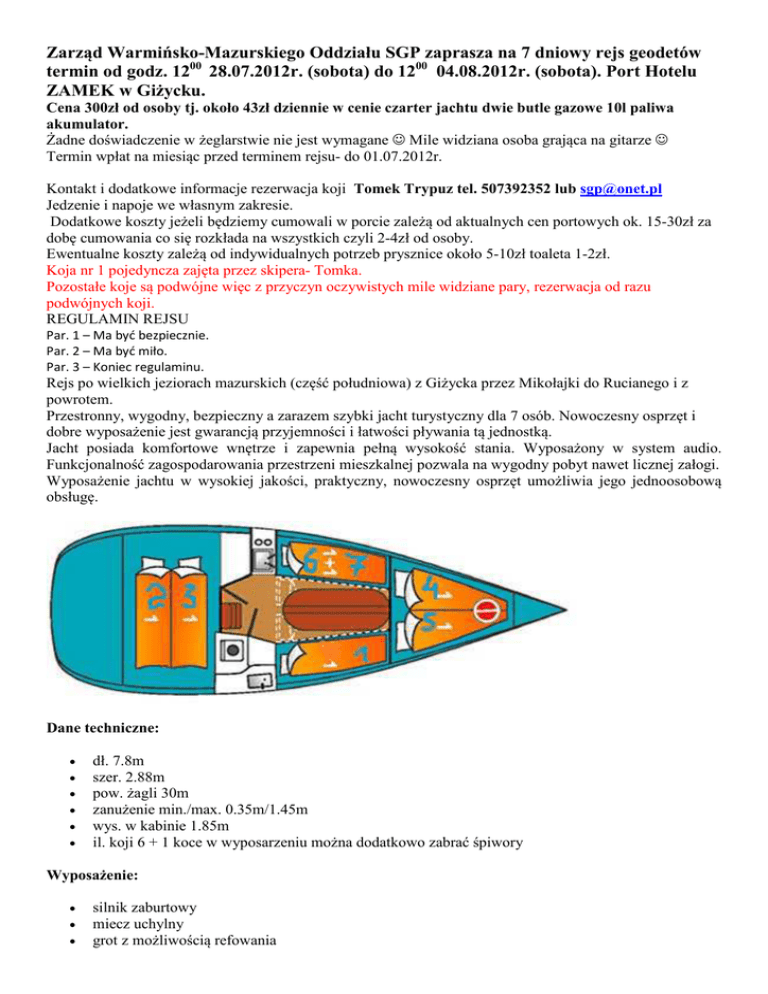 Zarząd Warmińsko-Mazurskiego Oddziału SGP zaprasza na 7 dniowy rejs geodetów termin od godz. 1200 28.07.2012r. (sobota) do 1200 04.08.2012r. (sobota). Port Hotelu ZAMEK w Giżycku. Cena 300zł od osoby tj. około 43zł dziennie w cenie czarter jachtu dwie butle gazowe 10l paliwa akumulator. Żadne doświadczenie w żeglarstwie nie jest wymagane ☺ Mile widziana osoba grająca na gitarze ☺ Termin wpłat na miesiąc przed terminem rejsu- do 01.07.2012r. Kontakt i dodatkowe informacje rezerwacja koji Tomek Trypuz tel. 507392352 lub [email protected] Jedzenie i napoje we własnym zakresie. Dodatkowe koszty jeżeli będziemy cumowali w porcie zależą od aktualnych cen portowych ok. 15-30zł za dobę cumowania co się rozkłada na wszystkich czyli 2-4zł od osoby. Ewentualne koszty zależą od indywidualnych potrzeb prysznice około 5-10zł toaleta 1-2zł. Koja nr 1 pojedyncza zajęta przez skipera- Tomka. Pozostałe koje są podwójne więc z przyczyn oczywistych mile widziane pary, rezerwacja od razu podwójnych koji. REGULAMIN REJSU Par. 1 – Ma być bezpiecznie. Par. 2 – Ma być miło. Par. 3 – Koniec regulaminu. Rejs po wielkich jeziorach mazurskich (część południowa) z Giżycka przez Mikołajki do Rucianego i z powrotem. Przestronny, wygodny, bezpieczny a zarazem szybki jacht turystyczny dla 7 osób. Nowoczesny osprzęt i dobre wyposażenie jest gwarancją przyjemności i łatwości pływania tą jednostką. Jacht posiada komfortowe wnętrze i zapewnia pełną wysokość stania. Wyposażony w system audio. Funkcjonalność zagospodarowania przestrzeni mieszkalnej pozwala na wygodny pobyt nawet licznej załogi. Wyposażenie jachtu w wysokiej jakości, praktyczny, nowoczesny osprzęt umożliwia jego jednoosobową obsługę. Dane techniczne: • • • • • • dł. 7.8m szer. 2.88m pow. żagli 30m zanużenie min./max. 0.35m/1.45m wys. w kabinie 1.85m il. koji 6 + 1 koce w wyposarzeniu można dodatkowo zabrać śpiwory Wyposażenie: • • • silnik zaburtowy miecz uchylny grot z możliwością refowania • • • • • • • • • • • • • • • • • • • Lazy Jack rolfok na sztywnym sztagu brama do stawiania i kładzenia masztu podwójny reling kaczy dziób i drabinka rufowa stolik kokpitowy ośw. elek. 12V radio / CD gniazdo 12V, prostownik pełnowymiarowe 3 podwójne koje (w tym 1 rozkładana w mesie) kambuz (kuchenka 2.palnikowa, lodówka, zlewozmywak, naczynia, talerze, sztućce, szklanki) WC chemiczne instalacja wodna w WC i kambuzie 2 szt. pagaje, bosak kotwica, cumy, 4 szt. odbijaczy, krawaty zbiornik na wodę ,2 butle gazowe, paliwo, akumulator gaśnica, saperka 7 szt. kamizelek ratunkowych + koło pełne ubezpieczenie Jacht Casco, OC, Trasa rejsu na załączonej mapie może Przykładowe zdjęcia jachtu tego typu.