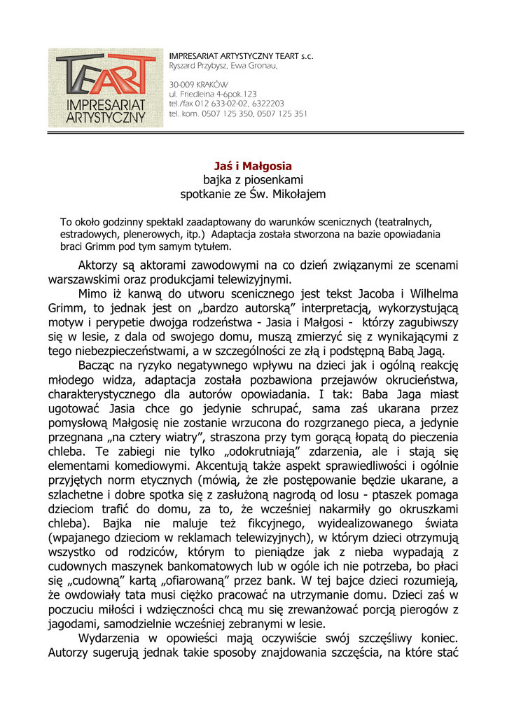 IMPRESARIAT ARTYSTYCZNY TEART s.c. Ryszard Przybysz, Ewa Gronau, 30-009 KRAKÓW ul. Friedleina 4-6pok.123 tel./fax 012 633-02-02, 6322203 tel. kom. 0507 125 350, 0507 125 351 Jaś i Małgosia bajka z piosenkami spotkanie ze Św. Mikołajem To około godzinny spektakl zaadaptowany do warunków scenicznych (teatralnych, estradowych, plenerowych, itp.) Adaptacja została stworzona na bazie opowiadania braci Grimm pod tym samym tytułem. Aktorzy są aktorami zawodowymi na co dzień związanymi ze scenami warszawskimi oraz produkcjami telewizyjnymi. Mimo iż kanwą do utworu scenicznego jest tekst Jacoba i Wilhelma Grimm, to jednak jest on „bardzo autorską” interpretacją, wykorzystującą motyw i perypetie dwojga rodzeństwa - Jasia i Małgosi - którzy zagubiwszy się w lesie, z dala od swojego domu, muszą zmierzyć się z wynikającymi z tego niebezpieczeństwami, a w szczególności ze złą i podstępną Babą Jagą. Bacząc na ryzyko negatywnego wpływu na dzieci jak i ogólną reakcję młodego widza, adaptacja została pozbawiona przejawów okrucieństwa, charakterystycznego dla autorów opowiadania. I tak: Baba Jaga miast ugotować Jasia chce go jedynie schrupać, sama zaś ukarana przez pomysłową Małgosię nie zostanie wrzucona do rozgrzanego pieca, a jedynie przegnana „na cztery wiatry”, straszona przy tym gorącą łopatą do pieczenia chleba. Te zabiegi nie tylko „odokrutniają” zdarzenia, ale i stają się elementami komediowymi. Akcentują także aspekt sprawiedliwości i ogólnie przyjętych norm etycznych (mówią, że złe postępowanie będzie ukarane, a szlachetne i dobre spotka się z zasłużoną nagrodą od losu - ptaszek pomaga dzieciom trafić do domu, za to, że wcześniej nakarmiły go okruszkami chleba). Bajka nie maluje też fikcyjnego, wyidealizowanego świata (wpajanego dzieciom w reklamach telewizyjnych), w którym dzieci otrzymują wszystko od rodziców, którym to pieniądze jak z nieba wypadają z cudownych maszynek bankomatowych lub w ogóle ich nie potrzeba, bo płaci się „cudowną” kartą „ofiarowaną” przez bank. W tej bajce dzieci rozumieją, że owdowiały tata musi ciężko pracować na utrzymanie domu. Dzieci zaś w poczuciu miłości i wdzięczności chcą mu się zrewanżować porcją pierogów z jagodami, samodzielnie wcześniej zebranymi w lesie. Wydarzenia w opowieści mają oczywiście swój szczęśliwy koniec. Autorzy sugerują jednak takie sposoby znajdowania szczęścia, na które stać jest wszystkich. Nie promują świata kształtowanego poprzez posiadanie coraz to nowszych gier komputerowych, „wypasionych” rowerów, itd. Szanse na szczęście ma tu każde dziecko. Przedstawienie zagrane jest rzetelnie, na profesjonalnym poziomie, z najwyższa starannością i zaangażowaniem. Aktorzy ciepło przyjmują żywe reakcje młodej publiczności. Nie odcinają się od świata dzieci. Starają się poniekąd nimi stać i zrozumieć tenże świat. Lekkość przedstawienia, dowcip oraz głębia przekazu sprawiają, że i towarzyszący dzieciom rodzice oglądają przedstawienie w skupieniu i z uwagą. Spektakl wzbogacony jest barwnymi kostiumami, rekwizytami oraz efektowną scenografią, która wprowadza dzieci w magiczny świat teatru. Tu bowiem, na oczach dzieci, jak za dotknięciem czarodziejskiej różdżki znajdujemy się: to na ganku domu Jasia i Małgosi, to w ciemnym lesie, a już za chwilę w chatce z piernika Baby Jagi. Blok zabaw i konkursów Po spektaklu aktorzy mogą poprowadzić zabawy i konkursy dla dzieci. Ta część to gwarantowane: „kupa śmiechu” i mnóstwo pozytywnych emocji, które towarzyszą pomysłowym i uciesznym grom i zabawom. Jest to chwila na rywalizacje sportową, prezentacje swoich talentów, a także na wspólne tańce i zabawy. Aktorzy prowadzący czują się w tym jak „ryba w wodzie”. To moment, w którym wszyscy uczestnicy zawsze pozytywnie zdają egzamin ze spontaniczności i dystansu do samego siebie. Tyczy się to również dorosłych, których nie staramy się od zabawy odseparować. Jeśli spektakl i zabawy są jednym z elementów większej imprezy istnieje możliwość łączenia całości poprzez „wejścia konferansjerskie” aktora. Przykładowy i modelowy układ imprezy (ramy czasowe zawsze do uzgodnienia w zależności od potrzeb i specyfiki imprezy) I część – przedstawienie – 1 godz. II część – zabawy – 1 do 2 godz. Osoby prowadzące: spektakl: 3 aktorów