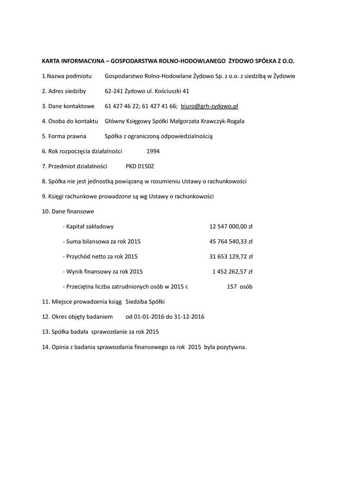 KARTA INFORMACYJNA – GOSPODARSTWA ROLNO-HODOWLANEGO ŻYDOWO SPÓŁKA Z O.O. 1.Nazwa podmiotu Gospodarstwo Rolno-Hodowlane Żydowo Sp. z o.o. z siedzibą w Żydowie 2. Adres siedziby 62-241 Żydowo ul. Kościuszki 41 3. Dane kontaktowe 61 427 46 22; 61 427 41 66; [email protected] 4. Osoba do kontaktu Główny Księgowy Spółki Małgorzata Krawczyk-Rogala 5. Forma prawna Spółka z ograniczoną odpowiedzialnością 6. Rok rozpoczęcia działalności 7. Przedmiot działalności 1994 PKD 0150Z 8. Spółka nie jest jednostką powiązaną w rozumieniu Ustawy o rachunkowości 9. Księgi rachunkowe prowadzone są wg Ustawy o rachunkowości 10. Dane finansowe - Kapitał zakładowy 12 547 000,00 zł - Suma bilansowa za rok 2015 45 764 540,33 zł - Przychód netto za rok 2015 31 653 129,72 zł - Wynik finansowy za rok 2015 - Przeciętna liczba zatrudnionych osób w 2015 r. 1 452 262,57 zł 157 osób 11. Miejsce prowadzenia ksiąg Siedziba Spółki 12. Okres objęty badaniem od 01-01-2016 do 31-12-2016 13. Spółka badała sprawozdanie za rok 2015 14. Opinia z badania sprawozdania finansowego za rok 2015 była pozytywna.