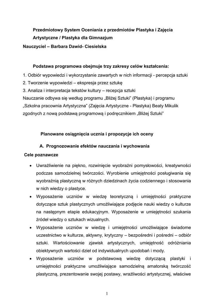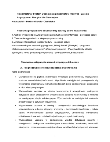 Przedmiotowy System Oceniania z przedmiotów Plastyka i Zajęcia Artystyczne / Plastyka dla Gimnazjum Nauczyciel – Barbara Dawid- Ciesielska Podstawa programowa obejmuje trzy zakresy celów kształcenia: 1. Odbiór wypowiedzi i wykorzystanie zawartych w nich informacji - percepcja sztuki 2. Tworzenie wypowiedzi – ekspresja przez sztukę 3. Analiza i interpretacja tekstów kultury – recepcja sztuki Nauczanie odbywa się według programu „Bliżej Sztuki” (Plastyka) i programu „Szkolna pracownia Artystyczna” (Zajęcia Artystyczne - Plastyka) Beaty Mikulik zgodnych z nową podstawą programową i podręcznikiem „Bliżej Sztuki” Planowane osiągnięcia ucznia i propozycje ich oceny A. Prognozowanie efektów nauczania i wychowania Cele poznawcze Uwrażliwienie na piękno, rozwinięcie wyobraźni pomysłowości, kreatywności podczas samodzielnej twórczości. Wyrobienie umiejętności posługiwania się wyobraźnią plastyczną w różnych dziedzinach życia codziennego i stosowania w nich wiedzy o plastyce. Wyposażenie uczniów w wiedzę teoretyczną i umiejętności praktyczne dotyczące sztuk plastycznych umożliwiające podjęcie nauki wiedzy o kulturze na następnym etapie edukacyjnym. Wyposażenie w umiejętności szukania źródeł wiedzy o sztukach wizualnych. Wyposażenie uczniów w wiedzę i umiejętności umożliwiające świadome uczestnictwo w kulturze, aktywny, krytyczny – bezpośredni i pośredni – odbiór sztuki. Wartościowanie zjawisk artystycznych, umiejętność odróżniania obiektywnych wartości dzieł od indywidualnych upodobań i mody. Wyposażenie uczniów w podstawową wiedzę dotyczącą plastyki i umiejętności praktyczne umożliwiające samodzielną amatorską twórczość plastyczną, prezentowanie swojej postawy, wrażliwości artystycznej, właściwe 1 spędzanie wolnego czasu ze szczególnym uwzględnieniem terapeutycznej roli sztuki, pozbywania się negatywnych emocji podczas działań plastycznych. Prezentowanie aktywnej, twórczej postawy, kreatywność. Wyposażenie uczniów w umiejętności odczytywania różnorodnych komunikatów zawartych w dziełach różnych epok oraz samodzielnego nadawania ich we własnych przedsięwzięciach. Wyposażenie uczniów w wiedzę i umiejętności praktyczne pozwalające na zauważanie różnych form plastyki w życiu codziennym, jej związków z innymi dziedzinami i związane z tym świadome kształtowanie najbliższego oraz dalszego otoczenia poprzez dążenie do osiągnięcia w nim piękna i harmonii. Umiejętność stosowania wiedzy o plastyce w innych dziedzinach życia. Wyposażenie uczniów zdolnych w wiedzę o sztuce i praktyczne umiejętności plastyczne pozwalające na podjęcie nauki w szkołach, klasach o profilu plastycznym i artystycznym poprzez podejmowanie dodatkowych działań edukacyjnych w ramach konsultacji lub zajęć pozalekcyjnych.. Cele wychowawcze Poznanie kultury i tradycji narodowej i regionu. Wzbudzanie poczucie odpowiedzialności za ich trwanie Wykształcenie umiejętności oceny artystycznego dorobku własnej ojczyzny na tle dorobku europejskiego Wykształcenie potrzeby uczestnictwa w kulturze Wykształcenie tolerancji i uznania dla wielości kultur i różnych postaw twórczych Uwrażliwienie na estetykę najbliższego otoczenia B. Obszary aktywności ucznia podlegające ocenie – stopień przyswojenia wiedzy z historii i teorii sztuki, – umiejętność formułowania przez uczniów wypowiedzi werbalnej, analizy dzieł, oceny własnej twórczości, a także zawartego w nich przekazu kulturowego, – praktyczna aktywność twórcza, podejmowanie artystycznej, 2 samodzielnej działalności kreatywność, umiejętność świadomego stosowania poznanych środków wyrazu – motywacja uczniów do pracy rozumianej jako wypadkowa ich zaangażowania, naturalnych zdolności oraz systematyczności i obowiązkowości w realizacji zadań – aktywny udział w konkursach przedmiotowych – umiejętność planowania pracy i współpracy w grupie C. Zasady oceniania Przedmiotowy system oceniania jest zgodny z wewnątrzszkolnym systemem oceniania. WSO reguluje m.in. procentowe wymagania przypisane do określonej oceny, sposób i możliwość poprawiania ocen, minimalny czas potrzebny na przygotowanie pracy o dużej objętości, tryb zapowiadania sprawdzianów. Pozostałe zasady nauczyciel ustala sam i podaje uczniom na początku semestru lub roku szkolnego akcentując, co i w jaki sposób będzie oceniane, jakie postawy i działania będą promowane, jak traktowane będą uchybienia w realizacji obowiązków. 1. Ocenianie odbywa się w ciągu całego roku szkolnego 2. Jest planowe, systematyczne i jawne 3. Uwzględnia opinię uczniów 4. Podstawą jest systematyczna obserwacja pracy i aktywności plastycznej ucznia na lekcji 5. Oceny cząstkowe uczeń otrzymuje w ciągu semestru za: prace sprawdzające wiadomości teoretyczne - klasówki (4) - kartkówki (2) - odpowiedzi ustne (1-2) krótkoterminowe prace twórcze indywidualne i grupowe (1) długoterminowe prace twórcze indywidualne lub grupowe (2) projekty edukacyjne indywidualne i grupowe (3) pracę na lekcji (1) prowadzenie zeszytu przedmiotowego (1) 3 pracę domową krótkoterminową (w tym przygotowanie do lekcji) (1) kreatywność traktowaną jako niestandardowe oryginalne rozwiązanie zadania praktycznego lub teoretycznego (2) wybitne osiągnięcia – osiągnięcia w konkursach przedmiotowych (4) praca dodatkowa (+) aktywność artystyczna pozaszkolna monitorowana przez nauczyciela. Trzy plusy sumowane są oceną bardzo dobrą lub celującą o wadze (1) 6. Skala ocen cząstkowych, okresowych i końcoworocznych podana jest w WSO 7. Ocena okresowa i końcoworoczna jest średnią ważoną. Zasady wyliczania podane są w WSO 8. Przy ocenie prac praktycznych brane są pod uwagę: - spełnienie założeń ćwiczenia - estetyka wykonania - oryginalność - współpraca podczas korekt 9. Prace domowe i dodatkowe mogą mieć formę