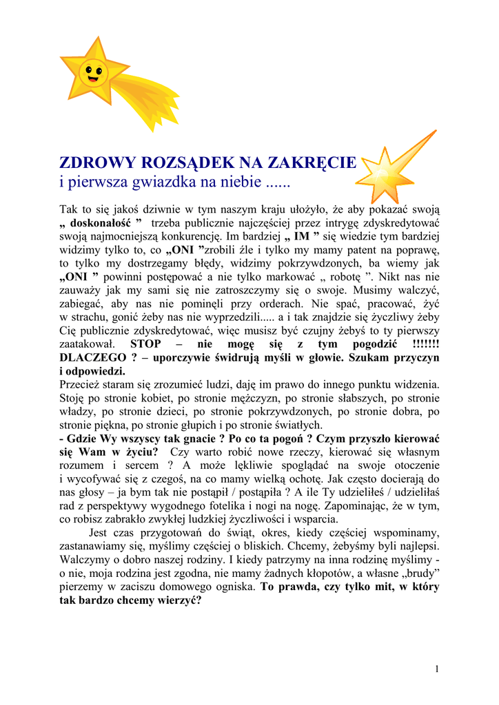 ZDROWY ROZSĄDEK NA ZAKRĘCIE i pierwsza gwiazdka na niebie ...... Tak to się jakoś dziwnie w tym naszym kraju ułoŜyło, Ŝe aby pokazać swoją „ doskonałość ” trzeba publicznie najczęściej przez intrygę zdyskredytować swoją najmocniejszą konkurencję. Im bardziej „ IM ” się wiedzie tym bardziej widzimy tylko to, co „ONI ”zrobili źle i tylko my mamy patent na poprawę, to tylko my dostrzegamy błędy, widzimy pokrzywdzonych, ba wiemy jak „ONI ” powinni postępować a nie tylko markować „ robotę ”. Nikt nas nie zauwaŜy jak my sami się nie zatroszczymy się o swoje. Musimy walczyć, zabiegać, aby nas nie pominęli przy orderach. Nie spać, pracować, Ŝyć w strachu, gonić Ŝeby nas nie wyprzedzili..... a i tak znajdzie się Ŝyczliwy Ŝeby Cię publicznie zdyskredytować, więc musisz być czujny Ŝebyś to ty pierwszy zaatakował. STOP – nie mogę się z tym pogodzić !!!!!!! DLACZEGO ? – uporczywie świdrują myśli w głowie. Szukam przyczyn i odpowiedzi. PrzecieŜ staram się zrozumieć ludzi, daję im prawo do innego punktu widzenia. Stoję po stronie kobiet, po stronie męŜczyzn, po stronie słabszych, po stronie władzy, po stronie dzieci, po stronie pokrzywdzonych, po stronie dobra, po stronie piękna, po stronie głupich i po stronie światłych. - Gdzie Wy wszyscy tak gnacie ? Po co ta pogoń ? Czym przyszło kierować się Wam w Ŝyciu? Czy warto robić nowe rzeczy, kierować się własnym rozumem i sercem ? A moŜe lękliwie spoglądać na swoje otoczenie i wycofywać się z czegoś, na co mamy wielką ochotę. Jak często docierają do nas głosy – ja bym tak nie postąpił / postąpiła ? A ile Ty udzieliłeś / udzieliłaś rad z perspektywy wygodnego fotelika i nogi na nogę. Zapominając, Ŝe w tym, co robisz zabrakło zwykłej ludzkiej Ŝyczliwości i wsparcia. Jest czas przygotowań do świąt, okres, kiedy częściej wspominamy, zastanawiamy się, myślimy częściej o bliskich. Chcemy, Ŝebyśmy byli najlepsi. Walczymy o dobro naszej rodziny. I kiedy patrzymy na inna rodzinę myślimy o nie, moja rodzina jest zgodna, nie mamy Ŝadnych kłopotów, a własne „brudy” pierzemy w zaciszu domowego ogniska. To prawda, czy tylko mit, w który tak bardzo chcemy wierzyć? 1 Rozpiera nas duma, Ŝe w naszej rodzinie obowiązuje solidarność, wszyscy się lubią i wspierają w trudnych chwilach..... inne rodziny to, co innego. W naszej rodzinie wspólnie nie rozmawiamy o kłopotach, nie pokazujemy słabości, bo to pierwszy krok do konfliktów. Dlaczego? – prawdopodobnie z rodzinnych mitów o jej funkcjonowaniu. Skąd się biorą owe mity? – źródłem ich powstania są opowieści rodzinne przekazywane z pokolenia na pokolenie. Na przykład DOBRA RODZINA TO ZGODNA RODZINA. W taki oto sposób powstaje mit harmonii, ale w Ŝyciu tak jak w zabawie w głuchy telefon przez lata powstaje zamazany, zniekształcony obraz pomagania, wspierania. Zostaje tylko mit, Ŝe moja rodzina musi być zgodna. To, co dzieje się w Twojej rodzinie podczas Twojego procesu wychowania, wpływa na Twoje poglądy, co do wiary, nadziei, miłości, ufności i zaufania. Święta to czas rodzinnych opowieści i anegdot. Okazja do zapytania bliskich o ich przeŜycia. Dzięki nim moŜemy odkryć, czy w rodzinie są mity, które kierują naszym Ŝyciem i zastanowić się, czy są warte przekazywania następnym pokoleniom. Ojciec, ani nikt z członków Twojej rodziny nie moŜe być winny za całe zło w rodzinie. A córka czy syn odpowiadać za szczęście wszystkich. „Zła owca”, niewykorzystane szanse to tylko fałszywe mity. Kiedy juŜ ODKRYJESZ rodzinny mit trudno go zmienić czy odrzucić, ale zawsze moŜesz zahamować przenoszenie go z pokolenia na pokolenie. Nauczyć rodzinę rozmawiać o problemach. Zaakceptować, ze będą się pojawiały i znikały w nieoczekiwanym przez Was czasie, ze taka jest kolej rzeczy, a siła rodziny tkwi w okazywaniu wsparcia mimo wszystko i bezinteresownie. Gdy na niebie zaświeci pierwsza gwiazdka, świat wydaje się lepszy. Na znaczeniu zyskują wiara, nadzieja, miłość i inne cnoty..... A gdyby tak w zgodzie z nimi przeŜyć cały rok ? Warto, bo one wprowadzają harmonię w Ŝycie i dodają mu blasku. Czego sobie i Państwu Ŝyczę. Wanda Chomacka 2