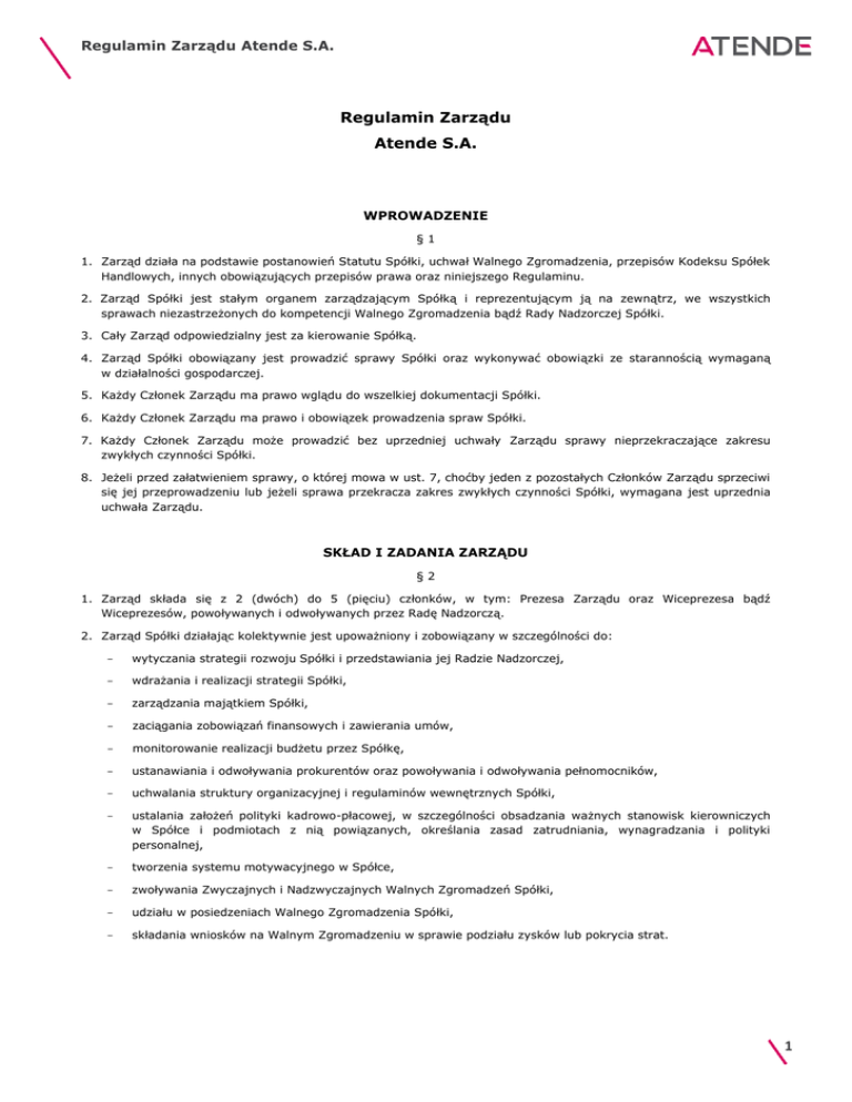 Regulamin Zarządu Atende S.A. Regulamin Zarządu Atende S.A. WPROWADZENIE §1 1. Zarząd działa na podstawie postanowień Statutu Spółki, uchwał Walnego Zgromadzenia, przepisów Kodeksu Spółek Handlowych, innych obowiązujących przepisów prawa oraz niniejszego Regulaminu. 2. Zarząd Spółki jest stałym organem zarządzającym Spółką i reprezentującym ją na zewnątrz, we wszystkich sprawach niezastrzeżonych do kompetencji Walnego Zgromadzenia bądź Rady Nadzorczej Spółki. 3. Cały Zarząd odpowiedzialny jest za kierowanie Spółką. 4. Zarząd Spółki obowiązany jest prowadzić sprawy Spółki oraz wykonywać obowiązki ze starannością wymaganą w działalności gospodarczej. 5. Każdy Członek Zarządu ma prawo wglądu do wszelkiej dokumentacji Spółki. 6. Każdy Członek Zarządu ma prawo i obowiązek prowadzenia spraw Spółki. 7. Każdy Członek Zarządu może prowadzić bez uprzedniej uchwały Zarządu sprawy nieprzekraczające zakresu zwykłych czynności Spółki. 8. Jeżeli przed załatwieniem sprawy, o której mowa w ust. 7, choćby jeden z pozostałych Członków Zarządu sprzeciwi się jej przeprowadzeniu lub jeżeli sprawa przekracza zakres zwykłych czynności Spółki, wymagana jest uprzednia uchwała Zarządu. SKŁAD I ZADANIA ZARZĄDU §2 1. Zarząd składa się z 2 (dwóch) do 5 (pięciu) członków, w tym: Prezesa Zarządu oraz Wiceprezesa bądź Wiceprezesów, powoływanych i odwoływanych przez Radę Nadzorczą. 2. Zarząd Spółki działając kolektywnie jest upoważniony i zobowiązany w szczególności do: wytyczania strategii rozwoju Spółki i przedstawiania jej Radzie Nadzorczej, wdrażania i realizacji strategii Spółki, zarządzania majątkiem Spółki, zaciągania zobowiązań finansowych i zawierania umów, monitorowanie realizacji budżetu przez Spółkę, ustanawiania i odwoływania prokurentów oraz powoływania i odwoływania pełnomocników, uchwalania struktury organizacyjnej i regulaminów wewnętrznych Spółki, ustalania założeń polityki kadrowo-płacowej, w szczególności obsadzania ważnych stanowisk kierowniczych w Spółce i podmiotach z nią powiązanych, określania zasad zatrudniania, wynagradzania i polityki personalnej, tworzenia systemu motywacyjnego w Spółce, zwoływania Zwyczajnych i Nadzwyczajnych Walnych Zgromadzeń Spółki, udziału w posiedzeniach Walnego Zgromadzenia Spółki, składania wniosków na Walnym Zgromadzeniu w sprawie podziału zysków lub pokrycia strat. 1 Regulamin Zarządu Atende S.A. 3. Członkowie Zarządu będą w sposób szczególny odpowiedzialni za przydzielone im, na mocy poniższych zapisów, obszary działalności Zarządu: a) b) c) d) Do zakresu kompetencji i odpowiedzialności Prezesa Zarządu należą: - planowanie i realizacja struktury zatrudnienia, podejmowanie decyzji w zakresie polityki kadrowej we współpracy z pozostałymi Członkami Zarządu, - nadzór nad działalnością wszystkich jednostek organizacyjnych Spółki, - opracowywanie strategii i polityki rozwoju grupy kapitałowej Spółki, - organizowanie współpracy w ramach Grupy Kapitałowej z pozycji nadzoru właścicielskiego, - ustalanie zasad działalności handlowej Spółki oraz nadzór nad ich respektowaniem, - nadzór nad relacjami Spółki z inwestorami, a w szczególności nad wykonywaniem obowiązków informacyjnych Spółki wynikających ze statusu spółki publicznej, - działania związane z wizerunkiem publicznym Spółki, a w szczególności z budowaniem wartości marek, działalnością promocyjną i marketingową Spółki, - opracowywanie strategii systemu motywacyjnego w Spółce oraz wytycznych do tego systemu – we współpracy z pozostałymi Członkami Zarządu, - współpraca z zespołem doradców Zarządu. Do zakresu kompetencji i odpowiedzialności Wiceprezesa Zarządu ds. Operacyjnych należy: - zarządzanie bieżącą działalnością Spółki w zakresie realizacji projektów i usług świadczonych przez Spółkę na rzecz klientów i projektów wewnętrznych, a w szczególności ustalanie zasad, wyznaczanie celów i nadzór nad poprawnością, jakością i efektywnością tych działań, - planowanie inwestycji związanych z działalnością operacyjną Spółki – we współpracy z pozostałymi Członkami Zarządu, - sprawowanie nadzoru nad rozwojem i utrzymaniem wewnętrznych aplikacji i systemów IT, - organizacja działań związanych z wprowadzaniem przez Spółkę norm jakości oraz uzyskiwania niezbędnych zezwoleń i certyfikatów w tym zakresie, - współpraca z zespołem doradców Zarządu. Do zakresu kompetencji i odpowiedzialności Wiceprezesa Zarządu ds. Handlowych należy: - opracowywanie planów i bieżące zarządzanie działalnością handlową Spółki, a w szczególności ustalanie zasad, wyznaczanie celów i nadzór nad poprawnością, jakością i efektywnością tych działań, - nadzór nad zarządzaniem relacjami Spółki z jej klientami i dostawcami, - planowanie i realizacja struktury zatrudnienia w Pionie Handlowym, podejmowanie decyzji w zakresie polityki kadrowej i warunków zatrudnienia bądź współpracy – w uzgodnieniu z Prezesem Zarządu, - współpraca z zespołem doradców Zarządu. Do zakresu kompetencji i odpowiedzialności Wiceprezesa Zarządu ds. Finansowych należy: - opracowywanie i monitorowanie realizacji budżetu Spółki, - nadzór nad opracowywaniem i wykonywaniem budżetu przez spółki Grupy Kapitałowej, - nadzór nad wykonywaniem obowiązków informacyjnych Spółki wynikających ze statusu spółki publicznej – w zakresie finansowym, - nadzór nad ustalaniem parametrów finansowych projektów zakwalifikowanych do tego typu nadzoru oraz nad zgodnością realizacji tych projektów z przyjętymi założeniami finansowymi, - organizacja i nadzór nad przepływem dokumentów finansowych w Spółce, - nadzór finansowy nad działalnością inwestycyjną Spółki, - organizacja kontrolingu finansowego w Spółce i nadzór nad jego 