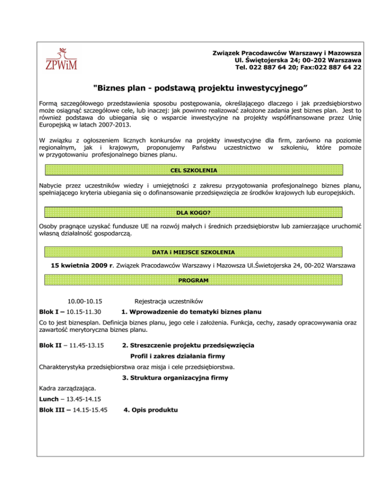 Związek Pracodawców Warszawy i Mazowsza Ul. Świętojerska 24; 00-202 Warszawa Tel. 022 887 64 20; Fax:022 887 64 22 "Biznes plan - podstawą projektu inwestycyjnego” Formą szczegółowego przedstawienia sposobu postępowania, określającego dlaczego i jak przedsiębiorstwo moŜe osiągnąć szczegółowe cele, lub inaczej: jak powinno realizować załoŜone zadania jest biznes plan. Jest to równieŜ podstawa do ubiegania się o wsparcie inwestycyjne na projekty współfinansowane przez Unię Europejską w latach 2007-2013. W związku z ogłoszeniem licznych konkursów na projekty inwestycyjne dla firm, zarówno na poziomie regionalnym, jak i krajowym, proponujemy Państwu uczestnictwo w szkoleniu, które pomoŜe w przygotowaniu profesjonalnego biznes planu. CEL SZKOLENIA Nabycie przez uczestników wiedzy i umiejętności z zakresu przygotowania profesjonalnego biznes planu, spełniającego kryteria ubiegania się o dofinansowanie przedsięwzięcia ze środków krajowych lub europejskich. DLA KOGO? Osoby pragnące uzyskać fundusze UE na rozwój małych i średnich przedsiębiorstw lub zamierzające uruchomić własną działalność gospodarczą. DATA i MIEJSCE SZKOLENIA 15 kwietnia 2009 r. Związek Pracodawców Warszawy i Mazowsza Ul.Świetojerska 24, 00-202 Warszawa PROGRAM 10.00-10.15 Blok I – 10.15-11.30 Rejestracja uczestników 1. Wprowadzenie do tematyki biznes planu Co to jest biznesplan. Definicja biznes planu, jego cele i załoŜenia. Funkcja, cechy, zasady opracowywania oraz zawartość merytoryczna biznes planu. Blok II – 11.45-13.15 2. Streszczenie projektu przedsięwzięcia Profil i zakres działania firmy Charakterystyka przedsiębiorstwa oraz misja i cele przedsiębiorstwa. 3. Struktura organizacyjna firmy Kadra zarządzająca. Lunch – 13.45-14.15 Blok III – 14.15-15.45 4. Opis produktu 5. Rynek i konkurencja Rynek. Sposoby zbudowania popytu. Klienci. Konkurencja. Przewaga konkurencyjna. Analiza SWOT. 15.30-17.00 6. Plan marketingowy Produkt. Cena. Polityka cenowa przy wprowadzaniu nowego produktu. Wybór polityki cenowe. Dystrybucja. Promocja. 7. Plan finansowy Biznesplan a typ finansowania ( kredyt, leasing ). Planowane nakłady inwestycyjne. Harmonogram rzeczowofinansowy inwestycji. Bilans. Rachunek zysków i strat. Przepływy pienięŜne (cash flow). Analiza wskaźnikowa. TRENER Beata Stępnicka - Barczyk Kilkuletnie doświadczenie zawodowe związane z funduszami UE, podbudowane studiami z zakresu funduszy unijnych, wykształceniem prawniczym, administracyjnym oraz stale rozwijane specjalistycznymi kursami i szkoleniami; KOSZT SZKOLENIA I ZGŁOSZENIA Wypełnione formularze zgłoszeniowe prosimy przesyłać na adres [email protected] lub faxem na numer (022) 887 64 22. Koszt szkolenia wynosi 450 zł. Wpłaty naleŜy dokonać najpóźniej do 13.04 br. do godziny 12.00 na numer konta: 44 1240 6074 1111 0000 4996 7935 BliŜsze informacje pod numerem telefonu: (022) 887 64 20/21. Zapraszamy gorąco do udziału