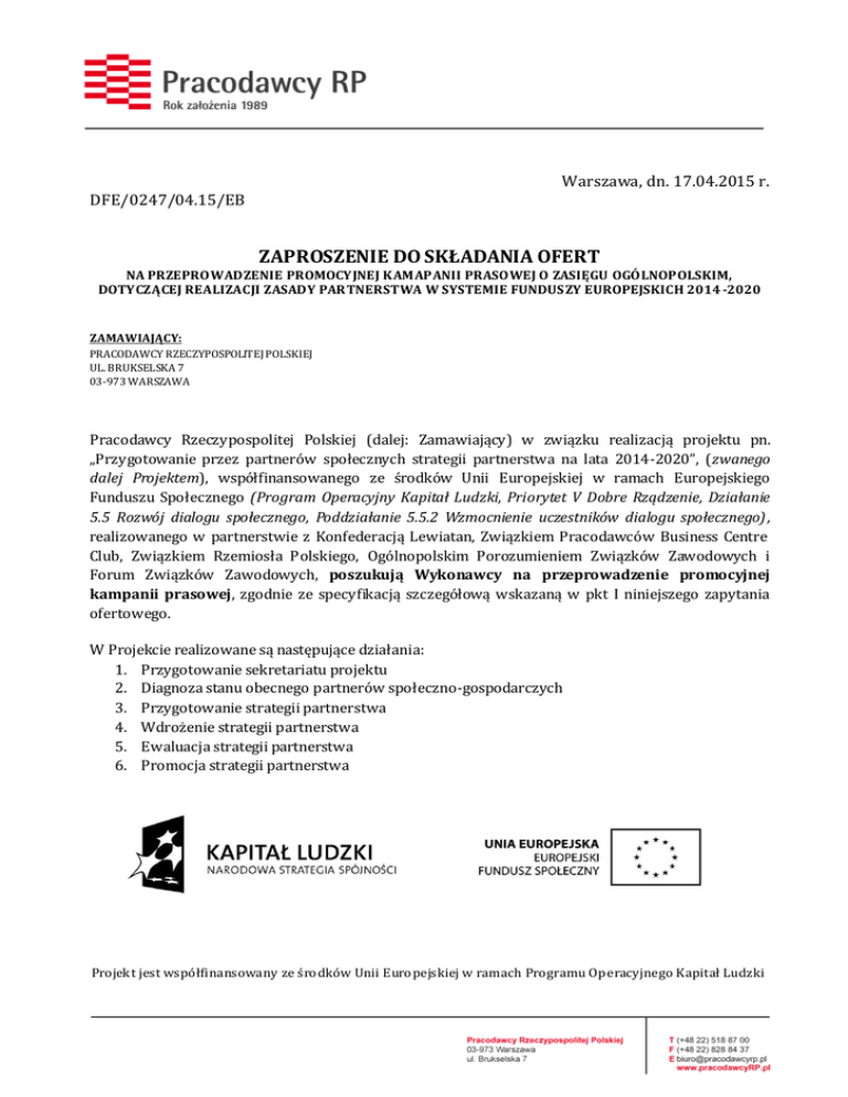 Warszawa, dn. 17.04.2015 r. DFE/0247/04.15/EB ZAPROSZENIE DO SKŁADANIA OFERT NA PRZEPROWADZENIE PROMOCYJNEJ KAMAPANII PRASOWEJ O ZASIĘGU OGÓLNOPOLSKIM, DOTYCZĄCEJ REALIZACJI ZASADY PAR TNERSTWA W SYSTEMIE FUNDUS ZY EUROPEJSKICH 2014 -2020 ZAMAWIAJĄCY: PRACODAWCY RZECZYPOSPOLITEJ POLSKIEJ UL. BRUKSELSKA 7 03-973 WARSZAWA Pracodawcy Rzeczypospolitej Polskiej (dalej: Zamawiający) w związku realizacją projektu pn. „Przygotowanie przez partnerów społecznych strategii partnerstwa na lata 2014-2020”, (zwanego dalej Projektem), współfinansowanego ze środków Unii Europejskiej w ramach Europejskiego Funduszu Społecznego (Program Operacyjny Kapitał Ludzki, Priorytet V Dobre Rządzenie, Działanie 5.5 Rozwój dialogu społecznego, Poddziałanie 5.5.2 Wzmocnienie uczestników dialogu społecznego) , realizowanego w partnerstwie z Konfederacją Lewiatan, Związkiem Pracodawców Business Centre Club, Związkiem Rzemiosła Polskiego, Ogólnopolskim Porozumieniem Związków Zawodowych i Forum Związków Zawodowych, poszukują Wykonawcy na przeprowadzenie promocyjnej kampanii prasowej, zgodnie ze specyfikacją szczegółową wskazaną w pkt I niniejszego zapytania ofertowego. W Projekcie realizowane są następujące działania: 1. Przygotowanie sekretariatu projektu 2. Diagnoza stanu obecnego partnerów społeczno-gospodarczych 3. Przygotowanie strategii partnerstwa 4. Wdrożenie strategii partnerstwa 5. Ewaluacja strategii partnerstwa 6. Promocja strategii partnerstwa Projekt jest współfinansowany ze środków Unii Europejskiej w ramach Programu Operacyjnego Kapitał Ludzki I. Opis przedmiotu zamówienia 1. Przedmiotem zamówienia jest opracowanie i przeprowadzenie przez Wykonawcę promocyjnej kampanii prasowej o zasięgu ogólnopolskim, dotyczącej realizacji zasady partnerstwa w systemie Funduszy Europejskich 2014-2020, zgodnie z założeniami szczegółowymi, wskazanymi w pkt 2. 2. W ramach przeprowadzenia prasowej kampanii promocyjnej przewiduje się: a. Przygotowanie (w tym opracowanie graficzne i korekta językowa) oraz opublikowanie w prasie o zasięgu ogólnopolskim cyklu 7 artykułów eksperckich, których treść zostanie dostarczona przez Zamawiającego. Publikacja artykułów odbywać się będzie cyklicznie w okresie od maja br. do dnia 30 czerwca 2015 r. w odstępach czasowych, uzgodnionych uprzednio z Zamawiającym. Zasięg ogólnopolski gazety oznacza dystrybucję wydania na terenie całej Polski (w każdym województwie). Pozostałe wymagania minimalne odnośnie opublikowania każdego artykułu: ogłoszenie zamieszczone jest w gazecie codziennej (w ciągu tygodnia roboczego) na stronach redakcyjnych minimalna ilość znaków treści merytorycznej pojedynczego artykułu: średnio 2.500 znaków prócz treści merytorycznej artykułu eksperckiego każde ogłoszenie musi zawierać dodatkowo informację o współfinansowaniu projektu oraz logotypy Unii Europejskiej i Programu Operacyjnego Kapitał Ludzki – zgodnie z aktualnymi wytycznymi w tym zakresie b. Przygotowanie (w tym opracowanie graficzne i korekta językowa) oraz opublikowanie w prasie o zasięgu ogólnopolskim dedykowanego insertu (wkładki), tematycznie powiązanego z treścią artykułów eksperckich i realizowanego projektu. W dniu ukazania się insertu w gazecie Wykonawca zobowiązany będzie do zamieszczenia na jego stronie tytułowej graficzno-reklamowej informacji odnoszącej się do insertu. Pozostałe wymagania minimalne odnośnie opublikowania insertu: insert zamieszczony jest w wydaniu gazety codziennej (w ciągu tygodnia roboczego) minimalna wielkość wkładki: nie mniej niż 4 strony formatu A4 gramatura papieru nie mniejsza niż 120 g/m2 każdy insert musi zawierać dodatkowo informację o współfinansowaniu projektu oraz logotypy Unii Europejskiej i Programu Operacyjnego Kapitał Ludzki – zgodnie z aktualnymi wytycznymi w tym zakresie treści merytoryczne do wkładki zostaną dostarczone przez Zamawiającego insert wydany w pełnej wersji kolorystycznej nakład: wraz z każdym wydaniem gazety, nie mniej jednak niż 10 tyś sztuk c. Wykonawca zamówienia zobowiązany będzie ponadto do: opracowania raportu zbiorczego z wykonania prac, którego zakres szczegółowy ustali uprzednio z Zamawiającym dostarczenia Zamawiającemu gotowych plików każdej publikacji w formie umożliwiającej upowszechnienie materiałów na stronach internetowych Projektu i organizacji partnerskich uzyskiwania zgody Zamawiającego na publikację każdego z artykułów eksperckich oraz insertu każdorazowo przed przekazaniem do druku, Szczegółowy zakres współpracy oraz harmonogram publikacji zostanie ustalony w umowie z wykonawcą. 3. Informację ogólne dotyczące założeń prasowej kampanii promocyjnej Informacje ogólne: Ideę partnerstwa, czyli koncepcję wzajemnej współpracy administracji centralnej, samorządowej i partnerów spoza administracji w programowaniu, wdrażaniu, monitorowaniu i ewaluacji programów operacyjnych (czyli realizacji polityki spójności) regulują dokumenty Unii Europejskiej, z których najważniejsze to: Rozporządzenie Parlamentu Europejskiego i Rady (UE) nr 1303/2013 z 17 grudnia 2013 r. oraz Rozporządzenie delegowane nr 240/2014 z dnia 7 stycznia 2014 r. w sprawie europejskiego kodeksu postępowania w zakresie partnerstwa w ramach europejskich funduszy strukturalnych i inwestycyjnych (tzw. Kodeks postępowania w zakresie partnerstwa). Szczególne miejsce wśród partnerów spoza administracji zajmują reprezentatywne organizacje pracodawców i pracowników, działające wespół z Zamawiającym w zawiązanym partnerstwie projektowym. Dotychczas w Polsc e koncepcja współpracy partnerów nie została wdrożona na szeroką skalę, w sposób systemowy. Reprezentatywni partnerzy społeczni postanowili ten stan rzeczy zmienić, przygotowując Białą Księgę Zasady Partnerstwa: zawierającą postulaty i rekomendacje, a także narzędzia animujące i ułatwiające współprac