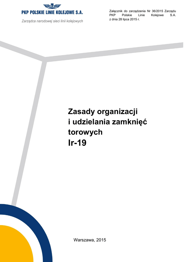 Załącznik do zarządzenia Nr 36/2015 Zarządu PKP Polskie Linie Kolejowe S.A. z dnia 28 lipca 2015 r. Zasady organizacji i udzielania zamknięć torowych Ir-19 Warszawa, 2015 1 Regulacja wewnętrzna spełnia wymagania określone w ustawie z dnia 28 marca 2003 r. o transporcie kolejowym (Dz. U. z 2013 r. Nr 16 poz. 1594 z późń. zm.) w zakresie zapewnienia bezpieczeństwa ruchu kolejowego. Właściciel: PKP Polskie Linie Kolejowe S.A. Wydawca: PKP Polskie Linie Kolejowe S.A. Centrala Biuro Eksploatacji ul. Targowa 74, 03-734 Warszawa tel. 022 47 320 10 www.plk-sa.pl, e-mail: [email protected] Wszelkie prawa zastrzeżone. Modyfikacja, wprowadzanie do obrotu, publikacja, kopiowanie i dystrybucja w celach komercyjnych, całości lub części przepisu, bez uprzedniej zgody PKP Polskie Linie Kolejowe S.A. – są zabronione PKP POLSKIE LINIE KOLEJOWE S.A. Spis treści § 1. Cel i zakres obowiązywania Zasad ................................................................................ .4 § 2. Podstawowe definicje……………………………………………………………….………….4 §3 Planowanie zamknięć torowych………………………………………………….……………5 § 4. Planowanie długoterminowe ........................................................................................... 6 § 5. Planowanie okresowe ..................................................................................................... 9 § 6. Procedura udzielania zamknięć dodatkowych i operatywnych ..................................... 12 § 7. Koncentracja i koordynacja robót wymagających zamknięć torowych .......................... 13 § 8. Techniczne i organizacyjne przygotowanie odcinka linii do zamknięć torowych ........... 13 § 9. Organizacja prowadzenia ruchu pociągów w czasie zamknięcia toru ........................... 16 § 10. Warunki wdrożenia zamknięć torowych………….…………………………………………17 § 11. Kary umowne i odszkodowania z tytułu wydłużenia zamknięć torowych z winy wykonawców robót .……….…………………………………………….…………………..18 § 12. Szczególne zasady udzielania całodobowych zamknięć torowych dla potrzeb modernizacyjnych w przypadku dwóch lub więcej lokalizacji na linii…………………..19 § 13. Tryb opracowywania i wdrażania zastępczego rozkładu jazdy…………………………..20 Załączniki Załącznik nr 1. Wzór Sieciowego harmonogramu zamknięć torowych planowanych do wykonania w rozkładzie jazdy.…………………………………………………..21 Załącznik nr 2. Wzór Terminarza zgłaszania zamknięć i zarządzania zmian organizacji ruchu pociągów…………………………………………………………………..22 Załącznik nr 2a. Wzór Terminarza przygotowania i publikacji rozkładów jazdy pociągów.…23 Załącznik nr 3. Wzór okresowego harmonogramu zamknięć torowych ……………………….24 Załącznik nr 4. Wzór tygodniowego harmonogramu zamknięć torowych……………….…….25 Załącznik nr 5. Procedura opracowania i wdrożenia zastępczego rozkładu jazdy pociągów.26 Schemat Schemat opracowania i wdrożenia zastępczego rozkładu jazdy………..……………………..30 3 PKP POLSKIE LINIE KOLEJOWE S.A. § 1. Cel i zakres obowiązywania Zasad 1. Celem Zasad organizacji i udzielania zamknięć torowych, zwanych dalej Zasadami jest ustalenie procedur w zakresie: 1) planowania i udzielania zamknięć torowych; 2) technicznej organizacji zamknięć torowych; 3) opracowania i wdrożenia zastępczego rozkładu jazdy pociągów; na liniach zarządzanych przez PKP Polskie Linie kolejowe S.A. 2. Postanowienia niniejszych Zasad obowiązują poszczególne jednostki i komórki organizacyjne PKP Polskie Linie Kolejowe S.A. zwaną dalej Spółką, wykonawców robót i przewoźników kolejowych. § 2. Podstawowe definicje 1. Zamknięcia planowe – zamknięcia torowe zgłoszone zgodnie z załącznikami nr 1 i 2 niniejszych Zasad. 2. Zamknięcia dodatkowe – zamknięcia torowe zgłoszone poza terminami określonymi w załącznikach nr 1 i 2 niniejszych Zasad, na które została opracowana zmieniona organizacja ruchu pociągów. 3. Zamknięcia operatywne – zamknięcia torowe zgłoszone poza terminami określonymi w załącznikach nr 1 i 2 niniejszych Zasad, na które nie została opracowana zmieniona organizacja ruchu pociągów. 4. Wystąpienie o zamknięcie – pisemne wystąpienie Wykonawcy do Zamawiającego o udzielenie zamknięcia. 5. Zgłoszenie zamknięcia – złożony przez Zamawiającego do Centrum Rozkładów Jazdy pisemny wniosek o uwzględnienie zamknięcia w rozkładzie jazdy. 6. Udzielenie zamknięcia – zgoda Centrum Rozkładów Jazdy na realizację zamknięcia. Zgoda jest wydawana w postaci Okresowego Harmonogramu Zamknięć a dla zamknięć zgłoszonych poza ustalonymi terminami zgoda jest wydawana pisemnie z określeniem trybu udzielenia zamknięcia. 7. Wdrożenie zamknięcia – zamknięcie toru przez dyżurnego ruchu posterunku zgodnie z Instrukcją Ir-1 na podstawie adresu 13 lub zarządzenia wewnętrznego Naczelnika Sekcji Eksploatacji. 8. Przerwa technologiczna – ustalone przez zarządcę czasowe ograniczenie udostępniania infrastruktury kolejowej przewoźnikom kolejowym, wykorzystywane do prowadzenia prac inwestycyjnych, modernizacyjnych lub utrzymaniowo naprawczych. 9. Okresowy Harmonogram Zamknięć – harmonogram zamknięć torowych powstały w wyniku planowania okresowego i stanowiący podstawę do konstrukcji zastępczego rozkładu jazdy. 10. Sieciowy Harmonogram Zamknięć – harmonogram zamknięć torowych powstały w wyniku planowania długoterminowego i stanowiący podstawę do konstrukcji rocznego rozkładu jazdy. 11. Zamawiający – jednostka organizacyjna Zarządcy infrastruktury odpowiedzialna za realizację zadania inwestycyjnego. 12. 