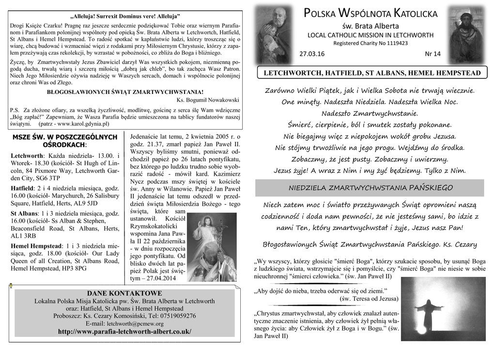 „Alleluja! Surrexit Dominus vere! Alleluja” Drogi Księże Czarku! Pragnę raz jeszcze serdecznie podziękować Tobie oraz wiernym Parafianom i Parafiankom polonijnej wspólnoty pod opieką Św. Brata Alberta w Letchwortch, Hatfield, St Albans i Hemel Hempstead. To radość spotkać w kapłaństwie ludzi, którzy troszcząc się o wiarę, chcą budować i wzmacniać więzi z rodakami przy Miłosiernym Chrystusie, którzy z zapałem przeżywają czas rekolekcji, by wzrastać w pobożności, co zbliża do Boga i bliźniego. Życzę, by Zmartwychwstały Jezus Zbawiciel darzył Was wszystkich pokojem, niezmienną pogodą ducha, trwałą wiarą i szczerą miłością „dobrą jak chleb”, bo tak zachęca Wasz Patron. Niech Jego Miłosierdzie ożywia nadzieję w Waszych sercach, domach i wspólnocie polonijnej oraz chroni Was od Złego. BŁOGOSŁAWIONYCH ŚWIĄT ZMARTWYCHWSTANIA! Ks. Bogumił Nowakowski P.S. Za złożone ofiary, za wszelką życzliwość, modlitwę, gościnę z serca ślę Wam wdzięczne „Bóg zapłać!” Zapewniam, że Wasza Parafia będzie umieszczona na tablicy fundatorów naszej świątyni. (patrz - www.karol.gdynia.pl) MSZE ŚW. W POSZCZEGÓLNYCH OŚRODKACH: Letchworth: Każda niedziela- 13.00. i Wtorek- 18.30 (kościół- St Hugh of Lincoln, 84 Pixmore Way, Letchworth Garden City, SG6 3TP Hatfield: 2 i 4 niedziela miesiąca, godz. 16.00 (kościół- Marychurch, 26 Salisbury Square, Hatfield, Herts, AL9 5JD St Albans: 1 i 3 niedziela miesiąca, godz. 16.00 (kościół- Ss Alban & Stephen, Beaconsfield Road, St Albans, Herts, AL1 3RB Hemel Hempstead: 1 i 3 niedziela miesiąca, godz. 18.00 (kościół- Our Lady Queen of all Creation, St Albans Road, Hemel Hempstead, HP3 8PG Jedenaście lat temu, 2 kwietnia 2005 r. o godz. 21.37, zmarł papież Jan Paweł II. Wszyscy byliśmy smutni, ponieważ odchodził papież po 26 latach pontyfikatu, bez którego po ludzku trudno sobie wyobrazić radość - mówił kard. Kazimierz Nycz podczas mszy świętej w kościele św. Anny w Wilanowie. Papież Jan Paweł II jedenaście lat temu odszedł w przeddzień święta Miłosierdzia Bożego - tego święta, które sam ustanowił. Kościół Rzymskokatolicki wspomina Jana Pawła II 22 października - w dniu rozpoczęcia jego pontyfikatu. Od blisko dwóch lat papież Polak jest świętym – 27.04.2014 DANE KONTAKTOWE Lokalna Polska Misja Katolicka pw. Św. Brata Alberta w Letchworth oraz: Hatfield, St Albans i Hemel Hempstead Proboszcz: Ks. Cezary Komosiński, Tel: 07519059276 E-mail: [email protected] http://www.parafia-letchworth-albert.co.uk/ POLSKA WSPÓLNOTA KATOLICKA św. Brata Alberta LOCAL CATHOLIC MISSION IN LETCHWORTH Registered Charity No 1119423 27.03.16 Nr 14 LETCHWORTCH, HATFIELD, ST ALBANS, HEMEL HEMPSTEAD Zarówno Wielki Piątek, jak i Wielka Sobota nie trwają wiecznie. One minęły. Nadeszła Niedziela. Nadeszła Wielka Noc. Nadeszło Zmartwychwstanie. Śmierć, cierpienie, ból i smutek zostały pokonane. Nie biegajmy więc z niepokojem wokół grobu Jezusa. Nie stójmy trwożliwie na jego progu. Wejdźmy do środka. Zobaczmy, że jest pusty. Zobaczmy i uwierzmy. Jezus żyje! A wraz z Nim i my żyć będziemy. Tylko z Nim. NIEDZIELA ZMARTWYCHWSTANIA PAŃSKIEGO Niech zatem moc i światło przeżywanych Świąt opromieni naszą codzienność i doda nam pewności, że nie jesteśmy sami, bo idzie z nami Ten, który zmartwychwstał i żyje, Jezus nasz Pan! Błogosławionych Świąt Zmartwychwstania Pańskiego. Ks. Cezary „Wy wszyscy, którzy głosicie "śmierć Boga", którzy szukacie sposobu, by usunąć Boga z ludzkiego świata, wstrzymajcie się i pomyślcie, czy "śmierć Boga" nie niesie w sobie nieuchronnej "śmierci człowieka.” (św. Jan Paweł II) „Aby dojść do nieba, trzeba oderwać się od ziemi.” (św. Teresa od Jezusa) „Chrystus zmartwychwstał, aby człowiek znalazł autentyczne znaczenie istnienia, aby człowiek żył pełnią własnego życia: aby Człowiek żył z Boga i w Bogu.” (św. Jan Paweł II) INTENCJE MSZALNE DATA 27.03.2016 Niedziela LOKALIZACJA Letchworth Letchworth 29.03.2016 Wtorek Wielkanocny 03.04.2016 Niedziela INTENCJE I NABOŻEŃSTWA 13.00 NIEDZIELA ZMARTWYCHWSTANIA PAŃSKIEGO W intencji Parafii i Parafian Hatfield 28.03.2016 Poniedz. Wielkanocny GODZ. St Albans 16.00 Nie ma intencji 13.00 + Katarzyna Ejsmont w 3 roczn. śmierci (int. córki Danuty) 16.00 + Mama Ewa Hnatkowicz w 11 roczn. śmierci oraz brat Adam Hemel Hempstead 18.00 Nie ma intencji Letchworth 18.30 + Dziadków: Zofia i Kazimierz Sajewicz oraz Elżbieta i Wilhelm Kuka ( int. A. i K. Świejkowscy) II NIEDZIELA WIELKANOCNA ŚWIĘTO MIŁOSIERDZIA BOŻEGO Letchworth 13.00 St Albans 16.00 Nie ma intencji Hemel Hempstead 18.00 + Andrzej Helicki w 10 roczn. śmierci Święto Miłosierdzia obchodzone jest w pierwszą niedzielę po Wielkanocy, czyli II Niedzielę Wielkanocną, zwaną obecnie Niedzielą Miłosierdzia Bożego. Wpisał je do kalendarza liturgicznego najpierw Franciszek kard. Macharski dla archidiecezji krakowskiej (1985), a potem niektórzy biskupi polscy w swoich diecezjach. Na prośbę Episkopatu Polski Ojciec Święty Jan Paweł II w 1995 roku wprowadził to święto dla wszystkich diecezji w Polsce. W dniu kanonizacji Siostry Faustyny 30 kwietnia 2000 roku Papież ogłosił to święto dla całego Kościoła. Inspiracją dla ustanowie- + Stanisław, Franciszka, Tadeusz, Henryk, Maria, Stefan Kuś (int. p. Stanisławy Sobek) nia tego święta było pragnienie Jezusa, które przekazała Siostra Faustyna. Pan Jezus powiedział do niej: Pragnę, ażeby pierwsza niedziela po Wielkanocy była świętem Miłosierdzia (Dz. 299). Pragnę, aby święto Miłosierdzia, było ucieczką i schronieniem dla wszystkich dusz, a szczególnie dla biednych grzeszników. W dniu tym otwarte są wnętrzności miłosierdzia Mego, wylewam całe morze łask na dusze, które się zbliżą do źródła miłosierdzia Mojego. Która dusza przystąpi do spowiedzi i Komunii św