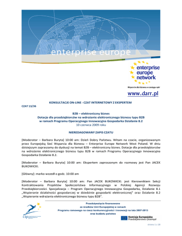 www.darr.pl KONSULTACJE ON-LINE - CZAT INTERNETOWY Z EKSPERTEM CZAT 13/36 B2B – elektroniczny biznes Dotacje dla przedsiębiorców na wdrożenie elektronicznego biznesu typu B2B w ramach Programu Operacyjnego Innowacyjna Gospodarka Działanie 8.2 10 czerwca 2009 roku NIEREDAGOWANY ZAPIS CZATU [Moderator – Barbara Buryta] 10:00 am: Dzień Dobry Państwu. Witam na czacie, organizowanym przez Europejską Sieć Wsparcia dla Biznesu – Enterprise Europe Network West Poland. W dniu dzisiejszym zapraszamy do dyskusji na temat B2B – elektroniczny biznes. Dotacje dla przedsiębiorców na wdrożenie elektronicznego biznesu typu B2B w ramach Programu Operacyjnego Innowacyjna Gospodarka Działanie 8.2. [Moderator – Barbara Buryta] 10:00 am: Ekspertem zaproszonym do rozmowy jest Pan JACEK BUKOWICKI. [Główny]: marko wszedł o godz. 10:00 am [Moderator – Barbara Buryta] 10:00 am: Pan JACEK BUKOWICKI. jest Kierownikiem Sekcji Kontraktowania Projektów Społeczeństwa Informacyjnego w Polskiej Agencji Rozwoju Przedsiębiorczości. Specjalizacja – Program Operacyjnego Innowacyjna Gospodarka, Działanie 8.1 „Wspieranie działalności gospodarczej w dziedzinie gospodarki elektronicznej” oraz Działanie 8.2 „Wspieranie wdrażania elektronicznego biznesu typu B2B”. Przedsięwzięcie finansowane ze środków Unii Europejskiej w ramach Programu ramowego na rzecz konkurencyjności i innowacji na lata 2007-2013 oraz budŜetu państwa strona 1 z 18 strona 1 z 18 [Moderator – Barbara Buryta] 10:00 am: Posiada ponad sześcioletnie doświadczenie zawodowe związane z funduszami UE, w tym w zakresie tworzenia zasad, procedur i dokumentacji aplikacyjnej w ramach programów wspierających rozwój przedsiębiorczości w Polsce, w roli eksperta (asesora) oceniającego wnioski o dofinansowanie w ramach Komisji Konkursowych i Grup Roboczych ds. oceny projektów. [Moderator – Barbara Buryta] 10:00 am: Posiada również doświadczenie jako wykładowca i prelegent w dziedzinie pozyskiwania funduszy unijnych przez przedsiębiorstwa. [Moderator – Barbara Buryta] 10:00 am: Jest doświadczonym trenerem sztuki pisania dobrych projektów, twórcą i redaktorem serwisu e-startup.pl o charakterze pro publico bono. [Moderator – Barbara Buryta] 10:01 am: Posiada kilkuletnie doświadczenie zawodowe w e-biznesie , m.in. w spółce handlowej wdrażającej pionierskie w Polsce internetowe systemy świadczenia e-usług w branży hotelarsko-turystycznej, wspólnie z wiodącymi polskimi portalami informacyjnymi oraz zagranicznymi systemami sprzedaży on-line, a także jako niezależny doradca i ekspert zewnętrzny ds. e-commerce. [Moderator – Barbara Buryta] 10:01 am: Informacje na temat doświadczenia Pana JACKA BUKOWICKIEGO znajdą Państwo na naszej stronie (www.darr.pl) w zakładce: Enterprise Europe Network / Czaty internetowe / Archiwum czatów [Główny]: monikaSz wszedł o godz. 10:01 am [Moderator – Barbara Buryta] 10:01 am: Pytanie startowe: co oznacza elektroniczny biznes typu B2B w myśl definicji określonej w Programie Operacyjnym Innowacyjna Gospodarka? [Ekspert: Jacek Bukowicki] 10:01 am: WItam Państwa serdecznie [ja] 10:01 am: Kiedy planowany jest kolejny nabór wniosków w ramach działania 8.2 [Główny]: adam wszedł o godz. 10:02 am [Ekspert: Jacek Bukowicki] 10:02 am: i dziękuję za przedstawienie. Już odpowiadam na pierwsze pytanie. [Ekspert: Jacek Bukowicki] 10:03 am: Ideą przewodnią działania 8.2 POIG jest wdrażanie w firmach najnowocześniejszych technologii informatyczno-komunikacyjnych (ICT), umożliwiających podejmowanie współpracy z bardziej zaawansowanymi technologicznie firmami lub skuteczniejsze konkurowanie z przedsiębiorstwami opierającymi swój biznes na tego rodzaju technologiach, zarówno na terenie Polski jak i za granicą. [Główny]: pangrafik wszedł o godz. 10:03 am [Ekspert: Jacek Bukowicki] 10:03 am: W tym działaniu chodzi o wdrażanie nowych lub integrację dotychczas eksploatowanych systemów informatycznych - dostosowanie własnych systemów do systemów informatycznych partnerów biznesowych, w celu umożliwienia automatyzacji procesów biznesowych [Główny]: Dziuniek wszedł o godz. 10:04 am strona 2 z 18 [Ekspert: Jacek Bukowicki] 10:04 am: Zgodnie z definicją przyjętą w rozporządzeniu dla działania 8.2 POIG poprzez B2B należy rozumieć relację usługową oraz klasę systemów teleinformatycznych przeznaczonych do automatycznej komunikacji handlowej (wymiany danych) oraz koordynacji działań między przedsiębiorcami, stanowiące niezbędne ogniwo procesów biznesowych tych przedsiębiorców, dotyczące różnego rodzaju współpracy między tymi przedsiębiorcami, w tym również w modelu wirtualnego przedsiębiorstwa, z zastosowaniem e-usług; [Główny]: Sandex wszedł o godz. 10:04 am [Ekspert: Jacek Bukowicki] 10:05 am: a prostymi słowami: chodzi o wdrażanie zamkniętych systemów B2B obejmujących ZEWNĘTRZNE procesy biznesowe realizowane pomiędzy partnerami a wnioskodawcą [monikaSz] 10:06 am: Dzień dobry Panu! Żeby wdrożyć B2B muszę zakupić zintegrowany system zarządzania przedsiębiorstwem, ponieważ nie posiadam takiego. Mam pytanie, które moduły tego systemu mogę zakwalifikować w celu uruchomienia B2B? Czy moduł CRM mogę zakwalifikować? [albert] 10:07 am: Kto może ubiegać się o tego typu dofinansowanie?? [Daniel] 10:07 am: Witam serdecznie. Czy operator platformy B2B może nie być stroną transakcji? [Ekspert: Jacek Bukowicki] 10:07 am: czyli działanie 8.2 nie jest przeznaczone dla wszystkich pomysłów z szeroko pojętej sfery B2B, a jedynie dla zamkniętych dedykowanych systemów integrujących wnioskodawcę z partnerami. Czyli w grę nie wchodzą np. otwarte dla wszystkich serwisy czy portale B2B> [Moderator – Barbara Buryta] 10:08 am: Szanowni Państwo, dziękuję za serię pytań [Ekspert: Jacek Bukowicki] 10:08 am: Kto może się ubiegać o dotację w ramach działania 8.2: mikro-, małe i średni