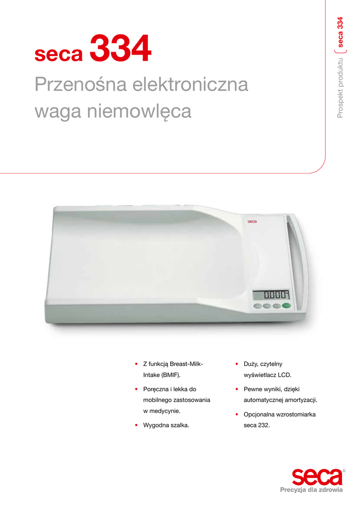 334 Przenośna elektroniczna waga niemowlęca • Z funkcją Breast-Milk- • Duży, czytelny Intake (BMIF). wyświetlacz LCD. • Poręczna i lekka do • Pewne wyniki, dzięki mobilnego zastosowania w medycynie. • Wygodna szalka. automatycznej amortyzacji. • Opcjonalna wzrostomiarka seca 232. Prospekt produktuseca 334 seca Prospekt produktuseca 334 seca 334: Mobilne wagi dla niemowląt z amortyzacją ruchu. N owoczesna technologia okazuje się przydatna tylko wtedy, gdy zdaje ona egzamin w codziennym zastosowaniu. Elektroniczna waga dla niemowląt seca 334 jest wyposażona w niezbędne detale, dzięki którym w przyszłości codzienne zastosowanie w gabinetach lekarskich i szpitalach stanie się łatwiejsze: Dzięki prostej obsłudze, mobilności i długotrwałości spełnia ona oczekiwania pediatrii. Poręczna i lekka, do mobilnego zastosowania w medycynie. Wygodna obsługa dzięki przestronnej szalce i czytelnemu wyświetlaczowi LCD. Pewne wyniki dzięki automatycznej amortyzacji. Ponieważ ciężar własny wynosi tylko 3,5 kg, Przestronna duża szalka, umożliwia wygodne Absolutna precyzja w każdej sytuacji: Dzięki kategorii wagowej. Zintegrowany uchwyt z mowlęta lub małe dzieci mogą być ważone nej amortyzacji seca, dokładne wyniki pracy urządzenie to należy w swojej klasie do lekkiej bocznej strony, zdecydowanie ułatwia transport. Inne praktyczne cechy: Płaski kształt, dzięki czemu waga nie zajmuje dużo miejsca, np. można ją przechowywać w szufladzie stolika do przewijania. W opcjonalnie dostępnej torbie seca 428 można bezpiecznie przechowywać wagę podczas transportu. ułożenie dziecka w seca 334. Większe nie- na siedząco. Wynik pomiaru jest wyświetlany na jasno podświetlonym wyświetlaczu LCD przez dwie minuty. Automatyczne wyłączanie gwarantuje energooszczędną pracę. Dzięki wysoce czułej technologii ważenia i specjal- seca 334 są oczywiste, nawet w przypadku niespokojnych niemowląt. funkcji Breast-Milk-Intake można określić ilość Opcjonalna wzrostomiarka 232. karmienia. Przez naciśnięcie przycisku można Dzięki opcjonalnej wzrostomiarce seca która jest odejmowana od aktualnej wagi oszczędną czasowo stancją pomiarową. mleka spożytego przez niemowlę podczas zapisać przed karmieniem wagę niemowlęcia, podczas ponownego ważenia. 232 waga niemowlęca seca 334 staje się seca 334 Dane techniczne • Nośność: 20 kg • Wymiary (szer. x wys. x gł): • pomiar masy i długości ciała. • • • 640 x 105 x 300 mm Waga własna: 3,5 kg Funkcje: Automatyczne wyłączanie, TARA, auto-HOLD, BMIF Opcjonalnie: Wzrostomiarka seca 232, pozycjoner głowy seca 419, torba transportowa seca 428, zasilacz sieciowy 201133417012 Zastrzegamy sobie prawo do zmian. Opcjonalna wzrostomiarka pozwala na jednoczesny Podziałka: 5 g < 10 kg > 10 g seca gmbh & co. kg • Hammer Steindamm 9 – 25 • 22089 Hamburg • Niemcy • Telefon +48 22 6570 441 • Faks +48 22 6570 426 • www.seca.com