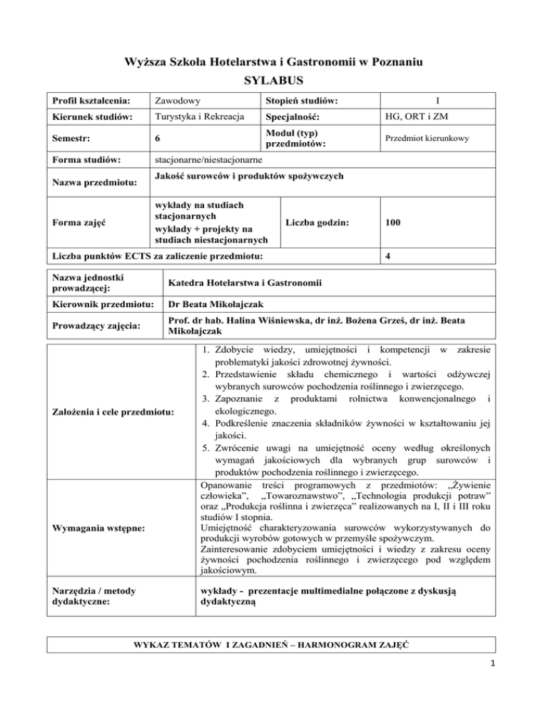 Wyższa Szkoła Hotelarstwa i Gastronomii w Poznaniu SYLABUS Profil kształcenia: Zawodowy Stopień studiów: Kierunek studiów: Turystyka i Rekreacja Specjalność: HG, ORT i ZM Semestr: 6 Moduł (typ) przedmiotów: Przedmiot kierunkowy Forma studiów: stacjonarne/niestacjonarne Nazwa przedmiotu: Jakość surowców i produktów spożywczych wykłady na studiach stacjonarnych wykłady + projekty na studiach niestacjonarnych Forma zajęć I Liczba godzin: Liczba punktów ECTS za zaliczenie przedmiotu: 100 4 Nazwa jednostki prowadzącej: Katedra Hotelarstwa i Gastronomii Kierownik przedmiotu: Dr Beata Mikołajczak Prowadzący zajęcia: Prof. dr hab. Halina Wiśniewska, dr inż. Bożena Grześ, dr inż. Beata Mikołajczak Założenia i cele przedmiotu: Wymagania wstępne: Narzędzia / metody dydaktyczne: 1. Zdobycie wiedzy, umiejętności i kompetencji w zakresie problematyki jakości zdrowotnej żywności. 2. Przedstawienie składu chemicznego i wartości odżywczej wybranych surowców pochodzenia roślinnego i zwierzęcego. 3. Zapoznanie z produktami rolnictwa konwencjonalnego i ekologicznego. 4. Podkreślenie znaczenia składników żywności w kształtowaniu jej jakości. 5. Zwrócenie uwagi na umiejętność oceny według określonych wymagań jakościowych dla wybranych grup surowców i produktów pochodzenia roślinnego i zwierzęcego. Opanowanie treści programowych z przedmiotów: „Żywienie człowieka”, „Towaroznawstwo”, „Technologia produkcji potraw” oraz „Produkcja roślinna i zwierzęca” realizowanych na I, II i III roku studiów I stopnia. Umiejętność charakteryzowania surowców wykorzystywanych do produkcji wyrobów gotowych w przemyśle spożywczym. Zainteresowanie zdobyciem umiejętności i wiedzy z zakresu oceny żywności pochodzenia roślinnego i zwierzęcego pod względem jakościowym. wykłady - prezentacje multimedialne połączone z dyskusją dydaktyczną WYKAZ TEMATÓW I ZAGADNIEŃ – HARMONOGRAM ZAJĘĆ 1 Liczba godzin Lp. Tematy i zagadnienia Razem 1 Formy zajęć Wykład Projekt 4 5 4/1 0/1 2 Charakterystyka surowców pochodzenia roślinnego – skład chemiczny i wartość odżywcza (dr hab. H. Wiśniewska) skład chemiczny i wartości odżywcze zbóż wartości odżywcze roślin okopowych Rośliny strączkowe- wartości odżywcze i wykorzystanie Wartości odżywcze roślin oleistych i ziół Czynniki wpływające na obniżenie wartości produktów rolnych (dr hab. H. Wiśniewska) niewłaściwe przechowywanie produktów rolnych porażenie roślin przez grzyby mikroskopowe 3 4/2 1/2 1/1 0/1 3 Produkty rolnictwa ekologicznego, konwencjonalnego (dr hab. H. Wiśniewska) wartości odżywcze produktów z gospodarstw ekologicznych żywność konwencjonalna 2/1 2/ 1 - 4 Charakterystyka surowców pochodzenia zwierzęcego – skłąd chemiczny i wartość odżywcza (dr inż. Bożena Grześ) budowa mięśni szkieletowych ssaków i ryb skład chemiczny i wartość odżywcza mięsa czerwonego (wieprzowina, wołowina i baranina) i białego (drób i ryby) podstawowy skład chemiczny i wartość odżywcza mleka krowiego ogólna klasyfikacja białek mięsa i mleka Pozyskiwanie surowca mięsnego na cele kulinarne (dr inż. Bożena Grześ) systemy rozbiorów tuszy wieprzowej, wołowej, cielęcej i baraniej w różnych krajach rozbiory kulinarne tuszek drobiowych charakterystyka podstawowych wad mięsa (PSE, RSE, ASE i DFD) – metody identyfikacji i zabiegi uszlachetniające Ocena instrumentalna i sensoryczna jakości jaj i przetworów jajczarskich (dr inż. Beata Mikołajczak) skład chemiczny i wartość odżywcza jaj konsumpcyjnych wyróżniki oceny instrumentalnej i sensorycznej jaj przetwory z jaj i ocena ich jakości właściwości funkcjonalne i kulinarne jaj spożywczych Systematyka wyrobów mięsnych – klasyfikacja, wymagania jakościowe (dr inż. Beata Mikołajczak) klasyfikacja wędlin według polskiej normy (PN) podstawowe etapy produkcji wędlin wpływ poszczególnych etapów produkcji na kształtowanie jakości wyrobów gotowych wymagania w produkcji wędlin o wysokiej gwarantowanej jakości (QAFP) 2/2 2/2 0/1 2/1 2/1 - 2/2 2/1 0/1 2/1 2/1 - 15/12 15/8 0/4 1 2 5 6 7 Razem Symbol Opis zamierzonych efektów kształcenia Odniesienie do efektów 2 efektów kształcenia Po zaliczeniu zajęć student: kształcenia dla kierunku W zakresie wiedzy W01 Ma ogólną wiedzę związaną z problematyką jakości żywności pochodzenia roślinnego i zwierzęcego. K1_W01 W02 Zna i rozumie podstawową terminologię związaną z jakością produkowanej żywności. K1_W02 W03 Posiada aktualną wiedzę na temat rolnictwa ekologicznego jako systemu gospodarowania o zrównoważonej produkcji roślinnej i zwierzęcej. K1_W13 W04 Definiowanie i rozumienie podstawowych pojęć z zakresu jakości żywności w aspekcie zdrowego trybu życia. K1_W17 W zakresie umiejętności U01 Potrafi komunikować się z jednostką i grupą społeczną w zakresie istotnych problemów żywnościowych. K1_U03 U02 Posiada umiejętności wykorzystania zdobytej w trakcie studiów wiedzy z zakresu problematyki jakości produktów roślinnych i zwierzęcych dla potrzeb rynku pracy K1_U05 U03 Potrafi wykorzystać podstawową wiedzę do analizowania procesów i zjawisk gospodarczych w zakresie wytwarzania zdrowej żywności. K1_U14 W zakresie kompetencji personalnych i społecznych K01 Rozumie potrzebę uczenia się przez całe życie. K1_K01 K02 Ma świadomość poziomu swojej wiedzy, umiejętności i ograniczeń, wie kiedy zwrócić się do ekspertów jakości w zakresie środków spożywczych. K1_K02 K03 Okazuje szacunek wobec konsumenta, klienta i gościa oraz wykorzystuje umiejętność sprostania ich oczekiwaniom w zakresie jakości zdrowotnej żywności. K1_K03 K04 Potrafi myśleć i działać w sposób efektywny i przedsiębiorczy w zakresie zapewnienia wysokiej jakości żywności. K1_K10 K05 Charakteryzuje się aktywną postawą świadomego konsumenta. K1_K17 Forma zajęć: Zamierzone ef
