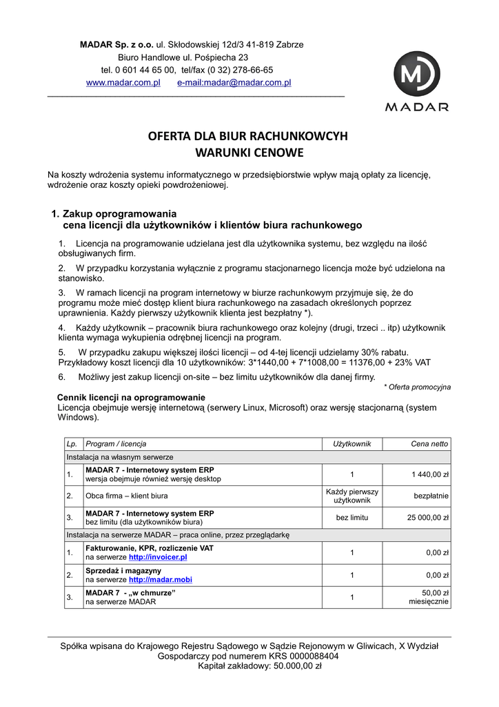 MADAR Sp. z o.o. ul. Skłodowskiej 12d/3 41-819 Zabrze Biuro Handlowe ul. Pośpiecha 23 tel. 0 601 44 65 00, tel/fax (0 32) 278-66-65 www.madar.com.pl e-mail:[email protected] ______________________________________________________________ OFERTA DLA BIUR RACHUNKOWCYH WARUNKI CENOWE Na koszty wdrożenia systemu informatycznego w przedsiębiorstwie wpływ mają opłaty za licencję, wdrożenie oraz koszty opieki powdrożeniowej. 1. Zakup oprogramowania cena licencji dla użytkowników i klientów biura rachunkowego 1. Licencja na programowanie udzielana jest dla użytkownika systemu, bez względu na ilość obsługiwanych firm. 2. W przypadku korzystania wyłącznie z programu stacjonarnego licencja może być udzielona na stanowisko. 3. W ramach licencji na program internetowy w biurze rachunkowym przyjmuje się, że do programu może mieć dostęp klient biura rachunkowego na zasadach określonych poprzez uprawnienia. Każdy pierwszy użytkownik klienta jest bezpłatny *). 4. Każdy użytkownik – pracownik biura rachunkowego oraz kolejny (drugi, trzeci .. itp) użytkownik klienta wymaga wykupienia odrębnej licencji na program. 5. W przypadku zakupu większej ilości licencji – od 4-tej licencji udzielamy 30% rabatu. Przykładowy koszt licencji dla 10 użytkowników: 3*1440,00 + 7*1008,00 = 11376,00 + 23% VAT 6. Możliwy jest zakup licencji on-site – bez limitu użytkowników dla danej firmy. * Oferta promocyjna Cennik licencji na oprogramowanie Licencja obejmuje wersję internetową (serwery Linux, Microsoft) oraz wersję stacjonarną (system Windows). Lp. Program / licencja Użytkownik Cena netto 1 1 440,00 zł Każdy pierwszy użytkownik bezpłatnie Instalacja na własnym serwerze 1. MADAR 7 - Internetowy system ERP wersja obejmuje również wersję desktop 2. Obca firma – klient biura 3. MADAR 7 - Internetowy system ERP bez limitu (dla użytkowników biura) bez limitu 25 000,00 zł Instalacja na serwerze MADAR – praca online, przez przeglądarkę 1. Fakturowanie, KPR, rozliczenie VAT na serwerze http://invoicer.pl 1 0,00 zł 2. Sprzedaż i magazyny na serwerze http://madar.mobi 1 0,00 zł 3. MADAR 7 - „w chmurze” na serwerze MADAR 1 50,00 zł miesięcznie Spółka wpisana do Krajowego Rejestru Sądowego w Sądzie Rejonowym w Gliwicach, X Wydział Gospodarczy pod numerem KRS 0000088404 Kapitał zakładowy: 50.000,00 zł Oferta sprzedaży oraz wdrożenia programu Madar 7 Licencja nie upoważnia do wypożyczania/dzierżawy oprogramowania. W okresie 12 miesięcy od zakupu udzielane jest wsparcie, pozwalające na: • korzystanie z dołączonej w postaci elektronicznej i papierowej instrukcja obsługi, • uzyskanie pomocy technicznej - telefonicznej bądź poprzez e-mail, dotyczące: • instalacji oprogramowania, współpracy z systemami operacyjnymi i urządzeniami zewnętrznymi, • merytoryki działania programu, jego funkcjonalności i konfiguracji, • dostęp do aktualnych wersji programu, uwzględniających zmiany przepisów prawa oraz nowe funkcje i moduły, zgodnie z z rozwojem programów. Koszty zakupu licencji ponoszone są jednorazowo i obejmują aktualizacje przez okres 12 miesięcy od daty zakupu. W kolejnych latach istnieje możliwość wykupu aktualizacji, na następne 12 miesięcy. 2. Zakup rocznych aktualizacji* Po okresie 12 miesięcy od daty zakupu licencji, w celu otrzymania nowych wersji programów, konieczny jest zakup aktualizacji licencji upgrade. W okresie trwania umowy nadzoru autorskiego aktualizacje są bezpłatne. Program ilość Cena netto zł Lp. Według ilości stanowisk 2. Madar 7 Asysta 1 użytkownik 198,00 * Nie dotyczy instalacji na serwerach MADAR 3. Usługi wdrożeniowo – szkoleniowe Wdrożenie systemu do zarządzania firmą wiąże się z poniesieniem nakładów na instalację i konfigurację, szkolenie pracowników, integrację z innym oprogramowaniem wykorzystywanym w firmie – a w późniejszym czasie na pielęgnację i rozwój systemu. W przypadku konieczności wprowadzenia zmian w programie, przeprowadzenia szkolenia, udzielenia zdalnej pomocy poprzez VNC bądź Madar Mobile proponujemy Państwu rozliczenie według faktycznie przepracowanych godzin – według stawki 120 zł netto / godzinę. Usługi 3 Usługa szkoleniowa, wdrożeniowa, konfiguracyjna 1 godzina 120,00 W przypadku konieczności wizyt w siedzibie klienta spoza województwa śląskiego, klienci pokrywają koszty dojazdu. 4. Nadzór autorski Naszym klientom proponujemy podpisanie umowy nadzoru autorskiego, obejmującej opiekę serwisową, powdrożeniową, konsultacje i szkolenia oraz modyfikacje programów w ciągu trwania umowy, w zakresie zależnym od potrzeb klienta. str. 2