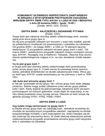 KOMUNIKAT GŁÓWNEGO INSPEKTORATU SANITARNEGO W ZWIĄZKU Z WYSTĄPIENIEM PRZYPADKÓW ZAKAŻENIA WIRUSEM GRYPY ŚWIŃ TYPU A/H1N1 U LUDZI W USA I MEKSYKU z dnia 26 kwietnia 2009 r. (godz. 19.00 ) (Źródło: WHO, CDC, ECDC) GRYPA ŚWIŃ – NAJCZĘŚCIEJ ZADAWANE PYTANIA (Źródło: CDC) Grypa świń jest zakaźną chorobą układu oddechowego świń, wywoływaną prze wirus grypy typu A. Do tej pory przypadki zakażeń tym wirusem u ludzi były rzadkie, jednakże potwierdzono możliwość ich przenoszenia z człowieka na człowieka. Od grudnia 2005 r. do lutego 2009 r. w USA (w 10 stanach) łącznie stwierdzono 12 przypadków zakażeń wirusem grypy świń u ludzi.. Od marca 2009 r. potwierdzono przypadki zakażeń nowym szczepem wirusa typu A/H1N1. Wystąpiły one w Kalifornii i Teksasie. Obecnie trwa dochodzenie epidemiologiczne mające m.in. na celu określenie źródła zakażenia. Co to jest grypa świń ? Grypa świń jest chorobą układu oddechowego świń powodowaną przez wirusy grypy typu A. U świń wirusy te powodują liczne zachorowania, jednakże śmiertelność na skutek zakażenia jest niska. Wirus grypy świń typu A/H1N1 został wyizolowany po raz pierwszy u świń w 1930 roku. Jak dużo jest wirusów grypy świń ? Tak jak i pozostałe wirusy grypy, tak i wirusy grypy świń stale ulegają zmianom. Świnie mogą zostać zakażone przez wirusy grypy ptaków, ludzi i świń. Kiedy dojdzie do jednoczesnego zakażenia świni wirusami pochodzącymi od różnych gatunków, może dojść do reasortacji, w wyniku której powstanie nowy szczep wirusa. Obecnie od świń izoluje się głównie szczepy H1N1, H1N2, H3N2 i H3N1. GRYPA ŚWIŃ U LUDZI Czy ludzie mogą zachorować na grypę świń ? Zwykle wirusy grypy świń nie zakażają ludzi. Jednakże wcześniej dochodziło do sporadycznych przypadków zakażeń, najczęściej na skutek bezpośredniego kontaktu z tymi zwierzętami (np. dzieci bawiące się blisko zwierząt lub pracownicy ferm). W chwili obecnej stwierdzono jednak udokumentowane przypadki przeniesienia wirusów grypy świń bezpośrednio z człowieka na człowieka. 1 Jak często dochodzi do zakażenia wirusem grypy świń u ludzi ? Wcześniej amerykańskie CDC otrzymywało zgłoszenia o jednym przypadku rocznie lub co dwa lata, ale od grudnia 2005 r. do lutego 2009 r. stwierdzono 12 przypadków zakażenia. Jakie są objawy grypy świń u ludzi? Objawy są podobne do tych towarzyszących grypie sezonowej, w tym np. gorączka, osłabienie, brak apetytu, kaszel. U niektórych osób wystąpił katar, ból gardła, nudności, wymioty i biegunka. Czy można zarazić się wirusem grypy świń przez zjedzenie wieprzowiny? Nie. Grypa świń nie przenosi się przez żywność. Nie można zarazić się grypą świń poprzez zjedzenie mięsa wieprzowego i produktów wieprzowych. Jedzenie prawidłowo przygotowanego i poddanego obróbce termicznej mięsa jest bezpieczne. Jak rozprzestrzenia się grypa świń? Grypa może przenosić się bezpośrednio ze świń na ludzi i z ludzi na świnie. Do zakażenia ludzi dochodzi najczęściej poprzez bliski kontakt z zakażonymi zwierzętami. Może również dochodzić do przeniesienia wirusa z człowieka na człowieka. Jakie leki są skuteczne w terapii grypy świń u ludzi? Wyizolowane w USA i Meksyku wirusy grypy świń typu A/H1N1 są oporne na amantadynę i rimantadynę, natomiast są wrażliwe na oseltamiwir i zanamiwir. Czy wirus grypy świń H1N1 jest tym samym wirusem H1N1 krążącym u ludzi? Nie. Wirus grypy świń H1N1 różni się genetycznie od wirusa ludzkiego i dlatego też szczepionki przeciwko grypie sezonowej mogą nie zalewnić pełnej ochrony przed zakażeniem wirusem odzwierzęcym. 2 INFORMACJA GŁÓWNEGO INSPEKTORATU SANITARNEGO DLA OSÓB UDAJĄCYCH SIĘ DO KRAJÓW, W KTÓRYCH STWIERDZONO PRZYPADKI ZAKAŻEŃ WIRUSEM GRYPY ŚWIŃ TYPU A/H1N1 U LUDZI Należy bezwzględnie stosować się do wszelkich zaleceń miejscowej służby zdrowia ściśle przestrzegać reżimu sanitarnego, a w szczególności: unikaj bliskiego kontaktu z osobami wykazującymi objawy grypowodobne. Kiedy sam jesteś chory zachowuj odpowiednią odległość od Innych osób, tak aby chronić je przed zachorowaniem, jeśli wystąpią u Ciebie objawy grypopodobne (np. podwyższona temperatura ciała, osłabienie, kaszel, brak apetytu, katar, ból gardła), pozostań w domu, kiedy kaszlesz i kichasz przykrywaj usta i nos chusteczką. To pomoże zapobiec zakażeniu wirusem innych osób, myj często ręce wodą z mydłem, unikaj dotykania oczu, nosa i ust (wirusy i bakterie często rozprzestrzeniają się gdy ludzie dotykają skażonych powierzchni, a potem oczu, nosa i ust). Ponadto zaleca się: w przypadku wystąpienia objawów chorobowych (np. podwyższona temperatura ciała, osłabienie, kaszel, brak apetytu, katar, ból gardła) – natychmiast skontaktuj się z lekarzem. INFORMACJA GŁÓWNEGO INSPEKTORATU SANITARNEGO DLA OSÓB POWRACAJĄCYCH Z KRAJÓW, W KTÓRYCH STWIERDZONO PRZYPADKI ZAKAŻEŃ WIRUSEM GRYPY ŚWIŃ TYPU A/H1N1 U LUDZI W przypadku wystąpienia w okresie około 10 dni od powrotu do kraju objawów chorobowych (np. podwyższona temperatura ciała, osłabienie, kaszel, brak apetytu, katar, ból gardła) należy niezłocznie udać się do lekarza POZ, najbliższego szpitala zakaźnego lub innej placówki leczniczej i poinformować o historii podróży. 3