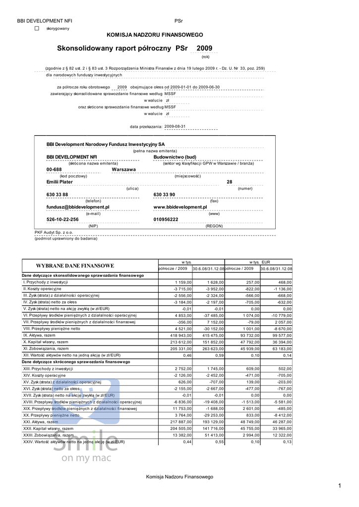 BBI DEVELOPMENT NFI PSr skorygowany KOMISJA NADZORU FINANSOWEGO Skonsolidowany raport półroczny PSr 2009 (rok) (zgodnie z § 82 ust. 2 i § 83 ust. 3 Rozporządzenia Ministra Finansów z dnia 19 lutego 2009 r. - Dz. U. Nr 33, poz. 259) dla narodowyc h funduszy inwestycyjnyc h 2009 obejmujące okres od 2009-01-01 do 2009-06-30 za półrocze roku obrotowego zawierający skonsolidowane sprawozdanie finansowe według MSSF w walucie zł oraz skróc one sprawozdanie finansowe według MSSF w walucie zł data przekazania: 2009-08-31 BBI Development Narodowy Fundusz Inwestycyjny SA (pełna nazwa emitenta) BBI DEVELOPMENT NFI Budownictwo (bud) (skróc ona nazwa emitenta) 00-688 (sektor wg klasyfikac ji GPW w Warszawie / branża) Warszawa (kod poc ztowy) (miejscowość) Emilii Plater 28 (ulic a) 630 33 88 (numer) 630 33 90 (telefon) [email protected] (fax) www.bbidevelopment.pl (e-mail) 526-10-22-256 (www) 010956222 (NIP) (REGON) PKF Audyt Sp. z o.o. (podmiot uprawniony do badania) WYBRANE DANE FINANSOWE w tys. półrocze / 2009 w tys. EUR 30.6.08/31.12.08półrocze / 2009 30.6.08/31.12.08 Dane dotyczące skonsolidow anego spraw ozdania finansow ego I. Przychody z inwestycji 1 159,00 1 628,00 257,00 468,00 II. Koszty operacyjne -3 715,00 -3 952,00 -822,00 -1 136,00 III. Zysk (strata) z działalności operacyjnej -2 556,00 -2 324,00 -566,00 -668,00 IV. Zysk (strata) netto za okres -3 184,00 -2 197,00 -705,00 -632,00 -0,01 -0,01 0,00 0,00 4 853,00 -37 485,00 1 074,00 -10 779,00 V. Zysk (strata) netto na akc ję zwykłą (w zł/EUR) VI. Przepływy środków pieniężnych z działalnośc i operacyjnej VII. Przepływy środków pieniężnych z działalności finansowej -356,00 7 152,00 -79,00 2 057,00 4 521,00 -30 152,00 1 001,00 -8 670,00 IX. Aktywa, razem 418 943,00 415 475,00 93 732,00 99 577,00 X. Kapitał własny, razem 213 612,00 151 852,00 47 792,00 36 394,00 XI. Zobowiązania, razem 205 331,00 263 623,00 45 939,00 63 183,00 0,46 0,59 0,10 0,14 VIII. Przepływy pieniężne netto XII. Wartość aktywów netto na jedną akcję (w zł/EUR) Dane dotyczące skróconego spraw ozdania finansow ego XIII. Przyc hody z inwestyc ji 2 752,00 1 745,00 609,00 502,00 XIV. Koszty operac yjne -2 126,00 -2 452,00 -471,00 -705,00 XV. Zysk (strata) z działalności operac yjnej 626,00 -707,00 139,00 -203,00 -2 155,00 -2 667,00 -477,00 -767,00 -0,01 -0,01 0,00 0,00 XVIII. Przepływy środków pieniężnyc h z działalności operacyjnej -6 836,00 -19 408,00 -1 513,00 -5 581,00 XIX. Przepływy środków pieniężnych z działalnośc i finansowej 11 753,00 -1 688,00 2 601,00 -485,00 3 764,00 -29 253,00 833,00 -8 412,00 XXI. Aktywa, razem 217 887,00 193 129,00 48 749,00 46 287,00 XXII. Kapitał własny, razem 204 505,00 141 716,00 45 755,00 33 965,00 XXIII. Zobowiązania, razem 13 382,00 51 413,00 2 994,00 12 322,00 0,44 0,55 0,10 0,13 XVI. Zysk (strata) netto za okres XVII. Zysk (strata) netto na akcję zwykłą (w zł/EUR) XX. Przepływy pieniężne netto XXIV. Wartość aktywów netto na jedną akc ję (w zł/EUR) Komisja Nadzoru Finansowego 1 BBI DEVELOPMENT NFI PSr Powyższe dane finansowe zostały przeliczone na EUR według następujących zasad: - poszczególne pozycje rachunku zysków i strat oraz rachunku przepływów pieniężnych - według kursu stanowiącego średnią arytmetyczną średnich kursów ustalonych przez NBP na ostatni dzień każdego miesiąca okresu obrotowego: 1 półrocze 2009 roku - 4,5184 zł / EUR, 1 półrocze 2008 roku - 3,4776 zł / EUR, - poszczególne pozycje bilansu - według średniego kursu NBP na dany dzień bilansowy - 4,4696 zł / EUR na dzień 30 czerwca 2009 roku oraz 4,1724 zł / EUR na dzień 31 grudnia 2008 roku. W przypadku prezentowania wybranyc h danyc h finansowyc h z półroc znego skróconego sprawozdania finansowego dane te należy odpowiednio opisać. Wybrane dane finansowe ze skonsolidowanego bilansu (skonsolidowanego sprawozdania z sytuac ji finansowej) lub odpowiednio z bilansu (sprawozdania z sytuac ji finansowej) prezentuje się na koniec półrocza bieżącego roku obrotowego i na koniec poprzedniego roku obrotowego, c o należy odpowiednio opisać. Raport powinien zostać przekazany Komisji Nadzoru Finansowego, spółc e prowadząc ej rynek regulowany oraz do public znej wiadomośc i za pośrednic twem agenc ji informacyjnej zgodnie z przepisami prawa. ZAWARTOŚĆ RAPORTU Plik Opis BBIDevelopment_jednostkowe_P2009.pdf Śródroczne skrócone sprawozdanie finansowe BBIDevelopment_skonsolidowane_P2009.pdf Śródroczne skonsolidowane sprawozdanie finansowe BBID_Sprawozdanie_Zarzadu_Polroczne_Jednostkowe_31sie09.pSprawozdanie Zarządu z działalności Funduszu BBID_Sprawozdanie_Zarzadu_Polroczne_Skonsolidowane_31sie0Sprawozdanie Zarządu z działalności Grupy Kapitałowej Raport z przeglądu BBI Development.pdf Raport z przeglądu śródrocznego skróconego sprawozdania finansowego Raport z przeglądu GK BBI Development.pdf Raport z przeglądu śródrocznego skonsolidowanego sprawozdania finansowego PODPISY OSÓB REPREZENTUJĄCYCH SPÓŁKĘ Data Imię i Nazwisko Stanowisko/Funkc ja 2009-08-31 Michał Skotnicki Prezes Zarządu 2009-08-31 Piotr Litwiński Członek Zarządu 2009-08-31 Paweł Nowacki Członek Zarządu 2009-08-31 Steven Foster W imieniu i na rzecz Contract Administration Sp. z o.o. Podpis Komisja Nadzoru Finansowego 2 BBI DEVELOPMENT NFI S.A. NIEBADANE ŚRÓDROCZNE SKRÓCONE SPRAWOZDANIE FINANSOWE ZA OKRES SZEŚCIU MIESIĘCY ZAKOŃCZONY DNIA 30 CZERWCA 2009 ROKU WRAZ Z RAPORTEM NIEZALEśNEGO BIEGŁEGO REWIDENTA Z PRZEGLĄDU BBI Development NFI S.A. Śródroczne skrócone sprawozdanie finansowe za okres 6 miesięcy zakończony dnia 30 czerwca 2009 roku (w tysiącach PLN) ŚRÓDROCZNY SKRÓCONY BILANS na dzień 30 czerwca 2009 r. Nota 30.06.2009 (niebadane) 31.12.2008 AKTYWA Aktywa trwałe Rzeczowe aktywa trwałe Wartości niematerialne Aktywa z tytułu odroczonego podatku dochodowego Udziały w spółkach zaleŜnych i współkontrolowanych Pozostałe 