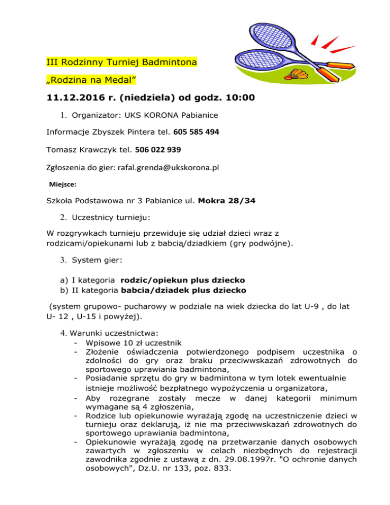 III Rodzinny Turniej Badmintona „Rodzina na Medal” 11.12.2016 r. (niedziela) od godz. 10:00 1. Organizator: UKS KORONA Pabianice Informacje Zbyszek Pintera tel. 605 585 494 Tomasz Krawczyk tel. 506 022 939 Zgłoszenia do gier: [email protected] Miejsce: Szkoła Podstawowa nr 3 Pabianice ul. Mokra 28/34 2. Uczestnicy turnieju: W rozgrywkach turnieju przewiduje się udział dzieci wraz z rodzicami/opiekunami lub z babcią/dziadkiem (gry podwójne). 3. System gier: a) I kategoria rodzic/opiekun plus dziecko b) II kategoria babcia/dziadek plus dziecko (system grupowo- pucharowy w podziale na wiek dziecka do lat U-9 , do lat U- 12 , U-15 i powyżej). 4. Warunki uczestnictwa: - Wpisowe 10 zł uczestnik Złożenie oświadczenia potwierdzonego podpisem uczestnika o zdolności do gry oraz braku przeciwwskazań zdrowotnych do sportowego uprawiania badmintona, Posiadanie sprzętu do gry w badmintona w tym lotek ewentualnie istnieje możliwość bezpłatnego wypożyczenia u organizatora, Aby rozegrane zostały mecze w danej kategorii minimum wymagane są 4 zgłoszenia, Rodzice lub opiekunowie wyrażają zgodę na uczestniczenie dzieci w turnieju oraz deklarują, iż nie ma przeciwwskazań zdrowotnych do sportowego uprawiania badmintona, Opiekunowie wyrażają zgodę na przetwarzanie danych osobowych zawartych w zgłoszeniu w celach niezbędnych do rejestracji zawodnika zgodnie z ustawą z dn. 29.08.1997r. "O ochronie danych osobowych", Dz.U. nr 133, poz. 833. 5. Zgłoszenia: a) Termin zamknięcia listy zgłoszeń 09.12.2016 (piątek) godz. 22.00. b) Zgłoszenia do gier: [email protected] c) Zawodnik zgłaszający się do gry powinien podać: - imię i nazwisko w parze z imię i nazwisko opiekuna, - wiek dziecka, - rodzaje gier (kategoria U- 9 , U-12, U-15 i powyżej) 6. Nagrody: Medale dla wygranych oraz owoce i upominki według możliwości organizatora dla wszystkich uczestników turnieju. Turniej nie ma charakteru komercyjnego, samoorganizacji i jest imprezą non-profit. odbywa Zgłoszenia prosimy nadsyłać e-mailem na adres: [email protected] w terminie do 09 grudnia 2016 r. się na zasadzie