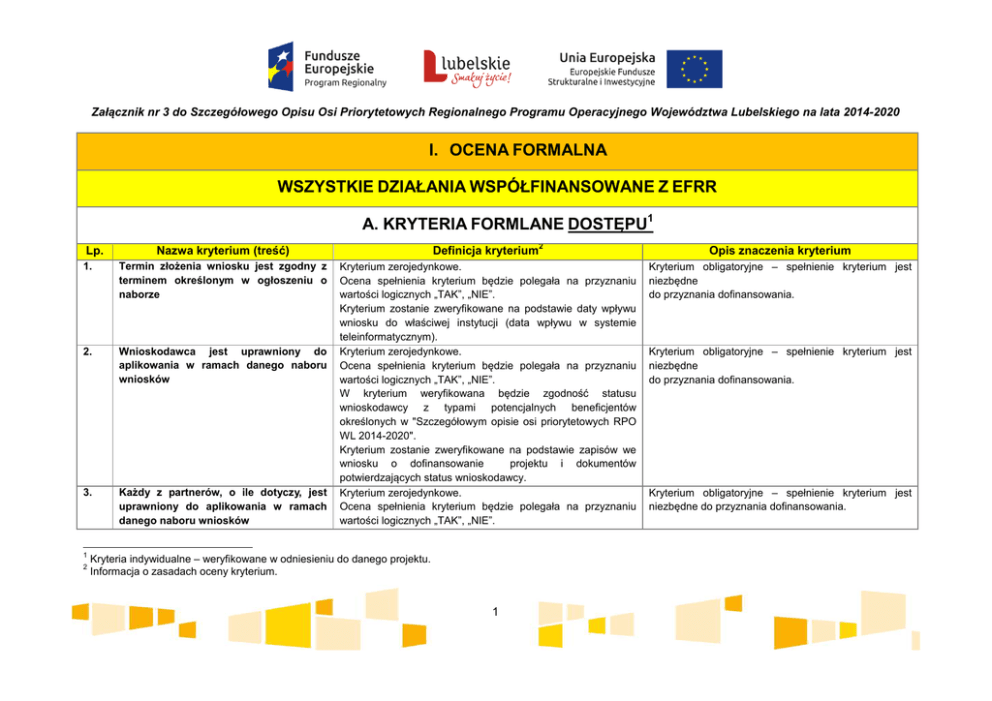 Załącznik nr 3 do Szczegółowego Opisu Osi Priorytetowych Regionalnego Programu Operacyjnego Województwa Lubelskiego na lata 2014-2020 I. OCENA FORMALNA WSZYSTKIE DZIAŁANIA WSPÓŁFINANSOWANE Z EFRR A. KRYTERIA FORMLANE DOSTĘPU1 Lp. 2 Nazwa kryterium (treść) Definicja kryterium 1. Termin złożenia wniosku jest zgodny z terminem określonym w ogłoszeniu o naborze 2. Wnioskodawca jest uprawniony do aplikowania w ramach danego naboru wniosków 3. Każdy z partnerów, o ile dotyczy, jest uprawniony do aplikowania w ramach danego naboru wniosków Kryterium zerojedynkowe. Ocena spełnienia kryterium będzie polegała na przyznaniu wartości logicznych „TAK”, „NIE”. Kryterium zostanie zweryfikowane na podstawie daty wpływu wniosku do właściwej instytucji (data wpływu w systemie teleinformatycznym). Kryterium zerojedynkowe. Ocena spełnienia kryterium będzie polegała na przyznaniu wartości logicznych „TAK”, „NIE”. W kryterium weryfikowana będzie zgodność statusu wnioskodawcy z typami potencjalnych beneficjentów określonych w "Szczegółowym opisie osi priorytetowych RPO WL 2014-2020". Kryterium zostanie zweryfikowane na podstawie zapisów we wniosku o dofinansowanie projektu i dokumentów potwierdzających status wnioskodawcy. Kryterium zerojedynkowe. Ocena spełnienia kryterium będzie polegała na przyznaniu wartości logicznych „TAK”, „NIE”. 1 2 Kryteria indywidualne – weryfikowane w odniesieniu do danego projektu. Informacja o zasadach oceny kryterium. 1 Opis znaczenia kryterium Kryterium obligatoryjne – spełnienie kryterium jest niezbędne do przyznania dofinansowania. Kryterium obligatoryjne – spełnienie kryterium jest niezbędne do przyznania dofinansowania. Kryterium obligatoryjne – spełnienie kryterium jest niezbędne do przyznania dofinansowania. 4. 5. 6. Wnioskodawca ani żaden z partnerów nie zostali wykluczeni z możliwości ubiegania się o wsparcie z funduszy strukturalnych w trybie określonym w przepisach o finansach publicznych i/lub wobec wnioskodawcy ani żadnego z partnerów nie orzeczono zakazu dostępu do środków funduszy europejskich na podstawie ustawy o skutkach powierzenia wykonywania pracy cudzoziemcom przebywającym wbrew przepisom na terytorium Rzeczpospolitej Polskiej i/lub ustawy o odpowiedzialności podmiotów zbiorowych za czyny zabronione pod groźbą kary Projekt został złożony w odpowiedzi na właściwy ogłoszony konkurs Typ projektu jest zgodny z listą typów W kryterium weryfikowana będzie zgodność statusu partnera projektu z typami potencjalnych beneficjentów określonych w "Szczegółowym opisie osi priorytetowych RPO WL 20142020". Kryterium zostanie zweryfikowane na podstawie zapisów we wniosku o dofinansowanie projektu i dokumentów potwierdzających status partnera. Kryterium zerojedynkowe. Ocena spełnienia kryterium będzie polegała na przyznaniu wartości logicznych „TAK”, „NIE”. W kryterium mowa o wykluczeniu, na podstawie art. 207 ust. 4 ustawy o finansach publicznych, art. 12 ust. 1 pkt. 1 ustawy o skutkach powierzenia wykonywania pracy cudzoziemcom przebywającym wbrew przepisom na terenie RP, art. 9 ust. 1 pkt. 2a ustawy o odpowiedzialności podmiotów zbiorowych za czyny zabronione pod groźbą kary. Kryterium zostanie zweryfikowane na podstawie oświadczenia wnioskodawcy/partnera projektu zawartego we wniosku o dofinansowanie projektu oraz na podstawie informacji pisemnej z Ministerstwa Finansów (w odniesieniu do możliwości wykluczenia z możliwości ubiegania się o wsparcie z funduszy strukturalnych w trybie określonym w przepisach o finansach publicznych). Kryterium zerojedynkowe. Ocena spełnienia kryterium będzie polegała na przyznaniu wartości logicznych „TAK”, „NIE”. W ramach kryterium badane jest, czy projekt wpisuje się w założenia określone w Regulaminie konkursu, czy przyjęte założenia projektu kwalifikują go do wsparcia w ramach konkursu, do którego został on złożony. Kryterium zostanie zweryfikowane na podstawie zapisów we wniosku o dofinansowanie projektu i ich zgodności z regulaminem konkursu. Kryterium zerojedynkowe. 2 Kryterium obligatoryjne – spełnienie kryterium jest niezbędne do przyznania dofinansowania. Kryterium obligatoryjne – spełnienie kryterium jest niezbędne do przyznania dofinansowania. Kryterium obligatoryjne – spełnienie kryterium jest projektów w danym Działaniu określonych w Regulaminie konkursu 7. Projekt realizowany jest na obszarze województwa lubelskiego, w szczególności na terenie określonym w Regulaminie konkursu 8. Całkowita wartość projektu jest zgodna z przedziałem kwotowym minimalnej i maksymalnej wartości projektu, przewidzianym dla danego Działania/typu projektów. 9. Kwota dofinansowania jest zgodna z przedziałem kwotowym minimalnej i maksymalnej kwoty dofinansowania, przewidzianym dla danego Działania/typu projektu 10. Termin realizacji projektu, rozumiany jako daty brzegowe rozpoczęcia i zakończenia projektu, jest zgodny z zasadami przewidzianymi w rozporządzeniu ogólnym (art. 65 ust. 6) oraz właściwym dla danego konkursu rozporządzeniem dotyczącym udzielania pomocy publicznej Ocena spełnienia kryterium będzie polegała na przyznaniu wartości logicznych „TAK”, „NIE”. W ramach kryterium badane jest, czy projekt mieści się w katalogu możliwych do realizacji typów projektów w danym działaniu, wskazanych w Regulaminie konkursu. Kryterium zostanie zweryfikowane na podstawie zapisów we wniosku o dofinansowanie projektu i ich zgodności z regulaminem konkursu. Kryterium zerojedynkowe. Ocena spełnienia kryterium będzie polegała na przyznaniu wartości logicznych „TAK”, „NIE”. Kryterium zostanie zweryfikowane na podstawie zapisów we wniosku o dofinansowanie projektu i ich zgodności z regulaminem konkursu. Kryterium zerojedynkowe. Ocena spełnienia kryterium będzie polegała na przyznaniu wartości logicznych „TAK”, „NIE”, „