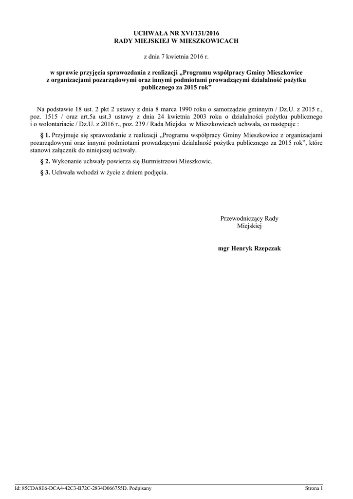 UCHWAŁA NR XVI/131/2016 RADY MIEJSKIEJ W MIESZKOWICACH z dnia 7 kwietnia 2016 r. w sprawie przyjęcia sprawozdania z realizacji „Programu współpracy Gminy Mieszkowice z organizacjami pozarządowymi oraz innymi podmiotami prowadzącymi działalność pożytku publicznego za 2015 rok” Na podstawie 18 ust. 2 pkt 2 ustawy z dnia 8 marca 1990 roku o samorządzie gminnym / Dz.U. z 2015 r., poz. 1515 / oraz art.5a ust.3 ustawy z dnia 24 kwietnia 2003 roku o działalności pożytku publicznego i o wolontariacie / Dz.U. z 2016 r., poz. 239 / Rada Miejska w Mieszkowicach uchwala, co następuje : § 1. Przyjmuje się sprawozdanie z realizacji „Programu współpracy Gminy Mieszkowice z organizacjami pozarządowymi oraz innymi podmiotami prowadzącymi działalność pożytku publicznego za 2015 rok”, które stanowi załącznik do niniejszej uchwały. § 2. Wykonanie uchwały powierza się Burmistrzowi Mieszkowic. § 3. Uchwała wchodzi w życie z dniem podjęcia. Przewodniczący Rady Miejskiej mgr Henryk Rzepczak Id: 85CDA8E6-DCA4-42C3-B72C-2834D066755D. Podpisany Strona 1 Załącznik Nr 1 do UCHWAŁY Nr XVI/131/2016 RADY MIEJSKIEJ W MIESZKOWICACH z dnia 7 kwietnia 2016 r. SPRAWOZDANIE Z REALIZACJI „ PROGRAMU WSPÓŁPRACY GMINY MIESZKOWICE Z ORGANIZACJAMI POZARZĄDOWYMI ORAZ INNYMI PODMIOTAMI PROWADZĄCYMI DZIAŁALNOŚĆ POŻYTKU PUBLICZNEGO ZA 2015 ROK” Mieszkowice, kwiecień 2016 rok Id: 85CDA8E6-DCA4-42C3-B72C-2834D066755D. Podpisany Strona 1 Wstęp Ustawa z dnia 24 kwietnia 2003 roku o działalności pożytku publicznego i o wolontariacie ( tj. Dz.U. z 2014 r., poz.118 ) nakłada na organy gminy obowiązek realizacji zadań ze sfery publicznej we współpracy z organizacjami pozarządowymi oraz podmiotami prowadzącymi działalność pożytku publicznego, o którym mowa w art. 3 ust.3 cytowanej ustawy. Kluczowe znaczenie ma w tej kwestii art. 5a ustawy nakładający na organ stanowiący jednostki samorządu terytorialnego obowiązek uchwalania rocznego programu współpracy z organizacjami pozarządowymi i innymi podmiotami prowadzącymi działalność pożytku publicznego oraz przedłożenia sprawozdania z realizacji programu współpracy za rok poprzedni – na podstawie przyjętego programu na 2015 r. tj. do dnia 30 kwietnia 2016 r. Rada Miejska w Mieszkowicach uchwala corocznie Program współpracy, który określa obszary i zasady oraz formy współpracy Gminy Mieszkowice z organizacjami pozarządowymi. Program stanowi podstawę do dysponowania przez Burmistrza środkami publicznymi przeznaczonymi na finansowanie lub dofinansowanie zadań publicznych pozostających we właściwości Gminy, a realizowanych przez organizacje pozarządowe. Realizując cele określone w Uchwale Nr XLIV/366/2014 Rady Miejskiej w Mieszkowicach z dnia 20 listopada 2014 roku w sprawie przyjęcia „Programu współpracy Gminy Mieszkowice z organizacjami pozarządowymi oraz innymi podmiotami prowadzącymi działalność pożytku publicznego na 2015 rok”, gmina wspierała lokalne organizacje pozarządowe działające w środowisku gminnym. Udzielane wsparcie miało na celu wzmocnienie ich pozycji, stworzenie szans na realizację zadań publicznych i statutowych, aktywizację społeczności lokalnej na poziomie osiedla i sołectw jak również promocję organizacji pozarządowych. Program realizowany był w okresie od 1 stycznia do 31 grudnia 2015 roku. Opracowany projekt programu poddany był konsultacji społecznej poprzez zamieszczenie go na stronie internetowej gminy – BIP. Głównym założeniem programu było udzielenie wsparcia finansowego i pozafinansowego organizacjom. 1. Współpraca w poszczególnych obszarach 1.1 Współpraca finansowa Współpraca finansowa Gminy Mieszkowice z organizacjami pozarządowymi i innymi podmiotami prowadzącymi działalność pożytku publicznego w 2015 roku realizowana była w formie wspierania realizacji zadań publicznych w trybie otwartego konkursu ofert. Planowana współpraca realizowana miała być w trzech obszarach w zakresie : wspomagania działalności służącej propagowaniu trzeźwości i rozwiązywaniu problemów alkoholowych, upowszechniania kultury fizycznej, propagowanie dziedzictwa kulturowego, podtrzymywanie i upowszechnianie tradycji narodowej, pielęgnowanie polskości. Na realizację tych zadań zaplanowano w budżecie gminy kwotę 185 000,00 zł. Realizując powyższe ogłoszono otwarte konkursy ofert na realizację zadań publicznych w okresie od 1 stycznia do 15 grudnia 2015 roku. Oferta dotyczyła podmiotów prowadzących działalność pożytku publicznego skierowaną do mieszkańców Gminy Mieszkowice. Id: 85CDA8E6-DCA4-42C3-B72C-2834D066755D. Podpisany Strona 2 Zadania priorytetowe objęte postępowaniem konkursowym, które zostały ujęte w programie : propagowanie trzeźwego stylu życia poprzez organizację imprez i spotkań trzeźwościowych / maratony, rocznice, rekolekcje i pielgrzymki trzeźwościowe /, prowadzenie poradnictwa specjalistycznego dla osób uzależnionych i ich rodzin, organizacja otwartych imprez sportowych dla mieszkańców / turnieje piłkarskie dla dzieci i dorosłych / oraz wspomaganie działalności szkółek sportowych i uczniowskich klubów sportowych, organizacja i udział zespołów sportowych w rozgrywkach piłkarskich organizowanych w ramach ZZPN, organizacja i udział w zawodach innych dyscyplin sportowych, podnoszenie sprawności zawodników poprzez organizację treningów oraz udział i organizację rozgrywek sparingowych, doposażenie zespołów sportowych w stroje i sprzęt sportowy oraz utrzymanie obiektów sportowych wykorzystywanych do prowadzenia działalności w zakresie kultury fizycznej, organizacja imprez i spotkań mających na celu krzewienie dziedzictwa kulturowego, podtrzymywanie i upowszechnianie tradycji narodowej, pielęgnowanie polskości, organizacja warsztatów, pokazów i wystaw rękodzielniczych, gromadzenie, utrzymanie izb pamiątek regionalnych i narodowych. W ramach pomo