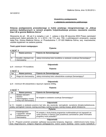 Małkinia Górna, dnia 12.09.2012 r. 341/2/2012 Uczestnicy postępowania o udzielenie zamówienia publicznego Dotyczy postępowania prowadzonego w trybie przetargu nieograniczonego na „Zakup pomocy dydaktycznych w ramach projektu Indywidualizacja procesu nauczania uczniów klas I-III w gminie Małkinia Górna” Stosownie do art. 38 ust 2 w związku z ust. 1 ustawy z dnia 29 stycznia 2004 Prawo zamówień publicznych (tekst jednolity Dz. U. z 2010 r. Nr 113, poz. 759, z późniejszymi zmianami), zwanej dalej Pzp, Gmina Małkinia Górna, ul. Przedszkolna 1, 07-320 Małkinia Górna, woj. mazowieckie, udziela wyjaśnień na zadane pytania. Treść pytań brzmi następująco: Pytanie: CZĘŚĆ 5 Lp. 8 Nazwa pomocy Koraliki z literkami lub równoważny Pytania do Zamawiającego Jakiej minimalnej ilości koralików w zestawie oczekuje Zamawiający? Odpowiedź: lp.8 – minimum 170 koralików. Pytanie: CZĘŚĆ 6 Lp. 9 Nazwa pomocy Waga lub równoważny Pytania do Zamawiającego Jakiej minimalnej ilości odważników oczekuje Zamawiający? Odpowiedź: lp.9 – minimum 58 odważników o łącznym ciężarze 2000g. Pytanie: CZĘŚĆ 7 Lp. 14 Nazwa pomocy Zestaw ćwiczeń i tekstów wspomagający rozwój mowy lub równoważny Pytania do Zamawiającego Ile książek w zestawie oczekuje Zamawiający? Odpowiedź: lp.14 – książek w zestawie powinno być tyle, aby zawierały: samogłoski, wyrażenia dźwiękonaśladowcze, sylaby, samogłoski nosowe, szereg szumiący, szereg syczący, szereg ciszący, głoski dźwięczne. Pytanie: 15 Eduterapeutica Logopedia- wersja podstawowa lub równoważny W związku z dużą ilością programów multimedialnych do logopedii na rynku prosimy o szerszy opis przedmiotu zamówienia- jakie minimalne programy musi posiadać? Odpowiedź: lp.15 – Program powinien posiadać: aplikacja nauczyciela terapeuty, diagnoza – elektroniczne karty mowy, testy diagnostyczne, wstępna diagnoza pedagogiczna, ocena ryzyka dysleksji, ocena ryzyka dyskalkulii, program do diagnozy, program terapeutyczny, ćwiczenia do wydruku – karty pracy i wskazówki dla opiekunów. Program w wersji podstawowej powinien zawierać kilkaset ćwiczeń. Pytanie: 16 Eduterapeutica Logopedia- wersja rozszerzona lub równoważny W związku z dużą ilością programów multimedialnych do logopedii na rynku prosimy o szerszy opis przedmiotu zamówienia- jakie minimalne programy musi posiadać? Odpowiedź: lp. 16 – Program powinien zawierać to co zestaw podstawowy (aplikacja nauczyciela terapeuty, diagnoza – elektroniczne karty mowy, testy diagnostyczne, wstępna diagnoza pedagogiczna, ocena ryzyka dysleksji, ocena ryzyka dyskalkulii, program do diagnozy, program terapeutyczny, ćwiczenia do wydruku – karty pracy i wskazówki dla opiekunów. Wersja podstawowa zawiera kilkaset ćwiczeń). W wersji rozszerzonej powinny się znaleźć moduły terapeutyczne – artykulacja głoski k, g, mowy bezdźwięcznej, słuchu fonematycznego i jąkania. Pytanie: 17 Logopedia-pakiet podstawowy lub równoważny W związku z dużą ilością programów multimedialnych do logopedii na rynku prosimy o szerszy opis przedmiotu zamówienia- jakie minimalne programy musi posiadać? Odpowiedź: lp.17 – Pakiet programów do diagnozy i terapii logopedycznej powinien zawierać: szereg ciszący, szereg syczący, szereg szumiący, różnicowanie szeregów głoska r, aplikacja logopedy. Pytanie: 29 Multimedialny pakiet logopedyczny -zabawy lub równoważny W związku z dużą ilością programów multimedialnych do logopedii na rynku prosimy o szerszy opis przedmiotu zamówienia- jakie minimalne programy musi posiadać? Odpowiedź: lp. 29 – Pakiet powinien zawierać program do terapii logopedycznej składający się z głosek, mowy bezdźwięczna, słuchu fonetycznego. CZĘŚĆ 15 Lp. 8 Nazwa pomocy Tablica z literkami lub równoważny Pytanie do Zamawiającego Jakiej minimalnej wielkości Tablicy z literkami oczekuje Zamawiający? Odpowiedź: lp. 8 - Wielkość tablicy ma być dostosowana w taki sposób, aby zmieściły się na niej wszystkie litery. Pytanie: 16 Gry planszowe różne. Jakich gier w zestawie oczekuje Zamawiający? Odpowiedź: lp. 16 - Gry doskonalące umiejętność czytania i pisania np: zabawa z alfabetem, składanie wyrazów przy pomocy liter lub sylab, tworzenie opowiadań, ćwiczenia i zabawy z szukaniem elementów, dopasowywanie, analiza i synteza. Pytanie: Układanki puzzle Z jakiego materiału mają być wykonane Układanki puzzle? Jakich 17 różne. Układanek oczekuje Zamawiający? Odpowiedź: lp. 17 - Puzzle mogą być wykonane ze sztywnego kartonu, mają pobudzać dzieci do logicznego myślenia, ćwiczyć pamięć i spostrzegawczość. Pytanie: Zamawiający w nazwie użył określenia: Litery szorstkie pisane małe lub Litery szorstkie pisane 19 równoważny, natomiast w opisie pomocy dydaktycznych wymienił również małe lub równoważny inne produkty m.in. litery pisane wielkie- 28 szt., alfabet- litery drukowane plastikowe- 1 szt., tablica z literkami- 2 szt. Czy Zamawiający oczekuje: Liter szorstkich pisanych małych czy również powyżej wymienionych pomocy dydaktycznych ? Odpowiedź: lp. 19 – Prawidłowy opis powinien dotyczyć tylko liter szorstkich pisanych małych (minimum 32 szt.). Pozostała część opisu została umieszczona omyłkowo, a dotyczy lp. 7 i lp. 8.