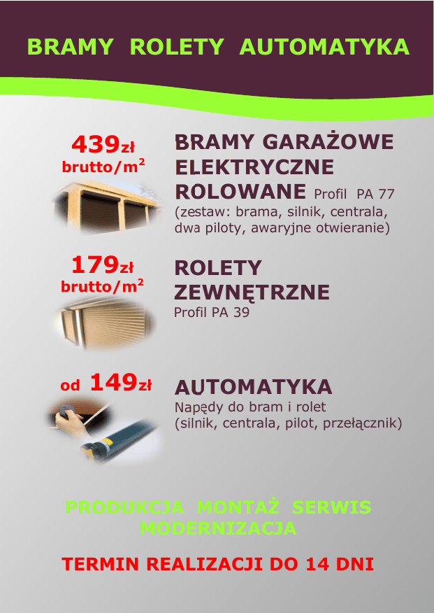 BRAMY ROLETY AUTOMATYKA 439zł 2 brutto/m BRAMY GARAŻOWE ELEKTRYCZNE ROLOWANE Profil PA 77 (zestaw: brama, silnik, centrala, dwa piloty, awaryjne otwieranie) 179zł brutto/m2 ROLETY ZEWNĘTRZNE Profil PA 39 od 149zł AUTOMATYKA Napędy do bram i rolet (silnik, centrala, pilot, przełącznik) PRODUKCJA MONTAŻ SERWIS MODERNIZACJA TERMIN REALIZACJI DO 14 DNI