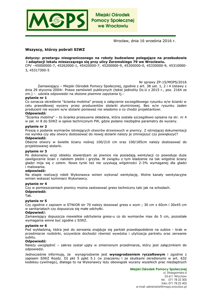 Wrocław, dnia 16 września 2016 r. Wszyscy, którzy pobrali SIWZ dotyczy: przetargu nieograniczonego na roboty budowlane polegające na przebudowie i adaptacji lokalu mieszczącego się przy ulicy Żeromskiego 79 we Wrocławiu. CPV –45000000-7, 45262000-1, 45420000-7, 45200000-9, 45300000-0, 45330000-9, 453100003, 45317300-5 Nr sprawy ZP-15/MOPS/2016 Zamawiający – Miejski Ośrodek Pomocy Społecznej, zgodnie z art. 38 ust. 1, 2 i 4 Ustawy z dnia 29 stycznia 2004r. Prawo zamówień publicznych (tekst jednolity Dz.U z 2015 r., poz. 2164 ze zm.) – udziela odpowiedzi na złożone pisemne zapytania tj.: pytanie nr 1 Co oznacza określenie "ścianka mobilna" proszę o załączenie szczegółowego rysunku w/w ścianki w celu prawidłowej wyceny przez producentów stolarki aluminiowej. Bez w/w rysunku żaden producent nie wyceni w/w stolarki ponieważ nie wiadomo o co chodzi projektantowi. Odpowiedź: "Ścianka mobilna" – to ścianka przesuwna składana, która została szczegółowo opisana na str. nr 4 w zał. nr 8 do SIWZ w opisie technicznym PW, gdzie podano niezbędne parametry do wyceny. pytanie nr 2 Proszę o podanie wymiarów istniejących otworów drzwiowych w piwnicy. Z istniejącej dokumentacji nie wynika czy aby otwory dostosować do nowej stolarki należy je zmniejszyć czy powiększyć? Odpowiedź: Obecne otwory w świetle ściany nośnej 100/210 cm oraz 100/185cm należy dostosować do projektowanej stolarki. pytanie nr 3 Po dokonaniu wizji obiektu stwierdzam ze piwnice nie posiadają wentylacji co powoduje duże zawilgocenie ścian z nalotem pleśni i grzyba. W związku z tym kładzenie na tak wilgotne ściany gładzi mija się z celem. Nowe tynki też nie uzyskają wilgotności 2-3% wymaganej dla gładzi i malowania. odpowiedź: Na etapie realizacji robót Wykonawca winien wykonać wentylację. Wolne kanały wentylacyjne winien wskazać kominiarz Wykonawcy. pytanie nr 4 Czy w pomieszczeniach piwnicy można zastosować gress techniczny taki jak na schodach. Odpowiedź: Tak. pytanie nr 5 Czy zgodnie z zapisem w STWiOR str 70 należy stosować gress o wym ; 30 cm x 60cm i 30x45 cm w sanitariatach czy dopuszcza się małe odchyłki. Odpowiedź: Zamawiający dopuszcza niewielkie odchylenia gress-u co do wymiarów max do 5 cm, pozostałe wymagania winne być zgodne z SIWZ. pytanie nr 6 Pod wykładziną, która jest do zerwania znajduje się parkiet prawdopodobnie na subice - brak w przedmiarze rozbiórki, oczywiście dochodzi również wywózka i utylizacja parkietu oraz zerwanie subitu. Odpowiedź: Należy uwzględnić – zakres został ujęty w zmienionym przedmiarze, który jest załącznikiem do odpowiedzi. Jednocześnie informuję, że wynagrodzenie jest wynagrodzeniem ryczałtowym i zgodnie z zapisem SIWZ Rozdz. III pkt 5 ppkt 5.1 (w znaczeniu i ze skutkami określonymi w art. 632 kodeksu cywilnego), dlatego to na Wykonawcy leży obowiązek wyceny wszelkich prac niezbędnych Miejski Ośrodek Pomocy Społecznej ul. Strzegomska 6 53-611 Wrocław tel. 071 78 22 300 faks: 071 78 22 405 e-mail: [email protected] do wykonania zamówienia wyszczególnionych w dokumentacji technicznej i STWiORB, natomiast przedmiary (załącznik nr 10 do SIWZ) są to dokumenty pomocnicze. pytanie nr 7 wszystkie ściany i sufity pokryte są tapetą papierową - brak w przedmiarze zeskrobania tej tapety. Odpowiedź: Należy uwzględnić – zakres został ujęty w zmienionym przedmiarze, który jest załącznikiem do odpowiedzi. pytanie nr 8 w części pom. jest boazeria ścienna - brak rozebrania w przedmiarze. Odpowiedź: Należy uwzględnić – zakres został ujęty w zmienionym przedmiarze, który jest załącznikiem do odpowiedzi. pytanie nr 9 kraty okienne od strony podwórka - czy należy oczyścić i pomalować? - brak takiej pozycji w kosztorysie. Odpowiedź: Należy uwzględnić – zakres został ujęty w zmienionym przedmiarze, który jest załącznikiem do odpowiedzi. pytanie nr 10 proszę o wyjaśnienie kwestii parapetów - jeśli poz.5 i 36 przedmiaru robót dotyczą parapetów zewnętrznych to brak jest parapetów wewnętrznych - proszę o wyjaśnienie. Odpowiedź: Należy zamontować parapety zewnętrzne i wewnętrzne. pytanie nr 11 czy ściany i sufity w piwnicach należy pomalować? będą tam wykonywane prace instalacyjne i wymiana drzwi - brak w przedmiarze robót. Odpowiedź: Ściany i sufity w piwnicy należy pomalować. pytanie nr 12 przy wejściu do lokalu jest próg, a przed wejściem kraty z otworem, jakie przyjąć rozwiązanie dostępności dla niepełnosprawnych? Odpowiedź: Kraty przed wejściem należy wymienić na pokrycie panelowe z blachy ocynkowanej o gr 5 mm. Istniejące drzwi posiadają próg ok. 5 cm. Po skuciu posadzek należy nowe drzwi wejściowe osadzić tak, aby próg wejściowy był wysokości maksymalnie 2 cm. pytanie nr 13 proszę o doprecyzowanie parametrów ścianki mobilnej - jakie warunki musi spełniać, brak jest szczegółów w projekcie. Odpowiedź: Odpowiedzi udzielono w odpowiedzi na pytanie nr 1. pytanie nr 14 brak w przedmiarze wykucia bruzd dla osadzenia nadproży. Odpowiedź: Odpowiedzi udzielono w odpowiedzi na pytanie nr 6 pytanie nr 15 brak w przedmiarze uchwytów dla niepełnosprawnych w łazience. Odpowiedź: Należy zamontować uchwyty dla niepełnosprawnych z uwzględnieniem odpowiedzi na pytanie nr 6. pytanie nr 16 czy nad umywalkami przewidzieć lustra? Odpowiedź: Tak z uwzględnieniem odpowiedzi na pytanie nr 6 . Miejski Ośrodek Pomocy Społecznej ul. Strzegomska 6 53-611 Wrocław tel. 071 78 22 300 faks: 071 78 22 405 e-mail: [email protected] pytanie nr 17 czy Zamawiający dysponuje opinią kominiarską odnośnie drożności i prawidłowości przewodów wentylacyjnych? Odpowiedź: Zamawiający nie dysponuje opinią kominiarską, kanały wentylacyjne są drożne. pytanie nr 18 w przedmiarze części elektrycznej pozycje nr 52, 53, 54 mają wartość = 0, proszę o wyjaśnienie Odpowiedź: Zgodnie z dokumentacją projekto