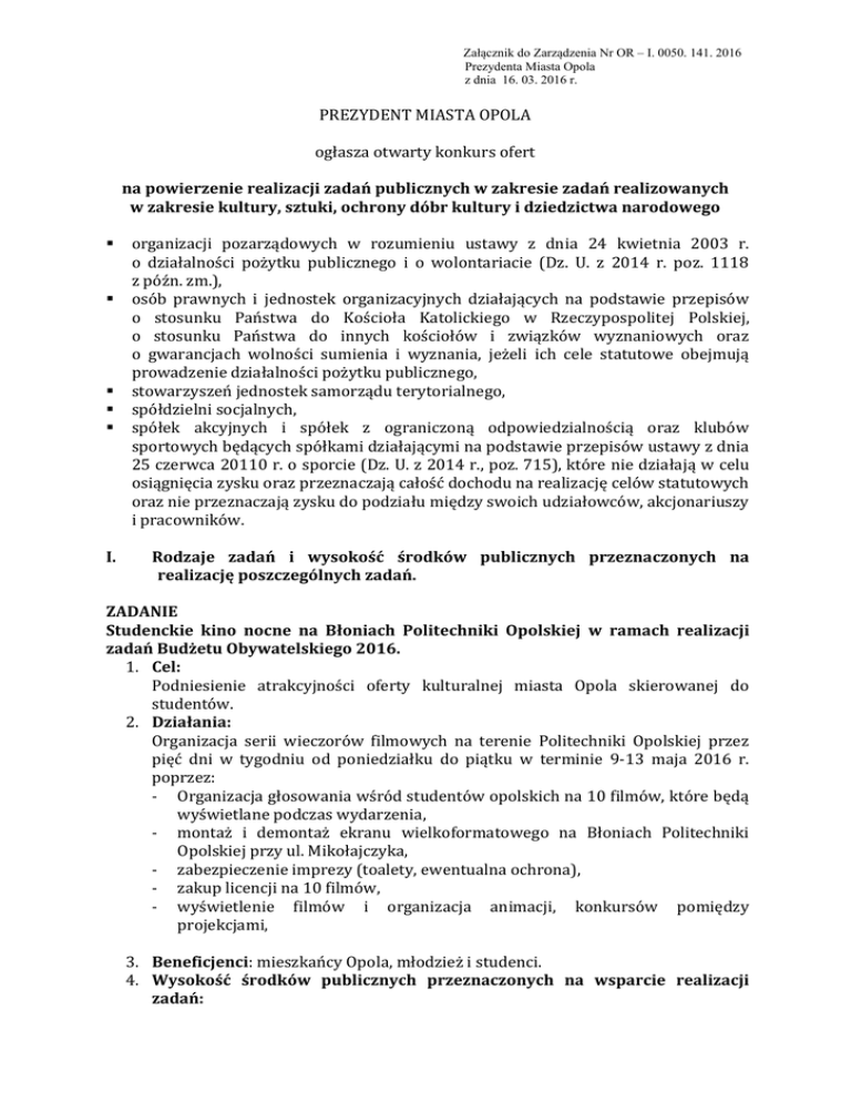 Załącznik do Zarządzenia Nr OR – I. 0050. 141. 2016 Prezydenta Miasta Opola z dnia 16. 03. 2016 r. PREZYDENT MIASTA OPOLA ogłasza otwarty konkurs ofert na powierzenie realizacji zadań publicznych w zakresie zadań realizowanych w zakresie kultury, sztuki, ochrony dóbr kultury i dziedzictwa narodowego I. organizacji pozarządowych w rozumieniu ustawy z dnia 24 kwietnia 2003 r. o działalności pożytku publicznego i o wolontariacie (Dz. U. z 2014 r. poz. 1118 z późn. zm.), osób prawnych i jednostek organizacyjnych działających na podstawie przepisów o stosunku Państwa do Kościoła Katolickiego w Rzeczypospolitej Polskiej, o stosunku Państwa do innych kościołów i związków wyznaniowych oraz o gwarancjach wolności sumienia i wyznania, jeżeli ich cele statutowe obejmują prowadzenie działalności pożytku publicznego, stowarzyszeń jednostek samorządu terytorialnego, spółdzielni socjalnych, spółek akcyjnych i spółek z ograniczoną odpowiedzialnością oraz klubów sportowych będących spółkami działającymi na podstawie przepisów ustawy z dnia 25 czerwca 20110 r. o sporcie (Dz. U. z 2014 r., poz. 715), które nie działają w celu osiągnięcia zysku oraz przeznaczają całość dochodu na realizację celów statutowych oraz nie przeznaczają zysku do podziału między swoich udziałowców, akcjonariuszy i pracowników. Rodzaje zadań i wysokość środków publicznych przeznaczonych na realizację poszczególnych zadań. ZADANIE Studenckie kino nocne na Błoniach Politechniki Opolskiej w ramach realizacji zadań Budżetu Obywatelskiego 2016. 1. Cel: Podniesienie atrakcyjności oferty kulturalnej miasta Opola skierowanej do studentów. 2. Działania: Organizacja serii wieczorów filmowych na terenie Politechniki Opolskiej przez pięć dni w tygodniu od poniedziałku do piątku w terminie 9-13 maja 2016 r. poprzez: - Organizacja głosowania wśród studentów opolskich na 10 filmów, które będą wyświetlane podczas wydarzenia, - montaż i demontaż ekranu wielkoformatowego na Błoniach Politechniki Opolskiej przy ul. Mikołajczyka, - zabezpieczenie imprezy (toalety, ewentualna ochrona), - zakup licencji na 10 filmów, - wyświetlenie filmów i organizacja animacji, konkursów pomiędzy projekcjami, 3. Beneficjenci: mieszkańcy Opola, młodzież i studenci. 4. Wysokość środków publicznych przeznaczonych na wsparcie realizacji zadań: - 45 000 zł (słownie: czterdzieści pięć tysięcy złotych 00/100). II. Zasady przyznawania dotacji i kryteria stosowane przy wyborze ofert. 1. Przy wyborze oferty będą brane pod uwagę następujące kryteria: 1) Koszty realizacji planowanego projektu, udział środków własnych oraz innych źródeł finansowania, 2) Dotychczasowa współpraca z miastem Opole, w szczególności terminowe rozliczenie dotacji. 2. Koszty pokrywane z dotacji: 1) 2) 3) 4) wynagrodzenia i honoraria, koszty wynajmu toalet, ochrony zakup licencji do filmów, organizacja i realizacja techniczna projektu (wynajęcie sprzętu potrzebnego do projekcji filmów) 5) zakup materiałów niezbędnych do realizacji projektu, 3. Ocena możliwości realizacji zadania publicznego, w tym ocena kalkulacji kosztów: 1) zasoby lokalowe i sprzętowe oferenta, 2) zasoby kadrowe oferenta, kwalifikacje osób, które będą realizować zadanie, 3) doświadczenie w realizacji zadań podobnego typu, w tym rekomendacje dla organizacji lub programu, 4) rzetelność i terminowość oraz sposób rozliczania dotacji w latach poprzednich, 5) koszt realizacji zadania w odniesieniu do zakresu rzeczowego zadania. 4. Ocena jakości merytorycznej zadania: 1) cele i założenia zadania, 2) adekwatność i opis planowanych działań, 3) monitoring, ewaluacja podejmowanych działań, 4) innowacyjność. 5. Konkurs zostanie rozstrzygnięty także w przypadku, gdy wpłynie jedna oferta. 6. Oferenci, których oferty zostały przyjęte są zobowiązani dostarczyć zaktualizowany preliminarz kosztów realizacji zadania uwzględniający zmiany zakresu rzeczowego i finansowego stosownie do przyznanych środków wraz z harmonogramem realizacji zadania. 7. Po ogłoszeniu otwartego konkursu ofert, organ administracji publicznej zawiera umowy na powierzenie realizacji zadania publicznego z wyłonionymi organizacjami pozarządowymi lub podmiotami wymienionymi w art. 3 ust. 3 ustawy o działalności pożytku publicznego i o wolontariacie. III. Termin i warunki realizacji zadania. Załącznik do Zarządzenia NR OR –I . 0050. 141. 2016 Prezydenta Miasta Opola z dnia 16 marca 2016 r. 2 1. Realizacja zadania powinna nastąpić w Opolu w terminie określonym w umowie o powierzeniu zadania publicznego, jednak zakończona nie później niż do dnia 13 maja 2016 r. 2. Podmiot składający ofertę: 1) zamierza realizować zadanie na rzecz mieszkańców miasta Opola, 2) prowadzi działalność statutową w dziedzinie objętej konkursem, 3) posiada kadrę i zaplecze odpowiednie do realizacji zadania, 4) umożliwi organowi zlecającemu sprawowanie kontroli realizacji zadania, 5) posiada szczegółowy program realizacji zadania zawierający: a) harmonogram działań, b) przewidywane efekty, c) przewidywane ryzyko i sposób jego eliminowania, d) ewaluację, 6) zobowiąże się do wyodrębnienia w ewidencji księgowej środków otrzymanych na realizację umowy i rozliczenie dotacji zgodnie z ustalonymi warunkami. IV. Termin składania ofert. 1. Oferty winny być złożone wraz z kompletem załączników: - w teczce umożliwiającej dopięcie ich do segregatora (z wykluczeniem sposobu trwałego spinania dokumentów – bindowanie, zszywanie itp.) z oznaczeniem nazwy i adresu podmiotu, z dopiskiem: „Konkurs ofert na powierzenie realizacji zadań publicznych w zakresie zadań realizowanych w zakresie kultury, sztuki, ochrony dóbr kultury i dziedzictwa narodowego”. - w Centrum Dialogu Obywatelskiego w Referacie Promocji Urzędu Miasta Opola, 45-015 Opole, ul. Krawiecka 13 II piętro – pokój nr 3, w 