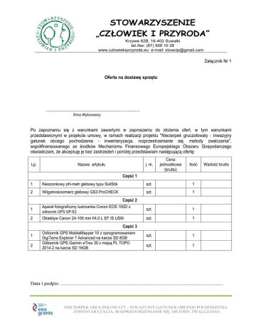 STOWARZYSZENIE „CZŁOWIEK I PRZYRODA” Krzywe 62B, 16-402 Suwałki tel./fax: (87) 569 10 28 www.czlowiekiprzyroda.eu e-mail: [email protected] Załącznik Nr 1 Oferta na dostawę sprzętu ................................................................................ firma Wykonawcy Po zapoznaniu się z warunkami zawartymi w zaproszeniu do złożenia ofert, w tym warunkami przedstawionymi w projekcie umowy, w ramach realizacji projektu "Niecierpek gruczołowaty - inwazyjny gatunek obcego pochodzenia - inwentaryzacja, rozprzestrzenianie się, metody zwalczania", współfinansowanego ze środków Mechanizmu Finansowego Europejskiego Obszaru Gospodarczego oświadczam, że akceptuję je bez zastrzeżeń i poniżej przedstawiam następującą ofertę: Lp. Nazwa artykułu j. m. Cena jednostkowa (brutto) Ilość Wartość brutto Część 1 1 Kieszonkowy pH-metr glebowy typu SoilStik szt. 1 2 Wilgotnościomierz glebowy GS3 ProCHECK szt. 1 Część 2 1 Aparat fotograficzny lustrzanka Conon EOS 100D z odbiornik GPS GP-E2 szt. 1 2 Obiektyw Canon 24-105 mm f/4,0 L EF IS USM szt. 1 szt. 1 szt. 1 Część 3 1 2 Odbiornik GPS MobileMapper 10 z oprogramowaniem DigiTerra Explorer 7 Advanced na karcie SD 8GB Odbiornik GPS Garmin eTrex 30 z mapą PL TOPO 2014.2 na karcie SD 16GB Data i podpis: .............................................................................................................................. NIECIERPEK GRUCZOŁOWATY - INWAZYJNY GATUNEK OBCEGO POCHODZENIA - INWENTARYZACJA, ROZPRZESTRZENIANIE SIĘ, METODY ZWALCZANIA