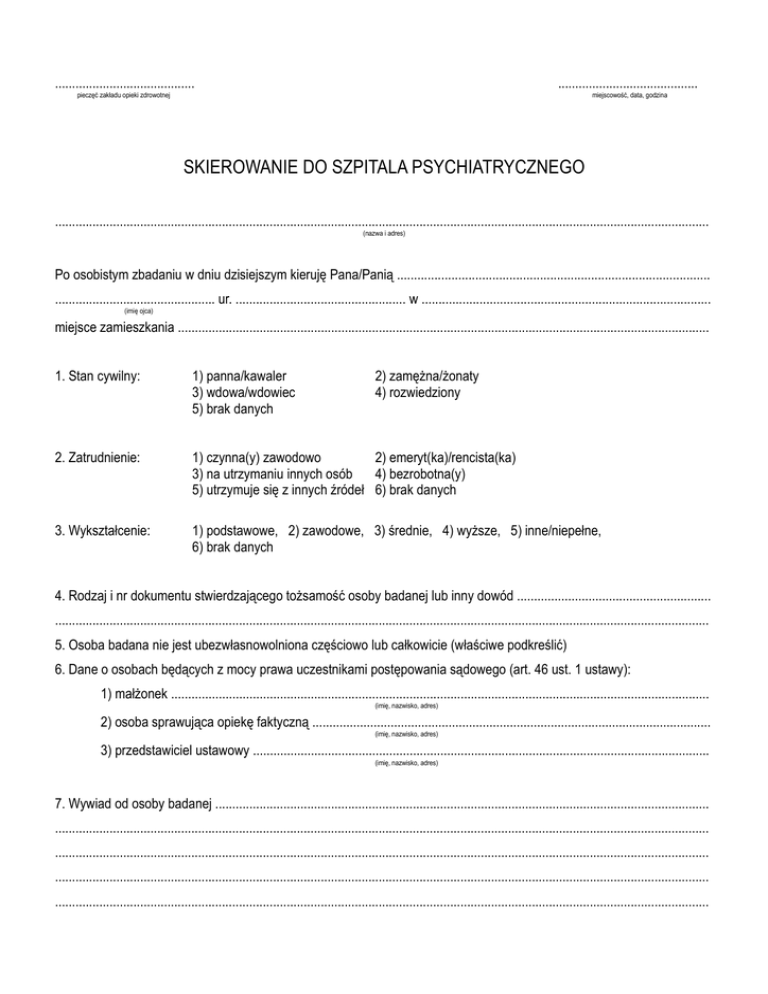 ......................................... ......................................... pieczęć zakładu opieki zdrowotnej miejscowość, data, godzina SKIEROWANIE DO SZPITALA PSYCHIATRYCZNEGO ................................................................................................................................................................................................ (nazwa i adres) Po osobistym zbadaniu w dniu dzisiejszym kieruję Pana/Panią ............................................................................................ ............................................... ur. .................................................. w ..................................................................................... (imię ojca) miejsce zamieszkania ............................................................................................................................................................ 1. Stan cywilny: 1) panna/kawaler 3) wdowa/wdowiec 5) brak danych 2) zamężna/żonaty 4) rozwiedziony 2. Zatrudnienie: 1) czynna(y) zawodowo 2) emeryt(ka)/rencista(ka) 3) na utrzymaniu innych osób 4) bezrobotna(y) 5) utrzymuje się z innych źródeł 6) brak danych 3. Wykształcenie: 1) podstawowe, 2) zawodowe, 3) średnie, 4) wyższe, 5) inne/niepełne, 6) brak danych 4. Rodzaj i nr dokumentu stwierdzającego tożsamość osoby badanej lub inny dowód ......................................................... ................................................................................................................................................................................................ 5. Osoba badana nie jest ubezwłasnowolniona częściowo lub całkowicie (właściwe podkreślić) 6. Dane o osobach będących z mocy prawa uczestnikami postępowania sądowego (art. 46 ust. 1 ustawy): 1) małżonek .............................................................................................................................................................. (imię, nazwisko, adres) 2) osoba sprawująca opiekę faktyczną ..................................................................................................................... (imię, nazwisko, adres) 3) przedstawiciel ustawowy ...................................................................................................................................... (imię, nazwisko, adres) 7. Wywiad od osoby badanej ................................................................................................................................................. ................................................................................................................................................................................................ ................................................................................................................................................................................................ ................................................................................................................................................................................................ ................................................................................................................................................................................................ 8. Wywiad od rodziny i innych osób ....................................................................................................................................... ................................................................................................................................................................................................ ................................................................................................................................................................................................ ................................................................................................................................................................................................ ................................................................................................................................................................................................ 9. Ocena stanu fizycznego ..................................................................................................................................................... ................................................................................................................................................................................................ ................................................................................................................................................................................................ ................................................................................................................................................................................................ ................................................................................................................................................................................................ 10. Ocena stanu psychicznego .............................................................................................................................................. ................................................................................................................................................................................................ ................................................................................................................................................................................................ ...........................................................................................................................................................................................