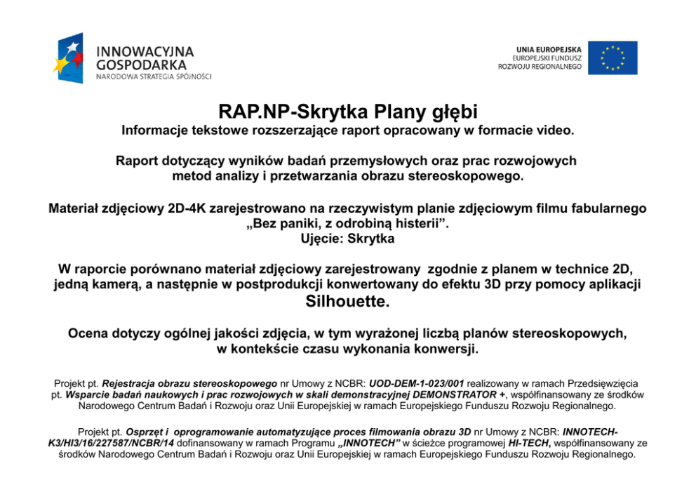 RAP.NP-Skrytka Plany głębi Informacje tekstowe rozszerzające raport opracowany w formacie video. Raport dotyczący wyników badań przemysłowych oraz prac rozwojowych metod analizy i przetwarzania obrazu stereoskopowego. Materiał zdjęciowy 2D-4K zarejestrowano na rzeczywistym planie zdjęciowym filmu fabularnego „Bez paniki, z odrobiną histerii”. Ujęcie: Skrytka W raporcie porównano materiał zdjęciowy zarejestrowany zgodnie z planem w technice 2D, jedną kamerą, a następnie w postprodukcji konwertowany do efektu 3D przy pomocy aplikacji Silhouette. Ocena dotyczy ogólnej jakości zdjęcia, w tym wyrażonej liczbą planów stereoskopowych, w kontekście czasu wykonania konwersji. Projekt pt. Rejestracja obrazu stereoskopowego nr Umowy z NCBR: UOD-DEM-1-023/001 realizowany w ramach Przedsięwzięcia pt. Wsparcie badań naukowych i prac rozwojowych w skali demonstracyjnej DEMONSTRATOR +, współfinansowany ze środków Narodowego Centrum Badań i Rozwoju oraz Unii Europejskiej w ramach Europejskiego Funduszu Rozwoju Regionalnego. Projekt pt. Osprzęt i oprogramowanie automatyzujące proces filmowania obrazu 3D nr Umowy z NCBR: INNOTECHK3/HI3/16/227587/NCBR/14 dofinansowany w ramach Programu „INNOTECH” w ścieżce programowej HI-TECH, współfinansowany ze środków Narodowego Centrum Badań i Rozwoju oraz Unii Europejskiej w ramach Europejskiego Funduszu Rozwoju Regionalnego. Raport jest wynikiem badań przemysłowych i prac rozwojowych dotyczących systemu Rejestrację materiałów filmowych wykonano podczas rzeczywistych planów zdjęciowych w projekcie pt. Rejestracja obrazu stereoskopowego w ramach Przedsięwzięcia pt. Wsparcie badań naukowych i prac rozwojowych w skali demonstracyjnej DEMONSTRATOR +. Prace finalizujące postprodukcję materiałów oraz kontrolę jakości efektów 3D wykonano w projekcie pt. Osprzęt i oprogramowanie automatyzujące proces filmowania obrazu 3D w ramach Programu INNOTECH w ścieżce programowej HI-TECH. Projekty współfinansowane ze środków Narodowego Centrum Badań i Rozwoju oraz Unii Europejskiej w ramach Europejskiego Funduszu Rozwoju Regionalnego. Prezentowany materiał zdjęciowy: NP-Skrytka Liczba klatek: Format: Kamery: 258 (około 11 sekund) R3D 5K HD, RC 4:1, 24 fps RED EPIC Mysterium-X Kolejne 2 części prezentowanego materiału opracowano w technice: 1. Konwersja 3D – wersja 1 - rejestracja wykonana na jednej kamerze, - konwersja do efektu 3D wykonana przy pomocy oprogramowania Silhouette, ukazująca mniej szczegółową głębię. 2. Konwersja 3D – wersja 2 - rejestracja wykonana na jednej kamerze, - konwersja do efektu 3D wykonana przy pomocy oprogramowania Silhouette, ukazująca bardziej szczegółową głębię niż w wersji 1. Wykonane czynności Postprodukcja materiału obejmowała czynności składające się na uzyskanie finalnego efektu konwersji stereoskopowej zarejestrowanego materiału w technice 2D do efektu 3D. Wykonano czynności: ● Analiza materiału 2D i wybór metody konwersji oraz oprogramowania narzędziowego, ● Rotoscoping / Modelowanie, ● Ustawienie głębi, ● Ustawienia konwergencji, ● Rendering, ● Transkodowanie materiałów do montażu 3D. Wnioski: 1. Wersja 1 uzyskana w czasie 7 h pracy specjalisty (Grafika). Obraz 3D przy pomocy oprogramowania Silhouette wykazuje poprawną jakość głębi w obszarze skrytki na broń. Dla osób bardziej pożądających efektów 3D, właściwe wydało się również uzyskanie głębi 3D dla postaci bohatera. Głębię tła uznano za niepotrzebną, z uwagi na zastosowany świadomie efekt nieostrości oddalonego krajobrazu, niemającego związku z fabułą. 2. Wykonując procedurę uzupełniającej konwersji przy pomocy oprogramowania Silhouette w czasie dodatkowych 6 h uzyskano pożądane efekty 3D w wymaganej jakości technicznej i estetycznej. 3. Istotne dla efektywności (nawet wykonalności) procedury przy użyciu wybranego oprogramowania jest wykonywanie czynności we właściwej kolejności oraz wybór właściwych funkcji oprogramowania. 4. Dla właściwego wyboru oprogramowania oraz ustalenia skutecznego planu pracy niezbędne jest przeprowadzenie wstępnej analizy materiału 2D przez doświadczonego Stereografera. Dla wykonania uzupełniającej konwersji wymagane były czynności przygotowawcze o łącznym czasie 2 h, które nie wystąpiłyby w przypadku właściwej decyzji po wstępnej analizie. W tym przypadku właściwe decyzje Stereografera pozwoliłyby na oszczędność czasu pracy na poziomie około 20%, 5. Przyjęto, że dla przedmiotowego charakteru sceny efektywniejsze jest wykonanie procedury konwersji przy pomocy oprogramowania Silhouette. Posiadając doświadczenie świadomie zrezygnowano z zastosowania oprogramowania PFDepth. Dla różnych scen należy stosować właściwe oprogramowanie. Zalecamy do zapoznania się z wnioskami raportu dotyczącego konwersji ujęcia Lustro. Autorzy raportu: Miłosz Cieślikowski-Ryczko Michał Drozd Dawid Gąsiński Krzysztof Kamil Kruczyński Daria Konieczna Łukasz Konieczny Joanna Kwiatkowska Wacław Mikłaszewski Zbigniew Stencel Mariusz Suszek Alina Sztoch Przemysław Sztoch Ryszard Sztoch Tomasz Szafrański Jarosław Świerczyński Jakub Urbański Koniec