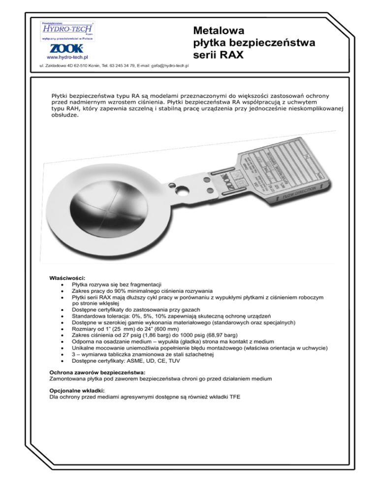 Metalowa płytka bezpieczeństwa serii RAX Płytki bezpieczeństwa typu RA są modelami przeznaczonymi do większości zastosowań ochrony przed nadmiernym wzrostem ciśnienia. Płytki bezpieczeństwa RA współpracują z uchwytem typu RAH, który zapewnia szczelną i stabilną pracę urządzenia przy jednocześnie nieskomplikowanej obsłudze. Właściwości: Płytka rozrywa się bez fragmentacji Zakres pracy do 90% minimalnego ciśnienia rozrywania Płytki serii RAX mają dłuższy cykl pracy w porównaniu z wypukłymi płytkami z ciśnieniem roboczym po stronie wklęsłej Dostępne certyfikaty do zastosowania przy gazach Standardowa toleracja: 0%, 5%, 10% zapewniają skuteczną ochronę urządzeń Dostępne w szerokiej gamie wykonania materiałowego (standarowych oraz specjalnych) Rozmiary od 1” (25 mm) do 24” (600 mm) Zakres ciśnienia od 27 psig (1,86 barg) do 1000 psig (68,97 barg) Odporna na osadzanie medium – wypukła (gładka) strona ma kontakt z medium Unikalne mocowanie uniemożliwia popełnienie błędu montażowego (właściwa orientacja w uchwycie) 3 – wymiarwa tabliczka znamionowa ze stali szlachetnej Dostępne certyfikaty: ASME, UD, CE, TUV Ochrona zaworów bezpieczeństwa: Zamontowana płytka pod zaworem bezpieczeństwa chroni go przed działaniem medium Opcjonalne wkładki: Dla ochrony przed mediami agresywnymi dostępne są również wkładki TFE Metalowa płytka bezpieczeństwa serii RAX Uwaga: Maksymalne zakresy temperatur dla płytek wyposażonych we wkładki są niższe. Tabela 1 - Seria RAX Minimalne i maksymalne wskaźniki ciśnienia- psig (barg) @ 72°F (22°C) Minimalne ciśnienie rozrywania- psig @ 72°F (bar @ 22°C) Rozmiar Płytki Z wkładkami (RAX-L) 316SS Inconel Monel Nikiel Tylko do obsługi gazów. Do zastosowania z cieczą wymagana jest osłona poniżej dysku Odnośnie dodatkowych informacji skontaktuj się z ZOOK 1” 25 mm 1-1/2” 40mm 2” 50mm 3” 80mm 4” 100 mm 6” 150 mm 8” 200 mm 10” 250 mm 12” 300mm Max Temp. 92 (6.34) 81 (5.59) 60 (4.14) 55 (3.79) 40 (2.76) 35 (2.41) 33 (2.28) 30 (2.07) 27 (1.86) 500°F (260°C) 221 (15.24) 234 (16.14) 188 (12.97) 154 (10.62) 122 (8.41) 94 (6.48) ▲ ▲ ▲ ▲ ▲ ▲ 900°F (482°C) 141 (9.72) 98 (6.76) 83 (5.72) 66 (4.55) 54 (3.72) 47 (3.24) 44 (3.03) 40 (2.76) 37 (2.55) 900°F (482°C) 122 (8.41) 98 (6.76) 83 (5.72) 65 (4.48) 55 (3.79) 44 (3.03) 41 (2.83) 39 (2.69) 36 (2.48) 900°F (482°C) 92 (6.34) 81 (5.59) 60 (4.14) 55 (3.79) 48 (3.31) 35 (2.41) 33 (2.28) 30 (2.07) 27 (1.86) 750°F (399°C) ▲ niedostępne Uwaga: Prosimy o kontakt odnośnie niewymienionych wyżej materiałów, rozmiarów, zakresów ciśnienia i temperatur. Tabela 2 - Zakres produkcji/Tolerancja ciśnieniowa psig (barg) @ 72°F (22°C) Określony zakres ciśnienia rozrywania 1 do poniżej 5 (0.07 do poniżej 0.34) 5 do poniżej 10 (0.34 do poniżej 0.69) 10 do poniżej 15 (0.69 do poniżej 1.03) 15 do 40 (1.03 do 2.76) powyżej 40 (powyżej 2.76) Uwagi: Zakresy produkcji Tolerancja rozrywania 0%,-5%, -10% +/- 0.5 (+/-0,03) +/- 0.80 (+/-0.06) +/-1.30 (+/- 0.09) +/- 2.00 (+/- 0.14) +/-5% +/-5% zakres 0% może nie być dostępny we wszystkich materiałach tolerancje rozrywania to maksymalne spodziewane wariacje od wskazanego ciśnienia rozrywania płytki Certyfikowany wskaźnik ograniczenia przepływów Typ płytki Krl (Ciecz) Seria RAX ▲ Krg (Gaz) 2,00