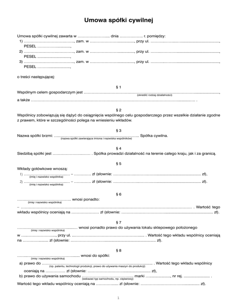 Umowa spółki cywilnej Umowa spółki cywilnej zawarta w ………………….... dnia ……….…….. r. pomiędzy: 1)………………………….……., zam. w …………………..............., przy ul. ………..……....…..................................., PESEL ……………............, 2)…………………….…………., zam. w …………………..............., przy ul. ……..…………......................................., PESEL .............................., 3)……………………………….., zam. w …………………..............., przy ul. ………..………......................................., PESEL ………..................., o treści następującej: §1 Wspólnym celem gospodarczym jest …………………………………………………………………………......................, (określić rodzaj działalności) a także …………………………………………………………………………………………………...........…. . §2 Wspólnicy zobowiązują się dążyć do osiągnięcia wspólnego celu gospodarczego przez wszelkie działanie zgodne z prawem, które w szczególności polega na wniesieniu wkładów. §3 Nazwa spółki brzmi: ….……….…………………………….…………….. Spółka cywilna. (nazwa spółki zawierająca imiona i nazwiska wspólników) §4 Siedzibą spółki jest …………………..…… . Spółka prowadzi działalność na terenie całego kraju, jak i za granicą. §5 Wkłady gotówkowe wnoszą: 1)…………………………..… – …………. zł (słownie: ……………..……….……......................................... zł), (imię i nazwisko wspólnika) 2)…………………………..… – …………. zł (słownie: ………………..……….…......................................... zł). (imię i nazwisko wspólnika) §6 ………………………………….. wnosi ponadto: (imię i nazwisko wspólnika) – ………………………………………………………………………………………………………………… . Wartość tego wkładu wspólnicy oceniają na ………………… zł (słownie: ……………………………............................................ zł). §7 …………………………..……......… wnosi ponadto prawo do używania lokalu sklepowego położonego (imię i nazwisko wspólnika) w …..………………...., przy ul. ...…………………………………………..... . Wartość tego wkładu wspólnicy oceniają na …………......... zł (słownie: ………………….…................................................ zł). §8 ……..……………….……………....... wnosi do spółki: (imię i nazwisko wspólnika) a)prawo do …………….…………………………………………........................ . Wartość tego wkładu wspólnicy (np. patentu, technologii produkcji, prawo do używania maszyn do produkcji) oceniają na …………… zł (słownie: ………………………......................... zł), b)prawo do używania samochodu …………….....……………...... marki …..................., nr rej. ........................ . (wskazać typ samochodu, np. ciężarowy) Wartość tego wkładu wspólnicy oceniają na …………...... zł (słownie: …………………………….............. zł). 1 §9 Łącznie wkłady wspólników wynoszą: 1)……………….……………… – ………… zł (słownie: …………………………….…................................ zł), (imię i nazwisko wspólnika) 2)……………….……………… – ………… zł (słownie: ……………………….………................................ zł), (imię i nazwisko wspólnika) 3)………………………………. – ………… zł (słownie: …………………………..……............................... zł). (imię i nazwisko wspólnika) § 10 Udział wspólników w majątku spółki wynosi1: 1)………………..…….............. – .….%, (imię i nazwisko wspólnika) 2)……………………................ – .….%, (imię i nazwisko wspólnika) 3)………………..…….............. – .….%. (imię i nazwisko wspólnika) § 11 Uchwały wspólników zapadają jednomyślnie przy obecności wszystkich wspólników2. § 12 Prowadzenie spraw spółki powierza się ………………………………… i ………………………………. . (imię i nazwisko wspólnika) (imię i nazwisko wspólnika) ……….………………………................... jest wyłączony(a) od prowadzenia spraw spółki3. (imię i nazwisko wspólnika) § 13 Uchwałę wszystkich wspólników dotyczących prowadzenia spraw spółki zastępuje uchwała wspólników, którym powierzono prowadzenie spraw spółki4. § 14 Wspólnicy prowadzący sprawy spółki zobowiązani są do składania sprawozdania o stanie spółki co pół roku5. § 15 Wspólnicy nie otrzymują wynagrodzenia za prowadzenie spraw spółki. Spółka może jednak zawrzeć ze wspólnikami umowę zlecenia czy też umowę o dzieło, których przedmiot nie będzie mieścił się w zakresie prowadzenia spraw spółki. §16 Koszty związane z prowadzeniem i reprezentowaniem spółki pokrywane są z majątku spółkowego. § 17 ……………………................................. może odwołać upoważnienie wspólników do prowadzenia spraw spółki lub (imię i nazwisko wspólnika) też je ograniczyć6. § 18 Każdy ze wspólników jest obowiązany do uzupełnienia wkładów, których wartość uległa zmniejszeniu o połowę wskutek poniesionych strat. § 19 W razie zmniejszenia wartości wkładu wspólnicy aż do wyrównania uszczerbku nie mogą domagać się wypłaty zysku. § 20 Wspólnik ma obowiązek powstrzymywać się od wszelkiej działalności sprzecznej z in