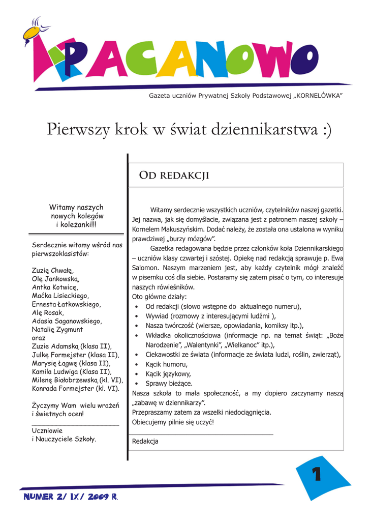 Gazeta uczniów Prywatnej Szkoły Podstawowej „KORNELÓWKA” Pierwszy krok w świat dziennikarstwa :) Od redakcji Witamy naszych nowych kolegów i koleżanki!!! Witamy serdecznie wszystkich uczniów, czytelników naszej gazetki. Jej nazwa, jak się domyślacie, związana jest z patronem naszej szkoły – Kornelem Makuszyńskim. Dodać należy, że została ona ustalona w wyniku prawdziwej „burzy mózgów”. Serdecznie witamy wśród nas Gazetka redagowana będzie przez członków koła Dziennikarskiego pierwszoklasistów: – uczniów klasy czwartej i szóstej. Opiekę nad redakcją sprawuje p. Ewa Salomon. Naszym marzeniem jest, aby każdy czytelnik mógł znaleźć Zuzię Chwałę, w pisemku coś dla siebie. Postaramy się zatem pisać o tym, co interesuje Olę Jankowską, naszych rówieśników. Antka Kotwicę, Maćka Lisieckiego, Oto główne działy: Ernesta Łatkowskiego, • Od redakcji (słowo wstępne do aktualnego numeru), Alę Rosak, • Wywiad (rozmowy z interesującymi ludźmi ), Adasia Saganowskiego, • Nasza twórczość (wiersze, opowiadania, komiksy itp.), Natalię Zygmunt • Wkładka okolicznościowa (informacje np. na temat świąt: „Boże oraz Narodzenie”, „Walentynki”, „Wielkanoc” itp.), Zuzie Adamską (klasa II), • Ciekawostki ze świata (informacje ze świata ludzi, roślin, zwierząt), Julkę Formejster (klasa II), Marysię Łągwę (klasa II), • Kącik humoru, Kamila Ludwiga (Klasa II), • Kącik językowy, Milenę Białobrzewską (kl. VI), • Sprawy bieżące. Konrada Formejster (kl. VI). Nasza szkoła to mała społeczność, a my dopiero zaczynamy naszą „zabawę w dziennikarzy”. Życzymy Wam wielu wrażeń Przepraszamy zatem za wszelki niedociągnięcia. i świetnych ocen! Obiecujemy pilnie się uczyć! _____________________ Uczniowie ________________________________________ i Nauczyciele Szkoły. Redakcja 1 Numer 2/ IX/ 2009 r. Z wizytą w Pałacu Herbsta Kącik poetycki *** We wtorek 22 września starsze klasy naszej szkoły udały się na wycieczkę do Pałacu Herbsta. Jest to jeden z wielu łódzkich zabytków architektury mieszkalnej przełomu XIX –XX w. Należał do bogatej rodziny fabrykantów - Herbstów. Zwiedzaliśmy dokładnie cały kompleks tzn. liczne pokoje, saloniki, ogród zimowy, jadalnię. Podziwialiśmy wspaniale zachowane meble z epoki. Najbardziej podobał się nam przepiękny pozłacany zegar. Wyobrażamy sobie, że przyjemnie było mieszkać i odpoczywać w tak ładnym miejscu. ______________________________ Konrad Formejster (klasa VI) Jutro w świat Ujrzeć tam śliczny las, Tysiące gwiazd, Rozdroży sto, Oto mój plan. Wyprzedzić czas, Świetnej zabawy poznać smak, Wytrwała być Iść wśród mórz, tam gdzie ty Aby pokazać, że trzeba chcieć, by móc Torem życia przejść. ______________________ Ines Graczyk kl.VI Jutro w świat Już niedługo opuszczę rodzinny dom, Udam się w daleką podróż. Tata czule pożegna mnie, Razem z mamą i siostrą. „Ojczyzna” odejdzie w dal. Wszystko zostawiam za sobą. Świat, do którego zmierzam Wielki jest i nieznany. Ale przecież woła mnie! To chyba do niego pójdę. ______________________ Milena Białobrzweska kl.VI Świata ciekawy modne Pacanowo T ej jesieni będą modne krótkie sukienki w grochy lub paski. W naszej garderobie także nie powinno zabraknąć luźnych tunik, workowatych płaszczy, błyszczących legginsów, bluzek z bufiastymi rękawami i wysokich butów za kolana. __________________ Agata Usidus (klasa IV) Jutro wyruszę w świat Uczyć się życia, Trochę innego, Rządny wiedzy, Ogarnięty duchem poznania. Wielkiego świata ciekawy Śledzić losy ludzi, Widzieć przez pryzmat historii, Istnieć, starać się zrozumieć. Angażować innych Tak, aby wspólnie się rozwijać ______________________ Konrad Formejster kl.VI 2 Numer 2/ IX/ 2009 r. nauka, nauka, nauk .... zagadka matematyczna a Posiadasz trzy wiadra 12l, 8l i 5l. Wiadro dwunastolitrowe jest pełne wody (12l). Twoim zadaniem jest tak przelewać wodę aby uzyskać dwa wiadra po 6l wody. _________________________ Maciej Jóźwiak (klasa VI) Zobaczyć wibrację Co ci będzie potrzebne? Kij od szczotki, 6 piłeczek pingpongowych, 6 kawałków sznurka długości 50cm, dwa krzesła, taśma klejąca. Co masz zrobić? 1. Połóż kij od szczotki na oparciach dwóch krzeseł jedno naprzeciwko drugiego. 2. Przywiąż do kija kawałki sznurka. Do każdego z nich umocuj taśmą klejącą jedną piłeczkę. Piłeczki muszą się dotykać tworząc równy szereg. 3. Odsuń pierwszą piłeczkę od następnej tak, aby sznurek pozostał napięty. Puść piłeczkę w ten sposób, żeby uderzyła następną z kolei. Przygotuj, zobacz i baw się! ________________________________________ Maciej Kupras (klasa IV) 7. 6. 5. 4. 3. 2. 1. Z wiadra 12l przelewam 8l do wiadra 8 litrowego, w wiadrze 12l mam 4l wody Z wiadra 8l odlewam 5l wody do wiadra 5l. W wiadrze 8l pozostały 3l wody Przelewam 5l wody do wiadra 12l i otrzymuję 9l wody w wiadrze 12l. Wiadro 5l jest puste Z wiadra 8l przelewam 3l wody ( które tam zostały) do wiadra 5l (wiadro 8l jest puste) Z wiadra 12l (jest tam teraz 9l) przelewam 8l wody do wiadra 8l. W wiadrze 12l jest 1l wody Z wiadra 8l przelewam 2l wody do wiadra 5l (więcej tam się nie zmieści - są już 2l wody). W wiadrze 8l mam już 6l wody Z wiadra 5l przelewam 5l wody do wiadra 12l i mam 6l Rozwiązanie: Co nie co o Architekturze ________________________ Architektura antyczna - Grecja Cała współczesna myśl europejska opiera się na wzorcach antycznych. Na obecny kształt sztuki i nauki największy wpływ miała kultura śródziemnomorska, zarówno grecka, jak i – w późniejszych czasach – rzymska. Podobnie jest z architekturą, bowiem budowle, które stworzyli starożytni Grecy, ciągle jeszcze stanowią wzór architektoniczny. Zapomniana i odkrywana na nowo, tak naprawdę nigdy nie zniknęła z kart historii, dlatego też nosi miano architektury klasycznej