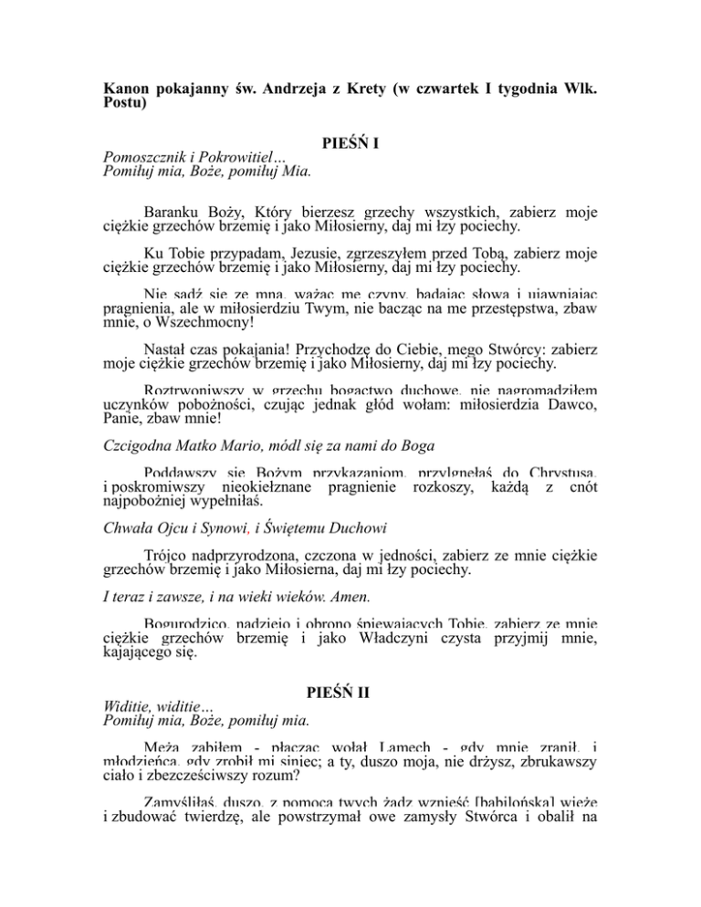 Kanon pokajanny św. Andrzeja z Krety (w czwartek I tygodnia Wlk. Postu) Pomoszcznik i Pokrowitiel… Pomiłuj mia, Boże, pomiłuj Mia. PIEŚŃ I Baranku Boży, Który bierzesz grzechy wszystkich, zabierz moje ciężkie grzechów brzemię i jako Miłosierny, daj mi łzy pociechy. Ku Tobie przypadam, Jezusie, zgrzeszyłem przed Tobą, zabierz moje ciężkie grzechów brzemię i jako Miłosierny, daj mi łzy pociechy. Nie sądź się ze mną, ważąc me czyny, badając słowa i ujawniając pragnienia, ale w miłosierdziu Twym, nie bacząc na me przestępstwa, zbaw mnie, o Wszechmocny! Nastał czas pokajania! Przychodzę do Ciebie, mego Stwórcy: zabierz moje ciężkie grzechów brzemię i jako Miłosierny, daj mi łzy pociechy. Roztrwoniwszy w grzechu bogactwo duchowe, nie nagromadziłem uczynków pobożności, czując jednak głód wołam: miłosierdzia Dawco, Panie, zbaw mnie! Czcigodna Matko Mario, módl się za nami do Boga Poddawszy się Bożym przykazaniom, przylgnęłaś do Chrystusa, i poskromiwszy nieokiełznane pragnienie rozkoszy, każdą z cnót najpobożniej wypełniłaś. Chwała Ojcu i Synowi, i Świętemu Duchowi Trójco nadprzyrodzona, czczona w jedności, zabierz ze mnie ciężkie grzechów brzemię i jako Miłosierna, daj mi łzy pociechy. I teraz i zawsze, i na wieki wieków. Amen. Bogurodzico, nadziejo i obrono śpiewających Tobie, zabierz ze mnie ciężkie grzechów brzemię i jako Władczyni czysta przyjmij mnie, kajającego się. PIEŚŃ II Widitie, widitie… Pomiłuj mia, Boże, pomiłuj mia. Męża zabiłem - płacząc wołał Lamech - gdy mnie zranił, i młodzieńca, gdy zrobił mi siniec; a ty, duszo moja, nie drżysz, zbrukawszy ciało i zbezcześciwszy rozum? Zamyśliłaś, duszo, z pomocą twych żądz wznieść [babilońską] wieżę i zbudować twierdzę, ale powstrzymał owe zamysły Stwórca i obalił na ziemię twoje budowle. O, jakże naśladując Lamecha, dawnego zabójcę, żądzami rozkoszy zabiłem duszę jak tamten męża, rozum jak młodzieńca, a ciało me pozbawiłem życia, jak Kain brata swego. Rozgniewany gorzejącymi nieprawościami, zesłał Pan deszcz ognisty, paląc niegdyś Sodomitów, ty zaś, duszo, zapaliłaś ogień Gehenny, w którym przyjdzie ci spłonąć. Pokryty ranami jestem i strupami; oto strzały wroga, przeszywające mą duszę i ciało, oto rany, wrzody i strupy wszem świadczą o śladach samowolnych mych żądz. Czcigodna Matko Mario, módl się za nami do Boga Tonąc w otchłani zła, wyciągnęłaś, Mario, ręce swe ku Miłosiernemu Bogu i jak niegdyś Piotrowi, tak i z miłości do człowieka Tobie podał rękę, wszelkim sposobem szukając Twego nawrócenia. Chwała Ojcu i Synowi, i Świętemu Duchowi Niemająca początku, niestworzona Trójco, nierozdzielna Jedności! Przyjmij mnie kajającego się, zbaw grzesznego, Twoim, bowiem jestem stworzeniem. Nie wzgardź mną, lecz oszczędź i wybaw od ognistego wyroku. I teraz i zawsze, i na wieki wieków. Amen. Przeczysta Władczyni, Boga Rodzicielko, nadziejo ku Tobie przybiegających i cicha przystani pośród burz, błaganiem Twym nakłoń ku mnie Miłosiernego Stwórcę i Syna Twego. PIEŚŃ III Utwierdi, Hospodi… Pomiłuj mia, Boże, pomiłuj mia Upodobniłaś się do dawnej Hagar, Egipcjanki, duszo ma, stawszy się niewolnicą własnej samowoli i zrodziwszy nowego Izmaela - pogardę. Wiedziałaś, duszo moja, o Jakubowej drabinie z ziemi do nieba, przeto czemu nie wybrałaś pewnego wstępowania – pobożności? Naśladuj kapłana Bożego i samotnego króla [Melchisedeka], obraz życia Chrystusa pośród ludzi na ziemi. Nawróć się, duszo potępiona, póki trwa wesele życia i zapłacz, nim Pan zatrzaśnie drzwi sali weselnej. Nie stań się, duszo, słupem soli, obróciwszy się wstecz: niech przerazi cię przykład Sodomitów, przeto na górze, w Soar, szukaj ratunku. Władco, błagań tych, którzy do Ciebie się modlą, nie odrzucaj, ale zmiłuj się, Miłujący człowieka i daruj wierzącym grzechów odpuszczenie. Chwała Ojcu i Synowi, i Świętemu Duchowi Trójco prosta, niestworzona, Istoto bez początku, w Trzech Osobach wielbiona, zbaw nas, z ufnością oddających hołd Twej potędze. I teraz i zawsze, i na wieki wieków. Amen. Przez Ojca Syna Przedwiecznego zrodziłaś w czasie, bez męża udziału; przedziwny to cud - karmisz piersią pozostając Dziewicą. PIEŚN IV Usłysza prorok… Pomiłuj mia, Boże, pomiłuj mia Czas mego życia jest krótki, zła i nieprawości pełen, lecz w pokajaniu mnie przyjmij, przywołaj do poznania prawdy, abym nie stał się zdobyczą i pokarmem wroga; Ty sam, Zbawicielu, ulituj się nade mną. Człowiek przybrany w królewski majestat, koronę i purpurę, majętny i sprawiedliwy, mający wiele bogactw i stad, utraciwszy nagle majątek, chwałę i królestwo, stał się nędzarzem. Jeśli Hiob, będąc sprawiedliwym i nieskalanym bardziej niż inni, nie uniknął zasadzek i sieci oszusta, cóż poczniesz ty, rozmiłowana w nieprawościach nieszczęsna duszo, gdy dosięgnie cię coś niespodziewanego? Pyszny jestem w słowach a okrutny sercem, bez potrzeby i bez powodu. Z faryzeuszem wraz nie osądzaj mnie, lecz celnika pokorę mi daruj, i z nim mnie policz, Sędzio sprawiedliwy. Wiem, Miłosierny, że zgrzeszyłem, skalałem naczynie ciała mego, lecz w pokajaniu mnie przyjmij i wezwij do poznania prawdy, abym nie stał się zdobyczą i pokarmem wroga - sam, Zbawco, ulituj się nade mną. Bożkiem się stałem dla siebie samego, skaziwszy duszę swą żądzami, lecz w pokajaniu przyjmij mnie, Miłosierny i wezwij do poznania prawdy, abym nie stał się zdobyczą i pokarmem wroga - sam, Zbawco, ulituj się nade mną. Twego głosu nie usłuchałem, przestąpiłem Twe Pismo, Dawco Prawa, lecz w pokajaniu mnie przyjmij i wezwij do poznania prawdy, abym nie stał się zdobyczą i pokarmem wroga - sam, Zbawco, ulituj się nade mną. Czcigodna Matko Mario, módl się za nas do Boga Pogrążona w głębi wielkich grze