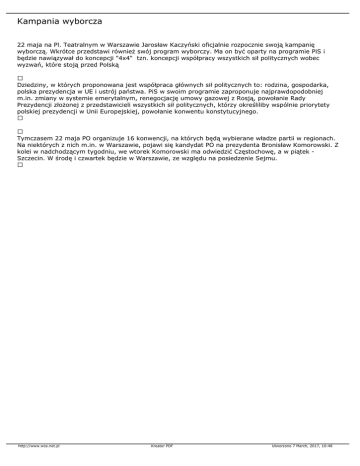 Kampania wyborcza 22 maja na Pl. Teatralnym w Warszawie Jarosław Kaczyński oficjalnie rozpocznie swoją kampanię wyborczą. Wkrótce przedstawi również swój program wyborczy. Ma on być oparty na programie PiS i będzie nawiązywał do koncepcji "4x4" tzn. koncepcji współpracy wszystkich sił politycznych wobec wyzwań, które stoją przed Polską Dziedziny, w których proponowana jest współpraca głównych sił politycznych to: rodzina, gospodarka, polska prezydencja w UE i ustrój państwa. PiS w swoim programie zaproponuje najprawdopodobniej m.in. zmiany w systemie emerytalnym, renegocjację umowy gazowej z Rosją, powołanie Rady Prezydencji złożonej z przedstawicieli wszystkich sił politycznych, którzy określiliby wspólnie priorytety polskiej prezydencji w Unii Europejskiej, powołanie konwentu konstytucyjnego. Tymczasem 22 maja PO organizuje 16 konwencji, na których będą wybierane władze partii w regionach. Na niektórych z nich m.in. w Warszawie, pojawi się kandydat PO na prezydenta Bronisław Komorowski. Z kolei w nadchodzącym tygodniu, we wtorek Komorowski ma odwiedzić Częstochowę, a w piątek Szczecin. W środę i czwartek będzie w Warszawie, ze względu na posiedzenie Sejmu. http://www.wos.net.pl Kreator PDF Utworzono 7 March, 2017, 10:48
