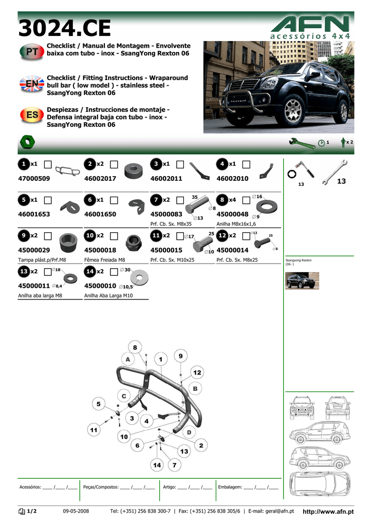 3024.CE Checklist / Manual de Montagem - Envolvente baixa com tubo - inox - SsangYong Rexton 06 Checklist / Fitting Instructions - Wraparound bull bar ( low model ) - stainless steel SsangYong Rexton 06 Despiezas / Instrucciones de montaje Defensa integral baja con tubo - inox SsangYong Rexton 06 1 1 x1 2 x2 47000509 3 x1 46002017 46002011 x2 4 x1 46002010 13 5 x1 6 x1 46001653 7 x2 46001650 9 x2 10 x2 8 x4 45000083 45000048 Prf. Cb. Sx. M8x35 Anilha M8x16x1,6 11 x2 12 x2 45000029 45000018 45000015 45000014 Tampa plást.p/Prf.M8 Fêmea Freiada M8 Prf. Cb. Sx. M10x25 Prf. Cb. Sx. M8x25 13 x2 14 x2 45000011 45000010 Anilha aba larga M8 Anilha Aba Larga M10 Acessórios: ____ /____ /____ Peças/Compostos: ____ /____ /____ 1/2 Ssangyong Rexton (06- ) 09-05-2008 Artigo: ____ /____ /____ Embalagem: ____ /____ /____ Tel: (+351) 256 838 300-7 | Fax: (+351) 256 838 305/6 | E-mail: [email protected] http://www.afn.pt 2/2 09-05-2008 Tel: (+351) 256 838 300-7 | Fax: (+351) 256 838 305/6 | E-mail: [email protected] http://www.afn.pt