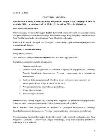 O. 0012.1.9.2016 PROTOKÓŁ NR 9/2016 z posiedzenia Komisji Rewizyjnej Rady Miejskiej w Książu Wlkp., odbytego w dniu 23 września 2016 r. w godzinach od 10: 00 do 12:15 w sali nr 7 Urzędu Miejskiego. Ad 1. Otwarcie posiedzenia. Przewodniczący Komisji Rewizyjnej Radny Krzysztof Hypki otworzył posiedzenie komisji oraz powitał obecnych członków komisji, Przewodniczącego Rady Miejskiej oraz Burmistrza Pana Teofila Marciniaka i jego Zastępcę Panią Mirelę Grześkowiak. Stwierdził, że na sali obecnych jest 7 radnych, zatem komisja była władna do podejmowania prawomocnych decyzji. Nieobecny – usprawiedliwiony : Radny Marek Molecki Lista obecności radnych stanowi załącznik nr 1 do niniejszego protokołu. Porządek posiedzenia wyglądał następująco: 1. Otwarcie posiedzenia. 2. Kontrola stanu przygotowań do działania w sytuacjach kryzysowych Gminnego Zespołu Zarządzania Kryzysowego. Przegląd i zapoznanie się z istniejącymi procedurami. 3. Kontrola dotacji przekazanych z budżetu gminy na konserwację zabytków na terenie gminy Książ Wlkp. w latach 2014 i 2015. 4. Przyjęcie protokołu z poprzedniego posiedzenia. 5. Wolne głosy i wnioski. 6. Zamknięcie posiedzenia. Przewodniczący komisji zapytał czy są uwagi bądź zapytania do przedstawionego porządku. Uwag nie było, zatem przystąpiono do realizacji poszczególnych punktów. Ad 2. Kontrola stanu przygotowań do działania w sytuacjach kryzysowych Gminnego Zespołu Zarządzania Kryzysowego. Przegląd i zapoznanie się z istniejącymi procedurami. Przewodniczący Komisji Rewizyjnej Radny Krzysztof Hypki poprosił o zabranie głosu Pana Krzysztofa Korasiaka – pracownika Urzędu Miejskiego, który merytorycznie przedstawił informację w ww. zakresie. 1 Gminny Zespół Zarządzania Kryzysowego został powołany zarządzeniem nr 5/2016 z dnia 25 stycznia 2016 r. W skład Gminnego Zespołu Zarządzania Kryzysowego wchodzą: Szef Gminnego Zespołu Kryzysowego, jego Zastępca oraz grupa robocza o charakterze stałym i grupy czasowe utworzone w razie wystąpienia realnego zagrożenia stanu i klęski żywiołowej. Organizacje, zadania, kompetencje oraz siedzibę i tryb działania Zespołu określa Regulamin Gminnego Zespołu Zarządzania Kryzysowego. Do zadań zespołu należą: 1) Ocena występujących i potencjalnych zagrożeń mogących mieć wpływ na bezpieczeństwo publiczne i prognozowanie tych zagrożeń. 2) Przygotowywanie propozycji działań i przedstawianie Burmistrzowi Książa Wlkp. wniosków dotyczących wykonania, zmiany lub zaniechania działań ujętych w gminnym planie zarządzania kryzysowego. 3) Przekazywanie do wiadomości publicznej informacji związanych z zagrożeniami. 4) Opiniowanie gminnego planu zarządzania kryzysowego. 5) Wykonywanie innych zadań z zakresu zarządzania kryzysowego zaproponowanych przez Przewodniczącego, członków zespołu lub w przypadku zaistnienia sytuacji kryzysowej. Ponadto Pan Krzysztof Korasiak, przedstawił jakie są fazy zarządzania kryzysowego począwszy od zapobiegania czyli działań uprzedzająco -eliminujących lub redukujących możliwość zaistnienia sytuacji kryzysowej. Następnie faza przygotowania gdzie kluczowym elementem przygotowań jest opracowanie planów reagowania kryzysowego, które to plany opisują kto, co i kiedy będzie robił za pomocą jakich sił i środków oraz na jakiej podstawie prawnej. Kolejna faza to reagowanie i odbudowa. Celem reagowania jest uruchamianie działań prewencyjnych, natomiast faza odbudowy kontynuuje, aż wszystkie systemy wrócą do stanu poprzedniego, albo lepszego niż poprzedni. Na posiedzeniu komisji zostały przekazane informacje na temat wykazu miejscowości przewidzianych do ewakuacji mieszkańców wraz z inwentarzem żywym w przypadku wystąpienia zagrożenia. Pan Krzysztof Korasiak poinformował o sposobach ogłaszania alarmów, a także ich rodzajów. Wyróżniamy następujące rodzaje: alarm o klęskach żywiołowych i zagrożeniu środowiska – dźwięk alarmu ciągły za pomocą syren, następnie alarm powietrzny – dźwięk modualny trwający trzy minuty, alarm o skażeniach trwający 10 sekund oraz odwołanie alarmu – dźwięk trwający 3 minuty. Przewodniczący komisji rewizyjnej Pan Krzyszof Hypki zapytał jaka jest ścieżka działań, kto – kogo informuje. Pan Krzysztof Korasiak odpowiedział że komunikacja odbywa się pomiędzy jednostką straży, policją a Urzędem. 2 Ponadto Pan Krzysztof Korasiak poinformował o magazynie przeciwpowodziowym jakim dysponujemy. Magazyn znajduje się w piwnicy - pod przedszkolem w Książu Wlkp. Magazyn jest wyposażony w plandeki, sipy, łopaty, taczki, latarki, płaszcze, ponton, oraz czarną folię. Z pewnością jak poinformował Pan Korasiak magazyn w miarę możliwości dysponowania środkami finansowymi będzie sukcesywnie doposażony. Radna Antonina Jankowiak zapytała czy w 2016 roku była jakaś akcja nosząca znamiona zagrożenia? Krzysztof Korasiak poinformował, że była nawałnica w sierpniu. Ucierpiały głównie drzewostany. Szczegółowe informacje w ww. zakresie stanowią załącznik nr 2 do niniejszego protokołu. Ad 3. Kontrola dotacji przekazanych z budżetu gminy na konserwację zabytków na terenie gminy Książ Wlkp. w latach 2014 i 2015. Przewodniczący Komisji Rewizyjnej poprosił o zabranie głosu przez pracownika tut. Urzędu Pana Waldemara Szymańskiego, który przedstawił sprawozdanie z udzielonych dotacji w 2014 i 2015 r. Zasady udzielania dotacji na prace konserwatorskie, restauratorskie lub roboty budowlane określa uchwala Rady Miejskiej w Książu Wlkp. Nr III/9/2010 z dnia 20 grudnia 2010 r. W roku 2014 Gmina Książ Wlkp. udzieliła dotacji celowych na: 1) remont południowej połaci dachu nad nawą kościoła parafialnego p.w. N.M.P. Niepokalanej Poczętej we Włościejewkach, w kwocie 15 000, 00 zł., 2) renowację elewacji wraz z osuszeniem murów obwodowych kościoła parafialnego p.w. Św. Marcina Bisk