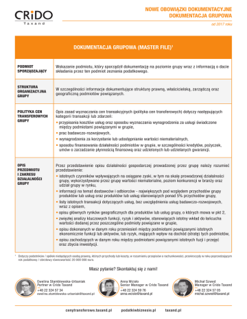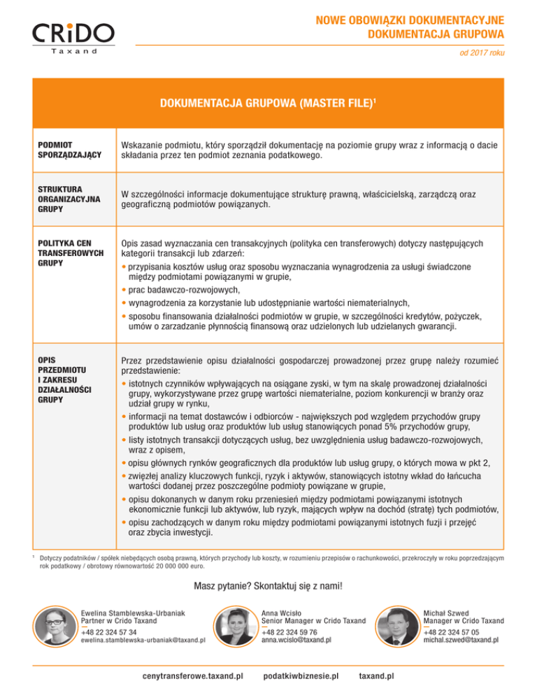 NOWE OBOWIĄZKI DOKUMENTACYJNE DOKUMENTACJA GRUPOWA od 2017 roku DOKUMENTACJA GRUPOWA (MASTER FILE)1 1 PODMIOT SPORZĄDZAJĄCY Wskazanie podmiotu, który sporządził dokumentację na poziomie grupy wraz z informacją o dacie składania przez ten podmiot zeznania podatkowego. STRUKTURA ORGANIZACYJNA GRUPY W szczególności informacje dokumentujące strukturę prawną, właścicielską, zarządczą oraz geograficzną podmiotów powiązanych. POLITYKA CEN TRANSFEROWYCH GRUPY Opis zasad wyznaczania cen transakcyjnych (polityka cen transferowych) dotyczy następujących kategorii transakcji lub zdarzeń: • przypisania kosztów usług oraz sposobu wyznaczania wynagrodzenia za usługi świadczone między podmiotami powiązanymi w grupie, • prac badawczo-rozwojowych, • wynagrodzenia za korzystanie lub udostępnianie wartości niematerialnych, • sposobu finansowania działalności podmiotów w grupie, w szczególności kredytów, pożyczek, umów o zarzadzanie płynnością finansową oraz udzielonych lub udzielanych gwarancji. OPIS PRZEDMIOTU I ZAKRESU DZIAŁALNOŚCI GRUPY Przez przedstawienie opisu działalności gospodarczej prowadzonej przez grupę należy rozumieć przedstawienie: • istotnych czynników wpływających na osiągane zyski, w tym na skalę prowadzonej działalności grupy, wykorzystywane przez grupę wartości niematerialne, poziom konkurencji w branży oraz udział grupy w rynku, • informacji na temat dostawców i odbiorców - największych pod względem przychodów grupy produktów lub usług oraz produktów lub usług stanowiących ponad 5% przychodów grupy, • listy istotnych transakcji dotyczących usług, bez uwzględnienia usług badawczo-rozwojowych, wraz z opisem, • opisu głównych rynków geograficznych dla produktów lub usług grupy, o których mowa w pkt 2, • zwięzłej analizy kluczowych funkcji, ryzyk i aktywów, stanowiących istotny wkład do łańcucha wartości dodanej przez poszczególne podmioty powiązane w grupie, • opisu dokonanych w danym roku przeniesień między podmiotami powiązanymi istotnych ekonomicznie funkcji lub aktywów, lub ryzyk, mających wpływ na dochód (stratę) tych podmiotów, • opisu zachodzących w danym roku między podmiotami powiązanymi istotnych fuzji i przejęć oraz zbycia inwestycji. Dotyczy podatników / spółek niebędących osobą prawną, których przychody lub koszty, w rozumieniu przepisów o rachunkowości, przekroczyły w roku poprzedzającym rok podatkowy / obrotowy równowartość 20 000 000 euro. Masz pytanie? Skontaktuj się z nami! Ewelina Stamblewska-Urbaniak Partner w Crido Taxand Anna Wcisło Senior Manager w Crido Taxand Michał Szwed Manager w Crido Taxand +48 22 324 57 34 +48 22 324 59 76 [email protected] +48 22 324 57 05 [email protected] [email protected] cenytransferowe.taxand.pl podatkiwbiznesie.pl taxand.pl NOWE OBOWIĄZKI DOKUMENTACYJNE DOKUMENTACJA GRUPOWA od 2017 roku WARTOŚCI NIEMATERIALNE Opis posiadanych, tworzonych, rozwijanych i wykorzystywanych w działalności przez grupę istotnych wartości niematerialnych. W szczególności: • ogólny opis strategii grupy podmiotów powiązanych w zakresie opracowania, posiadania oraz wykorzystania wartości niematerialnych, w tym lokalizacji głównych ośrodków prowadzących prace badawczo-rozwojowe oraz miejsca zarządzania tymi pracami, • lista wartości niematerialnych lub pakietów tych wartości należących do podmiotów powiązanych w grupie, które są istotne dla kwestii wyceny warunków transakcji lub innych zdarzeń zachodzących między podmiotami powiązanymi, wraz z informacją, które z tych podmiotów są prawnymi właścicielami tych wartości, • lista istotnych umów lub porozumień między podmiotami powiązanymi dotyczących wartości niematerialnych, w tym umów o wspólnych przedsięwzięciach, umów o prowadzenie prac badawczo-rozwojowych oraz umów licencyjnych, • informacja na temat zmian właściciela ekonomicznego lub prawnego praw własności lub zmian podmiotu korzystającego z wartości niematerialnych w danym roku podatkowym, w tym informacje, jakich podmiotów dotyczy taka sytuacja, kraju siedziby tych podmiotów oraz wypłaconego z tego tytułu wynagrodzenia lub kompensaty. SYTUACJA FINANSOWA GRUPY Opis sytuacji finansowej podmiotów powiązanych tworzących grupę, w szczególności: • informacje o sposobie finansowania w ramach grupy podmiotów powiązanych przez podmioty niezależne, • lista otrzymanych istotnych kredytów oraz pożyczek wraz z opisem warunków, na jakich zostały one przyznane, • skonsolidowane sprawozdanie finansowe grupy. UPRZEDNIE POROZUMIENIA CENOWE Opis zawartych przez podmioty tworzące grupę porozumień w sprawach podatku dochodowego z administracjami podatkowymi państw innych niż Rzeczpospolita Polska, w tym jednostronnych uprzednich porozumień cenowych. Źródło: • Ustawa o podatku dochodowym od osób prawnych w brzmieniu obowiązującym od 1 stycznia 2017 r. • Projekt rozporządzenia Ministra Finansów z lipca 2015 r. w sprawie szczegółowego opisu elementów stanowiących dokumentację podatkową. Masz pytanie? Skontaktuj się z nami! Ewelina Stamblewska-Urbaniak Partner w Crido Taxand Anna Wcisło Senior Manager w Crido Taxand Michał Szwed Manager w Crido Taxand +48 22 324 57 34 +48 22 324 59 76 [email protected] +48 22 324 57 05 [email protected] [email protected] cenytransferowe.taxand.pl podatkiwbiznesie.pl taxand.pl