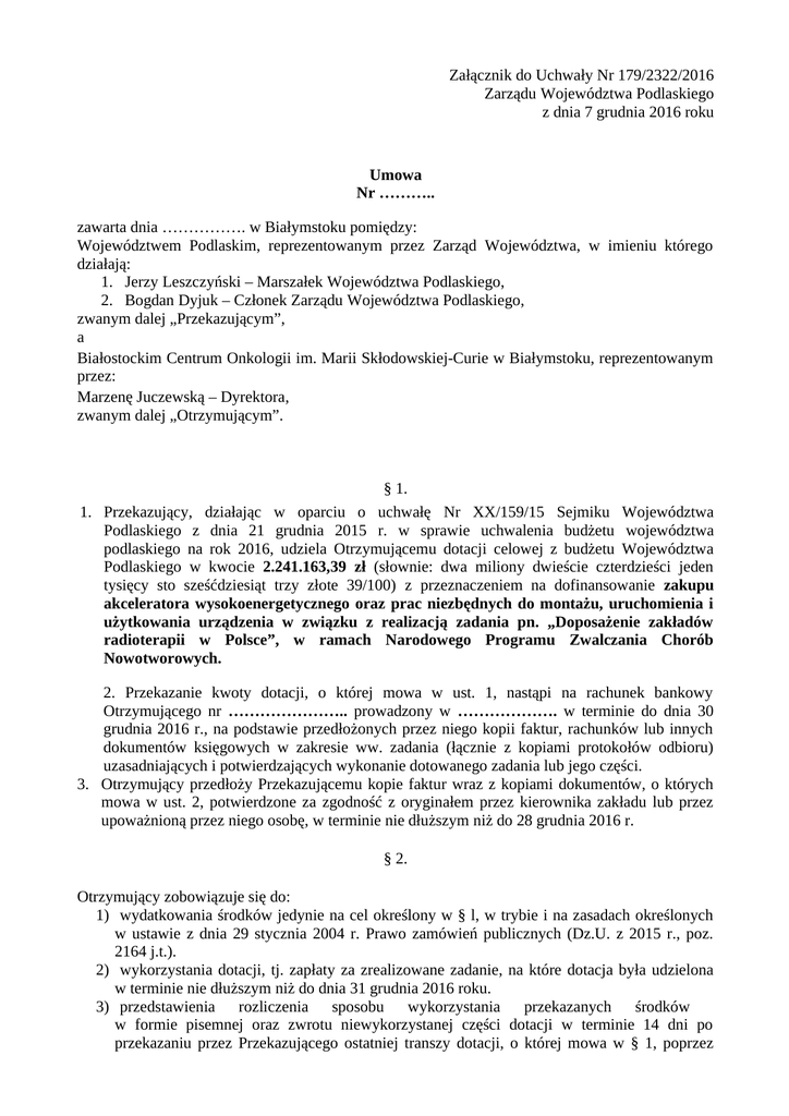 Załącznik do Uchwały Nr 179/2322/2016 Zarządu Województwa Podlaskiego z dnia 7 grudnia 2016 roku Umowa Nr ……….. zawarta dnia ……………. w Białymstoku pomiędzy: Województwem Podlaskim, reprezentowanym przez Zarząd Województwa, w imieniu którego działają: 1. Jerzy Leszczyński – Marszałek Województwa Podlaskiego, 2. Bogdan Dyjuk – Członek Zarządu Województwa Podlaskiego, zwanym dalej „Przekazującym”, a Białostockim Centrum Onkologii im. Marii Skłodowskiej-Curie w Białymstoku, reprezentowanym przez: Marzenę Juczewską – Dyrektora, zwanym dalej „Otrzymującym”. § 1. 1. Przekazujący, działając w oparciu o uchwałę Nr XX/159/15 Sejmiku Województwa Podlaskiego z dnia 21 grudnia 2015 r. w sprawie uchwalenia budżetu województwa podlaskiego na rok 2016, udziela Otrzymującemu dotacji celowej z budżetu Województwa Podlaskiego w kwocie 2.241.163,39 zł (słownie: dwa miliony dwieście czterdzieści jeden tysięcy sto sześćdziesiąt trzy złote 39/100) z przeznaczeniem na dofinansowanie zakupu akceleratora wysokoenergetycznego oraz prac niezbędnych do montażu, uruchomienia i użytkowania urządzenia w związku z realizacją zadania pn. „Doposażenie zakładów radioterapii w Polsce”, w ramach Narodowego Programu Zwalczania Chorób Nowotworowych. 2. Przekazanie kwoty dotacji, o której mowa w ust. 1, nastąpi na rachunek bankowy Otrzymującego nr ………………….. prowadzony w ………………. w terminie do dnia 30 grudnia 2016 r., na podstawie przedłożonych przez niego kopii faktur, rachunków lub innych dokumentów księgowych w zakresie ww. zadania (łącznie z kopiami protokołów odbioru) uzasadniających i potwierdzających wykonanie dotowanego zadania lub jego części. 3. Otrzymujący przedłoży Przekazującemu kopie faktur wraz z kopiami dokumentów, o których mowa w ust. 2, potwierdzone za zgodność z oryginałem przez kierownika zakładu lub przez upoważnioną przez niego osobę, w terminie nie dłuższym niż do 28 grudnia 2016 r. § 2. Otrzymujący zobowiązuje się do: 1) wydatkowania środków jedynie na cel określony w § l, w trybie i na zasadach określonych w ustawie z dnia 29 stycznia 2004 r. Prawo zamówień publicznych (Dz.U. z 2015 r., poz. 2164 j.t.). 2) wykorzystania dotacji, tj. zapłaty za zrealizowane zadanie, na które dotacja była udzielona w terminie nie dłuższym niż do dnia 31 grudnia 2016 roku. 3) przedstawienia rozliczenia sposobu wykorzystania przekazanych środków w formie pisemnej oraz zwrotu niewykorzystanej części dotacji w terminie 14 dni po przekazaniu przez Przekazującego ostatniej transzy dotacji, o której mowa w § 1, poprzez przedłożenie dokumentów potwierdzających wykorzystanie środków dotacji oraz zwrot niewykorzystanej części dotacji. 4) przedstawienia końcowego rozliczenia sposobu wykorzystania przekazanych środków w formie pisemnej z uwzględnieniem danych, o których mowa w art. 116 ust. 2 i 3 ustawy z dnia 15 kwietnia 2011 r. o działalności leczniczej (Dz. U. z 2016 r. poz. 1638 j.t.), niezwłocznie po sporządzeniu sprawozdania finansowego za rok obrotowy, w którym Otrzymujący otrzymał środki finansowe. 5) dołożenia należytej staranności i rzetelności dla realizacji celów wynikających z niniejszej umowy. 6) umożliwienia w każdym czasie, przedstawicielowi Przekazującego przeprowadzenia kontroli przedmiotu umowy w szczególności w zakresie zgodności z prawem, celowości, gospodarności i rzetelności oraz do udzielania na żądanie Województwa pisemnych informacji o przebiegu oraz zaawansowaniu wykonania zadania. § 3. W przypadku stwierdzenia wykorzystania dotacji niezgodnie z przeznaczeniem (przez co należy rozumieć inny niż określony w umowie sposób jej wykorzystania) lub pobranej nienależnie lub w nadmiernej wysokości, Otrzymujący zobowiązany jest do zwrotu dotacji wraz z odsetkami w wysokości ustalonej jak dla zaległości podatkowych - na zasadach określonych w ustawie z dnia 27 sierpnia 2009 roku o finansach publicznych (Dz.U. z 2016 r. poz. 1870). § 4. Niniejsza umowa wiąże strony od chwili podpisania. § 5. Wszelkie zmiany niniejszej umowy wymagają formy pisemnej pod rygorem nieważności. § 6. Ewentualne spory mogące wyniknąć między stronami w związku z realizacją niniejszej umowy będą rozpatrywane przez sąd właściwy dla siedziby Przekazującego. § 7. W sprawach nieuregulowanych niniejszą umową mają zastosowanie przepisy Kodeksu cywilnego, ustawy o finansach publicznych oraz inne powszechnie obowiązujące przepisy prawa. § 8. Niniejszą umowę sporządzono w czterech jednobrzmiących egzemplarzach, w tym jeden dla Otrzymującego. Otrzymujący Przekazujący Kontrasygnata Skarbnika Województwa Podlaskiego
