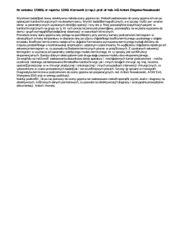 Nr wniosku: 172603, nr raportu: 12342. Kierownik (z rap.): prof. dr hab. inż. Antoni Zbigniew Nowakowski Wynikiem badań jest nowa, obiektywna metoda oceny gojenia ran. Metodę zastosowano do oceny gojenia się ran po operacjach kardiochirurgicznych na otwartym sercu. Wyniki badań termograficznych, a w szczególności porównanie obrazów parametrycznych uzyskanych dzień po operacji i trzy dni później pozwalają na klasyfikację pacjentów kardiochirurgicznych na grupy osób, których proces leczenia jest prawidłowy, pozwalający na wczesne wypisanie do domu i grupę wymagającą przedłużonej obserwacji w warunkach klinicznych. Procedura oceny stanu gojenia rany polega na sporządzaniu przy pomocy kamery podczerwieni termogramów obrazujących zmiany temperatury w obszarze rany po użyciu chłodzącego bodźca termicznego uzyskanego z układu kriostatu. Bodźcowi termicznemu nadaje się w układzie formowania wymuszenia termicznego kształt zbliżony do impulsu prostokątnego o kontrolowanej amplitudzie i ustalonym czasie trwania. Po wyłączeniu chłodzenia rejestruje się sekwencje termogramów, co pozwala na śledzenie termicznych procesów przejściowych. Z uzyskanych sekwencji termogramów wyznacza się parametry zastępczego modelu termicznego, który opisany jest sumą funkcji eksponencjalnych. Bardzo dobrym deskryptorem jest druga stała czasowa modelu dwu-eksponencjalnego. Ze względu na możliwość zastosowania stosunkowo taniej aparatury – niechłodzonych kamer podczerwieni - można oczekiwać istotnego zainteresowania tą metodą w kardiochirurgii jak i innych działach chirurgii ogólnej, leczenia oparzeń, przeszczepów w chirurgii plastycznej i onkologicznej i innych przypadkach interwencji chirurgicznych, co udowodniono w czasie prowadzonych badań, jak i we wcześniejszym pracach. Szczegóły opisano w monografii Diagnostyka termiczna w podczerwieni do oceny gojenia ran pooperacyjnych, red. Antoni Nowakowski, AOW Exit, Warszawa 2015 oraz w szeregu publikacji. Należy podkreślić, że po raz pierwszy do oceny gojenia ran zastosowano metodę opierając wyniki analiz i diagnozy na obiektywnych, ilościowych danych pomiarowych, co pozwala na obiektywizację diagnozy i wiarygodne prowadzenie dokumentacji historii choroby.
