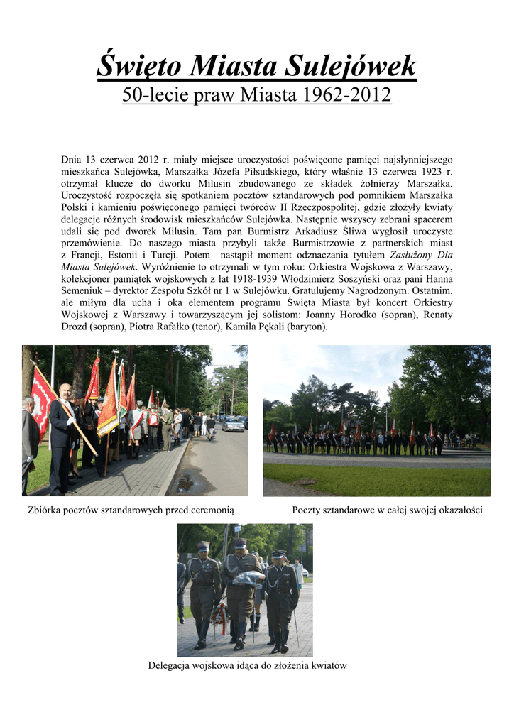 Święto Miasta Sulejówek 50-lecie praw Miasta 1962-2012 Dnia 13 czerwca 2012 r. miały miejsce uroczystości poświęcone pamięci najsłynniejszego mieszkańca Sulejówka, Marszałka Józefa Piłsudskiego, który właśnie 13 czerwca 1923 r. otrzymał klucze do dworku Milusin zbudowanego ze składek Ŝołnierzy Marszałka. Uroczystość rozpoczęła się spotkaniem pocztów sztandarowych pod pomnikiem Marszałka Polski i kamieniu poświęconego pamięci twórców II Rzeczpospolitej, gdzie złoŜyły kwiaty delegacje róŜnych środowisk mieszkańców Sulejówka. Następnie wszyscy zebrani spacerem udali się pod dworek Milusin. Tam pan Burmistrz Arkadiusz Śliwa wygłosił uroczyste przemówienie. Do naszego miasta przybyli takŜe Burmistrzowie z partnerskich miast z Francji, Estonii i Turcji. Potem nastąpił moment odznaczania tytułem ZasłuŜony Dla Miasta Sulejówek. WyróŜnienie to otrzymali w tym roku: Orkiestra Wojskowa z Warszawy, kolekcjoner pamiątek wojskowych z lat 1918-1939 Włodzimierz Soszyński oraz pani Hanna Semeniuk – dyrektor Zespołu Szkół nr 1 w Sulejówku. Gratulujemy Nagrodzonym. Ostatnim, ale miłym dla ucha i oka elementem programu Święta Miasta był koncert Orkiestry Wojskowej z Warszawy i towarzyszącym jej solistom: Joanny Horodko (sopran), Renaty Drozd (sopran), Piotra Rafałko (tenor), Kamila Pękali (baryton). Zbiórka pocztów sztandarowych przed ceremonią Poczty sztandarowe w całej swojej okazałości Delegacja wojskowa idąca do złoŜenia kwiatów Przemówienie Burmistrza z partnerskiego miasta w Estonii. Przemówienie Burmistrza z partnerskiego miasta we Francji. Gospodyni Milusina - pani Jadwiga Piłsudska Jaraczewska w towarzystwie syna i gości z: Turcji, Estonii i Francji Burmistrz miasta pan Arkadiusz Śliwa w towarzystwie pana posła i pana przewodniczącego rady miasta Uroczystość poprowadził pan Jacek Zalewski a Orkiestra Wojskowa z Warszawy pięknie grała! Muzeum I Marszałka Polski Józefa Piłsudskiego w Sulejówku zaprasza! Oprac: Karol Ciemięga IIIc Gim.