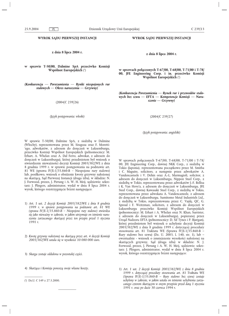 25.9.2004 Dziennik Urzędowy Unii Europejskiej PL WYROK SĄDU PIERWSZEJ INSTANCJI z dnia 8 lipca 2004 r. w sprawie T-50/00, Dalmine SpA przeciwko Komisji Wspólnot Europejskich (1) C 239/13 WYROK SĄDU PIERWSZEJ INSTANCJI z dnia 8 lipca 2004 r. w sprawach połączonych T-67/00, T-68/00, T-71/00 i T-78/ 00, JFE Engineering Corp. i in. przeciwko Komisji Wspólnot Europejskich (1) (Konkurencja — Porozumienia — Rynki niespojonych rur stalowych — Okres naruszenia — Grzywny) (2004/C 239/26) (Konkurencja Porozumienia — Rynek rur i przewodów stalowych bez szwu — EFTA — Kompetencje Komisji — Naruszenie — Grzywny) (Język postępowania: włoski) (2004/C 239/27) (Język postępowania: angielski) W sprawie T-50/00, Dalmine SpA, z siedzibą w Dalmine (Włochy), reprezentowana przez M. Siragusa oraz F. Moretti'ego, adwokatów, z adresem do doręczeń w Luksemburgu, przeciwko Komisji Wspólnot Europejskich (pełnomocnicy: M. Erhart, A. Whelan oraz A. Dal Ferro, adwokat, z adresem do doręczeń w Luksemburgu), której przedmiotem był wniosek o stwierdzenie nieważności decyzji Komisji 2003/382/WE z dnia 8 grudnia 1999 r. w sprawie postępowania na podstawie art. 81 WE (sprawa IV/E-1/35.860-B – Niespojone rury stalowe) lub, posiłkowo, wniosek o obniżenie kwoty grzywny nałożonej na skarżącą, Sąd Pierwszej Instancji (druga izba), w składzie: N. J. Forwood, prezes, J. Pirrung i A. W. H. Meij, sędziowie; sekretarz: J. Plingers, administrator, wydał w dniu 8 lipca 2004 r. wyrok, którego rozstrzygnięcie brzmi następująco: 1) Art. 1 ust. 2 decyzji Komisji 2003/382/WE z dnia 8 grudnia 1999 r. w sprawie postępowania na podstawie art. 81 WE (sprawa IV/E-1/35.860-B – Niespojone rury stalowe) stwierdza się jako nieważny w zakresie, w jakim utrzymuje on istnienie naruszenia zarzucanego skarżącej przez ten przepis przed 1 stycznia 1991 r. 2) Kwotę grzywny nałożonej na skarżącą przez art. 4 decyzji Komisji 2003/382/WE ustala się w wysokości 10 080 000 euro. 3) Skarga zostaje oddalona w pozostałej części. 4) Skarżąca i Komisja ponoszą swoje własne koszty. (1) Dz.U. C 149 z 27.5.2000. W sprawach połączonych T-67/00, T-68/00, T-71/00 i T-78/ 00, JFE Engineering Corp., dawnej NKK Corp., z siedzibą w Tokio (Japonia), reprezentowana początkowo przez M. Smitha i C. Maguire, solicitors, a następnie przez adwokatów A. Vandencasteele i V. Dehin oraz A.-L. Marmagioli, solicitor, z adresem do doręczeń w Luksemburgu, Nippon Steel Corp., z siedzibą w Tokio, reprezentowana przez adwokatów J.-F. Bellisa i K. Van Hove'a, z adresem do doręczeń w Luksemburgu, JFE Steel Corp., dawnej Kawasaki Steel Corp., z siedzibą w Tokio, reprezentowana przez adwokata A. Vandencasteele, z adresem do doręczeń w Luksemburgu, Sumitomo Metal Industriels Ltd., z siedzibą w Tokio, reprezentowana przez C. Vajdę, QC, G. Sproul i F. Weitzman, solicitors, z adresem do doręczeń w Luksemburgu przeciwko Komisji Wspólnot Europejskich (pełnomocnicy: M. Erhart i A. Whelan oraz N. Khan, barrister, z adresem do doręczeń w Luksemburgu), popieranej przez Urząd Nadzoru EFTA (pełnomocnicy: D. Sif Tynes i P. Bjørgan), której przedmiotem był wniosek o uchylenie decyzji Komisji 2003/382/WE z dnia 8 grudnia 1999 r. dotyczącej procedury stosowania art. 81 Traktatu WE (Sprawa IV/E-1/35.860-B – Rury stalowe bez szwu) (Dz. U. 2003, L 140, str. 1), lub – ewentualnie - wniosek o zmniejszenie wysokości nałożonej na skarżących grzywny, Sąd (druga izba) w składzie: N. J. Forwood, prezes, J. Pirrung i A. W. H. Meij, sędziowie; sekretarz: J. Plingers, administrator, wydał w dniu 8 lipca 2004 r. wyrok, którego rozstrzygnięcie brzmi następująco: 1) Art. 1 ust. 2 decyzji Komisji 2003/382/WE z dnia 8 grudnia 1999 r. dotyczącej procedury stosowania art. 81 Traktatu WE (Sprawa IV/E-1/35.860-B – Rury stalowe bez szwu) zostaje uchylony w zakresie, w jakim ustala on istnienie uchybienia zarzucanego czterem skarżącym w owym przepisie przed datą 1 stycznia 1991 r. oraz po dacie 30 czerwca 1994 r.