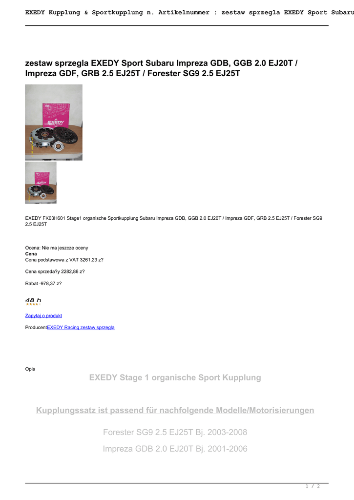 zestaw sprzegla EXEDY Sport Subaru Impreza GDB, GGB 2.0