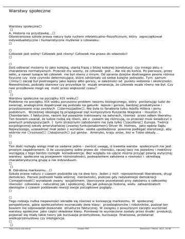 Warstwy społeczne Warstwy społeczne A. Historia na przystawkę... Oświeceniowa szkoła prawa natury była ruchem intelektualno-filozoficznym, który zapoczątkował indywidualistyczne i humanistyczne myślenie o człowieku: Człowiek jest wolny! Człowiek jest równy! Człowiek ma prawo do własności! Dziś odbierać możemy to jako kolejną, utartą frazę z bliżej kolejnej konstytucji czy innego aktu o charakterze normatywnym. Przecież my wiemy, że człowiek jest... Ale nie do końca. Po pierwsze, przez setki, a nawet tysiące lat człowiek nie był równy z innym. Od zarania dziejów dostrzegano pewne różnice fizyczne czy inne czynniki determinujące, które odróżniały od siebie kolejne jednostki. Tym samym inny zaczął był postrzegany jako lepszy albo gorszy, w zależności od punktu widzenia i okoliczności. Niewolnictwo, podziały stanowe czy przywileje to wszak emanacja, że człowiek wcale równy nie był. Czy nasi przodkowie mogli się mylić przez większość czasu? Warstwy społeczne na początku XIX wieku Podobnie na początku XIX wieku poruszono problem rasizmu biologicznego, który porównując ludzi do zwierząt, analogicznie dopatrywał się podziału na gatunki lepsze i gorsze, bardziej produktywne i przystosowane oraz zwykłych darmozjadów. Nie była to fanaberia tylko Adolfa Hitlera i jemu podobnym. Wcześniej ideologię tą propagował zięć kompozytora Ryszarda Wagnera - Houston S. Chamberlain. I faktycznie, rasizm był poważnie traktowany na salonach, również przez odłam liberalny. Ten bowiem uważał, że ludzie rodzą się równi, ale z czasem się różnicują, co przecież musi świadczyć o pewnych predyspozycjach. I tymi strasznymi zabobonami nie żyła tylko zacofana Europa. Twórca socjologicznej szkoły amerykańskiej (zwanej funkcjonalizmem) Oliver W. Holmes, jako sędzia Sądu Najwyższego, uzasadniać miał jeden z wyroków: osoba upośledzona powinna podlegać sterylizacji, aby wtórnie nie roznosić skażonych już genów. Ameryko, kraju snów, ileż w Tobie obłudy... Ten dość rozległy wstęp miał za zadanie jedno - zwrócić uwagę, iż kwestia warstw społecznych nie jest prostym zagadnieniem. O ile uzurpujemy sobie prawo do równości, raczej tacy nie jesteśmy i niektórzy wyciągają z tego bardzo rozległe konsekwencje. Bez względu na ujęcie można przyjąć pewną wytyczną: warstwy społeczne są przejawem różnorodności; podważeniem założenia o równości i określają charakterystyczną grupę a nie indywiduum. B. Odrobina marksizmu... Szkoła prawa natury z czasem podzieliła się na dwa tory. Jeden z nich reprezentowali liberałowie, drugi demokraci. Pierwsi podnosili hasła wtórnej nierówności, podczas gdy radykalniejsi demokracji zmajstrowali wynalazek zwany socjalizmem. Uporczywie pozostawali przy założeniu o całkowitej równości człowieka - naturalnej jak i społecznej. Ale jak pokazuje historia, wielu zatwardziałych ideologów z czasem poddawało rewizji swoje początkowe poglądy. Tego rodzaju nutka niepewności wkradła się również w koncepcję marksizmu. W społecznej perspektywie, gdzie społeczeństwo wyznaczały dwie klasy: przedsiębiorców i robotników, podział ten bowiem nie odpowiadał doskonale strukturze faktycznej. W związku z powyższym zaczęto wyróżniać warstwy społeczne jako części składowe klasy. Ponieważ te wyznaczone zostały przez środki produkcji, pojawiać się miały takie twory jak burżuazja przemysłowa, burżuazja finansowa, proletariat wielkoprzemysłowy czy inteligencja. http://www.wos.net.pl Kreator PDF Utworzono 7 March, 2017, 10:48 C. Esencja zagadnienia... Koncepcja, która pozostawała w świadomości musiała z czasem zostać nazwana. Podjął się tego nikt inny, jak Max Weber. Kolejny sukces dopisany do jego rozległego, abstrakcyjnego CV- będąc nazywanym ojcem socjologii, wprowadził doń wiele pojęć. Wg. Webera warstwa społeczna była przykładem zróżnicowania społecznego i wyznaczała pewien zbiór, charakteryzujący się szczególną genezą. Ta z kolei mogła opierać się na jednej z trzech podstaw: 1. Warstwa społeczna jako podzbiór klasy Ujęcie w zasadzie podobne do koncepcji marksistowskiej oznaczało wewnątrz-klasową segmentację oraz różnorodność nawet w tak integralnej grupie, jaką jest klasa społeczna. 2. Warstwa społeczna to kategoria społeczno-zawodowa Wyodrębnienie grup, ze względu na miejsce i rolę w społeczeństwie, którego swoistą hierarchię wyznaczał poziom prestiżu (honoru). Stanowisko podobne reprezentował W. L. Warner. 3. Warstwa społeczna jako subkultura Choć Weber nie używał wprost tego określenia, myślę, że może być one uznane za trafne. Warstwa miałaby być grupą ludzi żyjących w zbliżonych warunkach, tworząc wspólną kulturę, obyczaje, styl życia i normy. Czynniki te determinował wiek, wspólne poglądy (w tym najbardziej integrująca niechęć do czynnika czy instytucji) czy rodzaj pracy. Nieodłącznie dołącza się do tej charakterystyki zakres i formę uczestnictwa grupy w konsumpcji dóbr, czy to kulturalnych czy materialnych. Należy pamiętać, że elementy warstwy społecznej podobnie jak klasy są zawsze spojone wewnętrznymi zależnościami, które implikują odrębność tworu. Gwarancję bezpieczeństwa, jaka niezbędna jest każdemu człowiekowi zapewnia poczucie przynależności a to z kolei prowadzi do poczucia odrębności. Odrębność dysocjuje na postawy wyższości albo, rzadziej niższości. Warstwa jest trwałą i istotną grupą odniesienia a wykluczenie jednostki z niej może prowadzić do całkowitej alienacji. Ponieważ bardziej utożsamiamy się z przedstawicielami grup, z którymi stykamy się na co dzień tudzież z tymi na które pozwalają nam zrealizować imperatywy, solidaryzm w obrębie warstw jest większy niż w obrębie klasy czy nawet społeczeństwa. Dlatego też obecność w nieformalnej grupie młodzieżowej może być bard