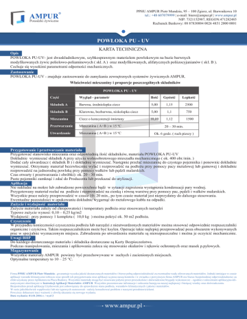PPHU AMPUR Piotr Mundzia, 95 – 100 Zgierz, ul. Barwnikowa 10 tel.: +48 607079999 | e-mail: [email protected] | www.ampur.pl NIP: 7321152987, REGON:471282485 Rachunek Bankowy: 08 87830004 0026 4851 2000 0001 R POWŁOKA PU - UV KARTA TECHNICZNA Opis POWŁOKA PU-UV- jest dwuskładnikowym, szybkosprawnym materiałem powłokowym na bazie barwnych modyfikowanych żywic poliolowo-poliaminowych ( skł. A ) oraz modyfikowanych, alifatycznych poliizocyjanianów ( skł. B ). Cechuje się wysokimi parametrami odporności mechanicznych. Zastosowanie POWŁOKA PU-UV - znajduje zastosowanie do zamykania zewnętrznych systemów żywicznych AMPUR. Właściwości mieszaniny i proporcje poszczególnych składników POWŁOKA PU - UV Część Wygląd - parametr Ilość Gęstość Lepkość Składnik A Barwna, średniolepka ciecz 5,00 1,15 2500 Składnik B Klarowna, bezbarwna, niskolepka ciecz 5,00 1,1 750 Mieszanina Ciecz o konsystencji śmietany 10,00 1,12 1500 Przetwarzanie Mieszanina ( A+B ) w 15 ºC 20 – 30 min. Utwardzanie Mieszanina ( A+B ) w 15 ºC Ok. 6 godz. ( ruch pieszy ) Przygotowanie i przetwarzanie materiału Przygotować stanowisko mieszania oraz odpowiednią ilość składników, materiału POWŁOKA PU-UV Dokładnie wymieszać składnik A przy użyciu wolnoobrotowego mieszadła mechanicznego ( ok. 400 obr./min. ) Dodać cały utwardzacz ( składnik B ) i dokładnie wymieszać. Następnie przelać mieszaninę do czystego pojemnika i ponownie dokładnie wymieszać. Otrzymany materiał bezzwłocznie wylać i rozprowadzić na podłożu przy pomocy pacy metalowej lub gumowej i dokładnie rozprowadzić na jednorodnę powłokę przy pomocy wałków lub pędzli malarskich. Czas otwarty ( przetwarzania i obróbki): ok. 20 - 30 min. Puste pojemniki zamknąć i zdać do Producenta lub przekazać do utylizacji. Aplikacja Nie nakładać na mokre lub zabrudzone powierzchnie bądź w sytuacji zagrożenia wystąpienia kondensacji pary wodnej. Przygotowany materiał rozlać na podłoże i rozprowadzić na cienką i równą warstwę przy pomocy pac, pędzli i wałków malarskich. Wszystkie prace należy przeprowadzić w czasie 10- 20 min., po tym czasie materiał jest nieprzydatny do dalszego stosowania. Ewentualne pozostałości w opakowaniu dokładnie wygarnąć do metalowego kubła na odpadki. Zużycie i wydajność materiału Zużycie materiału zależy od chropowatości i temperatury podłoża oraz stosowanych narzędzi Typowe zużycie wynosi: 0,10 – 0,25 kg/m2 Wydajność: przy pomocy 1 kompletu ( 10,0 kg ) można pokryć ok. 50 m2 podłoża. Czyszczenie W przypadku konieczności czyszczenia podłoża lub narzędzi z nieutwardzonych materiałów można stosować odpowiednie rozpuszczalniki organiczne i czyściwa. Takim rozpuszczalnikiem może być ksylen. Operacje takie najlepiej przeprowadzać poza obszarem wykonywanych prac w specjalnie wyznaczonym miejscu. Zabrudzenia po utwardzeniu materiału są nierozpuszczalne i można je oczyścić mechanicznie. Uwagi BHP Do każdego dostarczanego materiału i składnika dostarczane są Karty Bezpieczeństwa. Podczas manipulowania, mieszania i aplikowania zaleca się stosowanie okularów i rękawic ochronnych oraz masek p.pyłowych. Magazynowanie Wszystkie materiały AMPUR powinny być przechowywane w suchych i zacienionych miejscach. Optymalne temperatury to 10 – 25 °C. Firma PPHU AMPUR Piotr Mundzia - gwarantuje wysoka jakość dostarczanych materiałów i bierze pełną odpowiedzialność za ewentualne wady oferowanych materiałów. Jednak istniejące w czasie aplikacji warunki klimatyczno-robocze oraz sposób ich przygotowania oraz aplikacji są poza naszą kontrola i w związku z powyższym firma AMPUR nie bierze bezpośredniej odpowiedzialności za efekt uzyskany przez Aplikatura na Placu Budowy. Wszystkie materiały mogą być stosowane jedynie przez przeszkolone i doświadczone brygady wykonawcze – zgodnie z zaleceniami aplikacyjno-klimatycznymi określonymi w Instrukcji Aplikacji Materiałów AMPUR. Wszystkie prezentowane informacje i zalecenia bazują na naszej najlepszej i bieżącej wiedzy oraz doświadczeniu. Bezpośrednio przed aplikacją Użytkownik jest zobowiązany do sprawdzenie stanu podłoża, warunków klimatycznych i jakości materiałów. W razie jakichkolwiek wątpliwości lub nie typowych zastosowań - należy konsultować problem z naszymi przedstawicielami. Powyższy dokument traci ważność z chwilą ukazania się nowego wydania. Data wydania: 01.01.2016 r. / wyd 2