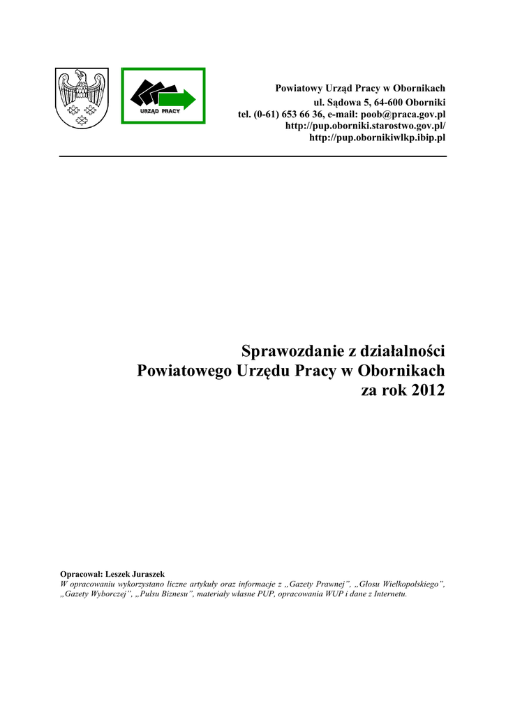 Powiatowy Urząd Pracy w Obornikach ul. Sądowa 5, 64-600 Oborniki tel. (0-61) 653 66 36, e-mail: [email protected] http://pup.oborniki.starostwo.gov.pl/ http://pup.obornikiwlkp.ibip.pl Sprawozdanie z działalności Powiatowego Urzędu Pracy w Obornikach za rok 2012 Opracował: Leszek Juraszek W opracowaniu wykorzystano liczne artykuły oraz informacje z „Gazety Prawnej”, „Głosu Wielkopolskiego”, „Gazety Wyborczej”, „Pulsu Biznesu”, materiały własne PUP, opracowania WUP i dane z Internetu. I. Poziom i dynamika bezrobocia 1. Wielkość bezrobocia Na koniec grudnia 2012r. w Polsce zarejestrowanych było 2136,8 osób (1982,7 osób na koniec grudnia 2011r.), w woj. wielkopolskim 147.9 tys. osób (137.335 na koniec grudnia 2011r.). W Powiecie Obornickim 2.664 osoby. W stosunku do grudnia roku poprzedniego liczba wzrosła o 403 osoby, tj. aż o 17,8%. Tabela 1. Liczba bezrobotnych na koniec grudnia w latach 2009-2012 Liczba bezrobotnych na koniec grudnia 2009 2010 2011 2012 2034 2177 2261 2664 1.1 Bezrobocie wg gmin Największy wzrost bezrobocia zanotowano na koniec grudnia w gminie Oborniki – o 21%. Najmniejszy wzrost nastąpił w gminie Rogoźno – o 11,3%. Wykres 1. Bezrobocie wg gmin (stan na koniec grudnia w latach 2010 – 2012) str. 2 Oborniki 2013 2. Stopa bezrobocia W kraju stopa bezrobocia wyniosła na koniec grudnia 2012 roku 13,4% (XII.2011 – 12.5%). W województwie wielkopolskim – 9.9% ( XII.2011 – 9,2%). W powiecie obornickim 12,1 % (w grudniu 2011 – 10,6%) Tabela 2. Stopa bezrobocia w województwie wielkopolskim oraz w Powiecie Obornickim w poszczególnych miesiącach 2012r. I Województwo 9,7 11,4 Powiat II 10,0 11,9 III 9,9 11,8 IV 9,5 11,8 V 9,3 11,8 VI 9,0 11,6 VII 9,0 11,7 VIII 9,0 11,8 IX 9,1 11,6 X 9,2 11,5 XI 9,5 11,9 XII 9,9 12,1 Tabela 3. Stopa bezrobocia w porównaniu z ościennymi powiatami Powiat Stopa bezrobocia w porównaniu z ościennymi powiatami XII.2011 10,6 10,9 14,7 15,7 15,9 3,7 Obornicki Szamotulski Czarnkowsko-Trzcianecki Chodzieski Wągrowiecki Poznański XII.2012 12,1 11,6 15,2 16,9 22,0 4,7 2.1 Zatrudnienie w regionach wg województw, powiatów i miast. Rynek pracy w regionach był i nadal jest bardzo zróżnicowany. Najłatwiej o pracę było w Wielkopolsce – 9,9% (stopa bezrobocia), na Mazowszu – 10,8% i na Śląsku – 11,5%. Najtrudniej w woj. Warmińsko-Mazurskim – 21,2% i w Zachodniopomorskim – 18,1%. Wzrost stopy bezrobocia w grudniu 2012 roku, w porównaniu z grudniem 2011 roku wystąpił we wszystkich województwach. Stopa bezrobocia w poszczególnych województwach: Dolnośląskie – 13, Śląskie – 11,1 Kujawsko – Pomorskie – 17,9 Świętokrzyskie – 15,8 Lubelskie – 14,1 Warmińsko-Mazurskie – 21,2 Łódzkie – 14,0 Wielkopolskie – 9,9 Małopolskie – 11,5 Zachodnio-Pomorskie – 18,1 Mazowieckie – 10,8 Podlaskie – 14,6 Opolskie – 14,2 Pomorskie – 13,4 Podkarpackie – 16,3 str. 3 Oborniki 2013 Najwyższa stopa bezrobocia wystąpiła w powiecie Szydłowieckim, - 37,6%, Braniewskim – 30,9% i Radomskim – 30,7%. Najniższa stopa bezrobocia wystąpiła w Poznaniu – 4,2%, Warszawie – 4,4%, Sopocie – 4,6%, Wrocławiu – 5,8% i Krakowie – 5,9%. 3. Nowe zarejestrowania i wyłączenia z ewidencji Na poziom bezrobocia wpływa z jednej strony ilość rejestrujących się bezrobotnych, a z drugiej, ilość bezrobotnych wyłączonych z ewidencji z różnych przyczyn. W okresie 12 m-cy 2012 roku zarejestrowało się 3938 osób (w 2011 – 3667), najwięcej w miesiącu listopadzie – 387 osób, a wyłączono 3545 osób (w 2011 – 3583). Główną przyczyną wyłączania z ewidencji było podjęcie pracy przez 1690 osób – 47,7%. Kolejnym powodem był brak gotowości do podjęcia pracy – 1069 osób (30,1%) i dobrowolna rezygnacja – 169 osób (4,8%). 4. Zwolnienia, zwolnienia grupowe W 2012 roku otrzymaliśmy kolejne zawiadomienia o planowanym przeprowadzeniu zwolnień grupowych z terenu Powiatu Obornickiego, które dotyczyły 75 osób z następujących zakładów pracy: 1) CARGOTEC Poland Sp. z o.o. Oddział w Kowanowie Zwolnienie w ww. zakładzie pracy wiązało się z likwidacją oddziału spółki w Kowanowie. Podjęcie decyzji o zamknięciu oddziału spowodowane było czynnikami ekonomiczno-organizacyjnymi. Zwolnienia nastąpiły w terminie od 30 września do 31 grudnia 2012r. i objęły 35 osób, tj. wszystkich zatrudnionych. Powiatowy Urząd Pracy w Obornikach zorganizował w dn. 12.09.2012r. spotkanie informacyjne dla pracowników ww. zakładu pracy. Jego celem było uzgodnienie szczegółów i tematów możliwego wsparcia ze strony Urzędu Pracy dla osób zwalnianych, które znalazły się w nowej, niezmiernie dla nich trudnej sytuacji. Wszelkie informacje dotyczące funkcjonowania Urzędu oraz form wsparcia dla osób objętych zwolnieniem grupowym zostały również przekazane uczestnikom spotkania w formie folderów i ulotek. str. 4 Oborniki 2013 1) Przedsiębiorstwo Wielobranżowe TOMBUD Tomasz Wicherek z siedzibą w Obornikach. Przyczyną zwolnień były zmiany organizacyjne – likwidacja wydziałów oraz sytuacja ekonomiczna pracodawcy. Zgłoszono zamiar zwolnienia 40 osób, z czego do końca 2012r. zwolniono 8 osób. Zamiar przeprowadzenia zwolnień grupowych w 2012 roku zgłosiły również: PKO BP, PZU, Borilla Polska. W tych przypadkach odnotowaliśmy brak informacji o zwolnieniach osób z terenu Powiatu Obornickiego. Warto zauważyć, że w 2012r. obserwowaliśmy wzmożony napływ osób rejestrujących się w tutejszym Urzędzie, których ostatnimi pracodawcami były firmy zlokalizowane również na terenie Powiatu Obornickiego, tj. DT SWISS – Polska Sp. z o.o. oraz FAM Cynkowanie Ogniowe S.A. PUP Oborniki nawiązał kontakt z ww. firmami. Na podstawie rozmów telefonicznych uzyskano informacje, że przeprowadzone zwolnienia, w świetle przepisów prawa pracy nie mają charakteru zwolnień grupowych. II. Struktura bezrobocia 1. Bezrobotni z prawem i bez 