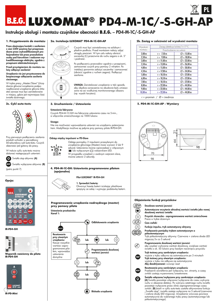 PL B.E.G. LUXOMAT ® PD4-M-1C/-S-GH-AP Instrukcja obsługi i montażu czujników obecności B.E.G. – PD4-M-1C/-S-GH-AP 1. Przygotowanie do montażu Prace obejmujące kontakt z zasilaniem z sieci 230V powinny być przeprowadzone przez wykwalifikowanych profesjonalistów lub przez przeszkolone osoby pod kierunkiem i nadzorem wykwalifikowanego elektryka, zgodnie z przepisami elektrotechnicznymi. 2a. Instalacja LUXOMAT® PD4-M-1C-GH-AP C blokowanie aktywacja Urządzenie nie jest przystosowane do bezpiecznego odłączania zasilania sieciowego. W trybie pracy „Master/Slave” (Urządzenie główne/urządzenia podporządkowane) urządzenie główne (Master) zawsze musi być zainstalowane w miejscu, gdzie jest najmniejsza ilość światła dziennego. Zasięg (detekcja kolista) T=17°C Wysokość montażu Czujnik musi być zainstalowany na solidnym i płaskim podłożu. Przed montażem należy zdjąć okrągły pierścień. W tym celu należy obrócić soczewkę (C) przeciwnie do ruchu zegara o ok. 5° i podnieść. Przechodzenie na wskroś 2,00 m 2,50 m 3,00 m 3,50 m 4,00 m 4,50 m 5,00 m 6,00 m 7,00 m 8,00 m 9,00 m 10,00 m Po podłączeniu przewodów zgodnie z przepisami, zamocować czujnik przy pomocy 2 wkrętów. Po instalacji ponownie założyć soczewkę i zamocować (obrócić zgodnie z ruchem zegara). Podłączyć zasilanie. Przed przystąpieniem do montażu należy odłączyć zasilanie! 2c. Cykl auto-testu 2b. Zasięg w zależności od wysokości montażu UWAGA: Zainstalować urządzenie w taki sposób, aby obydwa oznaczenia na obudowie były umieszczone na osi wzdłużnej monitorowanego obszaru (np. wysoki korytarz). Ø = 15,00 m Ø = 18,00 m Ø = 22,00 m Ø = 26,00 m Ø = 30,00 m Ø = 34,00 m Ø = 37,00 m Ø = 37,00 m Ø = 37,00 m Ø = 44,00 m Ø = 44,00 m Ø = 44,00 m r = 7,50 m r = 9,00 m r = 11,00 m r = 13,00 m r = 15,00 m r = 17,00 m r = 18,50 m r = 18,50 m r = 18,50 m r = 22,00 m r = 22,00 m r = 22,00 m r = promień / Ø = średnica 5. PD4-M-1C-GH-AP - Wymiary 3. Uruchomienie / Ustawienia Ustawienia fabryczne Czujnik PD4-M-1C-GH ma fabryczne ustawienie czasu na 5 min., a włącznika zmierzchowego na 1000 luksów. 21 Uwaga: Nie ma możliwości wprowadzenia ustawień na urządzeniu potencjometrem. Modyfikacje możliwe są jedynie przy pomocy pilota IR-PD4-GH. W trakcie cyklu auto-testu można dokonać następujących ustawień: Światło stop aktywne: (A) Odstęp między impulsami w PD-Slave 9s 2s LED ON LED OFF 44 Przy pierwszym podłączeniu zasilania produkt wchodzi w początkowy 60-sekundowy cykl auto-testu. Czujnik obecności jest gotowy do pracy. Odstęp pomiędzy 2 impulsami przesyłanymi do urządzenia głównego (Master) może wynosić 2 lub 9 sekund. Ustawienia można wprowadzać z włączonym ( ) lub wyłączonym ( ) wskaźnikiem LED. W przypadku urządzeń z osobnym wejściem slave, można ustawić 2 sekundy. 98 70 98 Światło wyłączone aktywne: (B) (patrz punkt 7) 4. PD4-M-1C-GH: Ustawienia programowane pilotem (opcjonalne) Pilot LUXOMAT® IR-PD4-GH Opcja: 1. Sprawdzić baterię: Otworzyć kasetę baterii ściskając plastikowe sprężyny ze sobą i wyjmując podstawkę baterii. Programowanie urządzenia nadrzędnego (master) przy pomocy pilota Objaśnienia funkcji przycisków �� ���� ��� ��� Odblokowanie urządzenia Resetowanie przy otwartym urządzeniu: Kasuje wszystkie wartości zaprogramowane pilotem, wprowadza ustawienia domyślne HA HA ON OFF �� ������� ��� lub lub + + lub lub IR-PD-Mini �� �� ��� ��� Przycisk słoneczka - zaprogramowana wartość zmierzchowa Praca w trybie dziennym Czas zwłoki Funkcja impulsu, tryb automatyczny aktywny IR-PD4-GH Wspornik naścienny do pilota IR-PD4-GH Docelowa wartość jasności Automatyczne wczytanie aktualnej wartości światła jako nowej docelowej wartości światła Ustawienia przekaźnika Kanał 1: Programowanie docelowej wartości jasności �� ����� ��� HA OFF Blokada urządzenia Przełączanie pomiędzy trybem automatycznym a półautomatycznym Tryb półautomatyczny aktywny: Czerwona + zielona dioda LED migoczą 3x co 5 sekund Programowanie docelowej wartości jasności aby uzyskać wyliczoną wartość docelową, zwiększa wartość światła o ok. 50 luksów przy każdym naciśnięciu przycisku Tryb testowy przy zamkniętym urządzeniu: wyjście z trybu odbywa się automatycznie po 3 minutach Tryb testowy przy otwartym urządzeniu: wyjście z trybu nie odbywa się automatycznie Aby dezaktywować: wcisnąć reset Resetowanie przy zamkniętym urządzeniu Przekaźnik oświetlenia jest wyłączony, tzn. otwarty, a czasy zwłoki zostają wyzerowane /zresetowane. Światło włączone/wyłączone przy zamkniętym urządzeniu (A) Światło pozostaje włączone/wyłączone do czasu wykrycia ruchu w obszarze detekcji. Po wykryciu ostatniego ruchu światło pozostaje wyłączone przez okres zaprogramowanego czasu zwłoki. (B) Jeżeli w cyklu auto-testu została aktywowana funkcja „Światło stop”, światło zostaje wyłączone na 5 sekund (czerwone i zielone diody LED migoczą). Urządzenie wówczas powraca automatycznie do wybranego trybu pracy (automatycznego lub półautomatycznego). 6. T ryb automatyczny/ półautomatyczny (funkcje IR-PD patrz strona 1) 13. F unkcjonalne wskaźniki LED, wykrywanie błędów 10. Schematy połączeń Tryb standardowy z 1-kanałowymi czujnikami obecności typu master (N/O) z zaciskami R i S HA OFF Tryb w pełni automatyczny W tym trybie pracy światło zapala się i gaśnie automatycznie, dla większego komfortu, zależnie od obecności i jasności. Czerwona i zielona dioda LED wskazujące na tryb auto-testu (przez 60 sekund po podłączeniu zasilania) HA Tryb półautomatyczny (Tryb półautomatyczny ON można uruchomić tylko pilotem!) W tym trybie pracy, aby uzyskać większe oszczędności, światło zostaje aktywowane tylko po ręcznym włączeniu. Wyłączenie odbywa się automatycznie. Try
