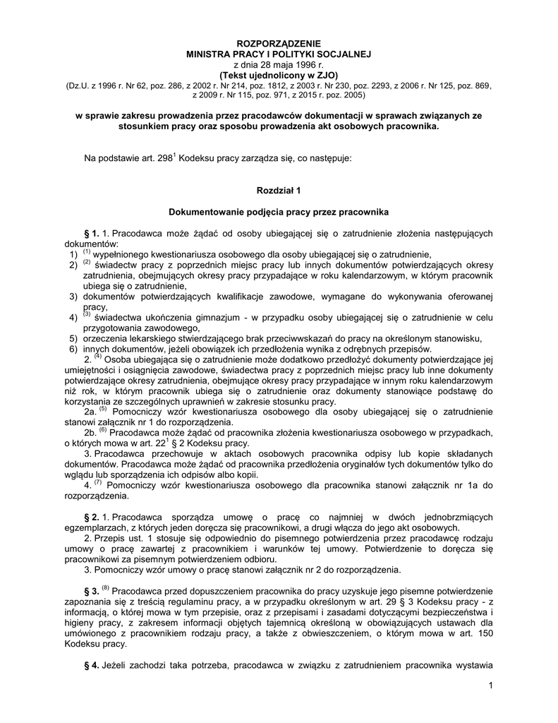 ROZPORZĄDZENIE MINISTRA PRACY I POLITYKI SOCJALNEJ z dnia 28 maja 1996 r. (Tekst ujednolicony w ZJO) (Dz.U. z 1996 r. Nr 62, poz. 286, z 2002 r. Nr 214, poz. 1812, z 2003 r. Nr 230, poz. 2293, z 2006 r. Nr 125, poz. 869, z 2009 r. Nr 115, poz. 971, z 2015 r. poz. 2005) w sprawie zakresu prowadzenia przez pracodawców dokumentacji w sprawach związanych ze stosunkiem pracy oraz sposobu prowadzenia akt osobowych pracownika. 1 Na podstawie art. 298 Kodeksu pracy zarządza się, co następuje: Rozdział 1 Dokumentowanie podjęcia pracy przez pracownika § 1. 1. Pracodawca może żądać od osoby ubiegającej się o zatrudnienie złożenia następujących dokumentów: (1) 1) wypełnionego kwestionariusza osobowego dla osoby ubiegającej się o zatrudnienie, (2) 2) świadectw pracy z poprzednich miejsc pracy lub innych dokumentów potwierdzających okresy zatrudnienia, obejmujących okresy pracy przypadające w roku kalendarzowym, w którym pracownik ubiega się o zatrudnienie, 3) dokumentów potwierdzających kwalifikacje zawodowe, wymagane do wykonywania oferowanej pracy, (3) 4) świadectwa ukończenia gimnazjum - w przypadku osoby ubiegającej się o zatrudnienie w celu przygotowania zawodowego, 5) orzeczenia lekarskiego stwierdzającego brak przeciwwskazań do pracy na określonym stanowisku, 6) innych dokumentów, jeżeli obowiązek ich przedłożenia wynika z odrębnych przepisów. (4) 2. Osoba ubiegająca się o zatrudnienie może dodatkowo przedłożyć dokumenty potwierdzające jej umiejętności i osiągnięcia zawodowe, świadectwa pracy z poprzednich miejsc pracy lub inne dokumenty potwierdzające okresy zatrudnienia, obejmujące okresy pracy przypadające w innym roku kalendarzowym niż rok, w którym pracownik ubiega się o zatrudnienie oraz dokumenty stanowiące podstawę do korzystania ze szczególnych uprawnień w zakresie stosunku pracy. (5) 2a. Pomocniczy wzór kwestionariusza osobowego dla osoby ubiegającej się o zatrudnienie stanowi załącznik nr 1 do rozporządzenia. (6) 2b. Pracodawca może żądać od pracownika złożenia kwestionariusza osobowego w przypadkach, 1 o których mowa w art. 22 § 2 Kodeksu pracy. 3. Pracodawca przechowuje w aktach osobowych pracownika odpisy lub kopie składanych dokumentów. Pracodawca może żądać od pracownika przedłożenia oryginałów tych dokumentów tylko do wglądu lub sporządzenia ich odpisów albo kopii. (7) 4. Pomocniczy wzór kwestionariusza osobowego dla pracownika stanowi załącznik nr 1a do rozporządzenia. § 2. 1. Pracodawca sporządza umowę o pracę co najmniej w dwóch jednobrzmiących egzemplarzach, z których jeden doręcza się pracownikowi, a drugi włącza do jego akt osobowych. 2. Przepis ust. 1 stosuje się odpowiednio do pisemnego potwierdzenia przez pracodawcę rodzaju umowy o pracę zawartej z pracownikiem i warunków tej umowy. Potwierdzenie to doręcza się pracownikowi za pisemnym potwierdzeniem odbioru. 3. Pomocniczy wzór umowy o pracę stanowi załącznik nr 2 do rozporządzenia. (8) § 3. Pracodawca przed dopuszczeniem pracownika do pracy uzyskuje jego pisemne potwierdzenie zapoznania się z treścią regulaminu pracy, a w przypadku określonym w art. 29 § 3 Kodeksu pracy - z informacją, o której mowa w tym przepisie, oraz z przepisami i zasadami dotyczącymi bezpieczeństwa i higieny pracy, z zakresem informacji objętych tajemnicą określoną w obowiązujących ustawach dla umówionego z pracownikiem rodzaju pracy, a także z obwieszczeniem, o którym mowa w art. 150 Kodeksu pracy. § 4. Jeżeli zachodzi taka potrzeba, pracodawca w związku z zatrudnieniem pracownika wystawia 1 legitymację służbową, przepustkę albo inny dokument upoważniający pracownika do przebywania na terenie zakładu pracy lub załatwiania spraw służbowych poza zakładem. § 5. Jeżeli świadectwo pracy przedłożone przez pracownika zawiera wzmiankę o zajęciu wynagrodzenia za pracę, pracodawca zawiadamia o zatrudnieniu takiego pracownika komornika prowadzącego postępowanie egzekucyjne oraz pracodawcę, który wydał świadectwo (art. 884 § 3 Kodeksu postępowania cywilnego). Rozdział 2 Prowadzenie akt osobowych i dokumentacji w sprawach związanych ze stosunkiem pracy § 6. 1. Pracodawca zakłada i prowadzi oddzielne dla każdego pracownika akta osobowe. 2. Akta osobowe pracownika składają się z 3 części i obejmują: 1) w części A - dokumenty zgromadzone w związku z ubieganiem się o zatrudnienie, określone w przepisach § 1 ust. 1 i 2; 2) w części B - dokumenty dotyczące nawiązania stosunku pracy oraz przebiegu zatrudnienia pracownika, w tym: (9) a) umowę o pracę, a jeżeli umowa nie została zawarta na piśmie - potwierdzenie ustaleń co do rodzaju umowy oraz jej warunków, a także zakres czynności (zakres obowiązków), jeżeli pracodawca dodatkowo w tej formie określił zadania pracownika wynikające z umowy o pracę, a (23) a) dokumenty dotyczące wykonywania pracy w formie telepracy, (10) b) pisemne potwierdzenie zapoznania się przez pracownika z przepisami i informacjami określonymi w § 3 oraz zaświadczenia o ukończeniu wymaganego szkolenia w zakresie bezpieczeństwa i higieny pracy, (11) c) oświadczenie pracownika będącego rodzicem lub opiekunem dziecka, o zamiarze lub o braku 1 zamiaru korzystania z uprawnień określonych w przepisach wymienionych w art. 189 Kodeksu pracy, d) dokumenty dotyczące powierzenia pracownikowi mienia z obowiązkiem zwrotu albo do wyliczenia się, e) dokumenty związane z podnoszeniem przez pracownika kwalifikacji zawodowych, f) oświadczenia dotyczące wypowiedzenia pracownikowi warunków umowy o pracę lub zmiany tych warunków w innym trybie, g) dokumenty związane z przyznaniem pracownikowi nagrody lub wyróżnienia oraz wymierzeniem kary porządkowej, (24) h) dokumenty związane z korzystaniem przez pracownika z urlopu macierzyńskiego, urlopu na warunkach urlopu macierzyńskiego, urlopu rodzicielskiego, urlopu ojcowskiego i urlopu wy