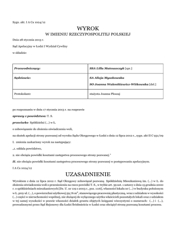Sygn. akt. I A Ca 1024/12 WYROK W IMIENIU RZECZYPOSPOLITEJ POLSKIEJ Dnia 28 stycznia 2013 r. Sąd Apelacyjny w Łodzi I Wydział Cywilny w składzie: Przewodniczący: SSA Lilla Mateuszczyk [spr.] Sędziowie: SA Alicja Myszkowska SO Joanna Walentkiewicz-Witkowska [del.] Protokolant: stażysta Joanna Płoszaj po rozpoznaniu w dniu 17 stycznia 2013 r. na rozprawie sprawy z powództwa: T. S. przeciwko Spółdzielni (...) w Ł. o zobowiązanie do złożenia oświadczenia woli, na skutek apelacji strony pozwanej od wyroku Sądu Okręgowego w Łodzi z dnia 12 lipca 2012 r., sygn. akt II C 931/09 I. zmienia zaskarżony wyrok na następujący: „1. oddala powództwo, 2. nie obciąża powódki kosztami zastępstwa procesowego strony pozwanej.” II. nie obciąża powódki kosztami zastępstwa procesowego strony pozwanej w postępowaniu apelacyjnym. I A Ca 1024/12 UZASADNIENIE Wyrokiem z dnia 12 lipca 2012 r. Sąd Okręgowy zobowiązał pozwaną Spółdzielnię Mieszkaniową im. (...) w Ł. do złożenia oświadczenia woli o przeniesieniu na rzecz powódki T. S., w trybie art. 39 ust. 1 ustawy z dnia 15 grudnia 2000 r. o spółdzielniach mieszkaniowych [Dz. U. nr 119 z 2003 r., poz. 1116], własności lokalu nr (...) w budynku położonym w Ł. przy ul. (...), o powierzchni użytkowej 59,76 m2, stanowiącego pracownię plastyczną, wraz z udziałem w wysokości (...) części w nieruchomości wspólnej, nie służącej do wyłącznego użytku właścicieli pozostałych lokali oraz z udziałem w tej samej wysokości w prawie własności działek gruntu objętych księgami wieczystymi o numerach: (...) i (...), prowadzonymi przez Sąd Rejonowy dla Łodzi Śródmieścia w Łodzi oraz obciążył stronę pozwaną kosztami procesu. Podstawę faktyczną tego rozstrzygnięcia stanowiły poczynione przez Sąd ustalenia, szczegółowo opisane w uzasadnieniu wyroku. Ustalenia te Sąd Apelacyjny podziela i przyjmuje za własne. Sąd Okręgowy przyjął, że spełnione zostały w objętym sporem przypadku, wszystkie przesłanki art. 39 ust. 1 ustawy o spółdzielniach mieszkaniowych, tj.: powódka jest najemcą pracowni plastycznej wykorzystywanej przez nią do prowadzenia działalności artystycznej, poniosła w pełni ona i jej poprzednik prawny [A. S.] koszty budowy tego lokalu, dokonała spłaty z tytułu udziału w nieruchomości wspólnej i nie posiada zadłużenia z tytułu świadczeń wynikających z umowy najmu. Na realizację roszczenia z powołanego przepisu, w trybie sądowym, pozwala powódce, która nie jest członkiem Spółdzielni, art. 64 kc w zw. z art. 1047 § 1 kpc wobec odmowy realizacji wniosku powódki przez stronę pozwaną. Spłata kredytu zaciągniętego na wzniesienie budynku w części przypadającej na sporny lokal nastąpiła poprzez uiszczanie przez powódkę i jej poprzednika prawnego, w okresie od września 1975 r. do lutego 1991 r., comiesięcznych rat tego kredytu w opłatach za użytkowanie lokalu oraz poprzez jednorazową wpłatę kwoty 120.868 zł. [przed denominacją] w lutym 1991 r., wskazanej przez (...)[poprzednika prawnego pozwanej Spółdzielni] jako kwota kredytu pozostająca do spłaty. Wprawdzie rata spłaty kredytu – 196 zł. i odsetki od kredytu w wysokości 13.788 zł. pojawiły się jako osobna pozycja kalkulacji czynszu najmu dopiero po podpisaniu przez strony w dniu 30 czerwca 1990 r. aneksu do umowy najmu, ale o obowiązku objęcia czynszem najmu także spłaty kredytów inwestycyjnych spółdzielni przypadających na zajmowany lokal, stanowił art. 11 ust. 1, a po dniu 28 lutego 1983 r. – art. 14 ust. 3 ustawy z dnia 10 kwietnia 1974 r. Prawo lokalowe [Dz. U. nr 30 z 1987 r., poz. 165]. Inicjatywa jednorazowej spłaty reszty kredytu wyszła od (...), ponieważ ze względu na znaczny wzrost oprocentowania kredytów, Spółdzielnia dążyła do spłaty całego, pozostałego do uregulowania kredytu, zaciągniętego na przedmiotowe zadanie inwestycyjne. Aneks do umowy zawarty po dokonaniu przez powódkę jednorazowej spłaty nie zawierał już, jako składnika czynszu, raty spłaty kredytu. Spłata kredytu wraz z odsetkami dokonana przez powódkę i jej poprzednika prawnego osiągnęła łączną kwotę 260.64,30 zł., stanowiącą pokrycie pełnych kosztów budowy przedmiotowego lokalu, co potwierdziło również wyliczenie biegłego sądowego R. P.. Powódka dokonała także, w toku procesu, wpłaty na rzecz strony pozwanej kwoty 12.434,30 zł. z tytułu pokrycia kosztów inwestycji w budynku, w części przypadającej na objęty sporem lokal, tj. kosztów termomodernizacji, wymiany dźwigów, prac związanych z założeniem telewizji kablowej i Internetu oraz kosztów nabycia gruntu przypadających na pracownię plastyczną, z uwzględnieniem udzielonej Spółdzielni bonifikaty, czyli w wysokości rzeczywiście przez Spółdzielnię poniesionej. W chwili wyrokowania powódka nie miała żadnych zaległości czynszowych z tytułu najmu lokalu. Wobec spełnienia wszystkich przesłanek art. 39 ust. 1 ustawy o spółdzielniach mieszkaniowych, żądanie pozwu Sąd Okręgowy uznał za uzasadnione, zatem podlegające uwzględnieniu. Za nieuzasadniony uznał Sąd zarzut strony pozwanej o braku możliwości wyodrębnienia lokalu w budynku przy ul. (...) wobec nieuregulowania praw Spółdzielni do wszystkich działek składających się na jednobudynkową nieruchomość wspólną, oznaczoną symbolem I-4. Uwzględnieniu powództwa nie stała na przeszkodzie, zdaniem Sądu, okoliczność braku tytułu prawnego strony pozwanej do działek o numerach ewidencyjnych (...)i (...), składających się, wraz z działkami o numerach: (...), (...), (...)i (...), na nieruchomość wspólną oznaczoną symbolem(...). Wprawdzie proponowana przez stronę pozwaną koncepcja podziału jej zasobów na odrębne nieruchomości, w tym nieruchomość (...), [uchwała nr (...)Zebrania Przedstawicieli Członków Spółdzielni Mieszkaniowej im. W. J. w Ł. z dnia 29 maja 2002 r. – k.