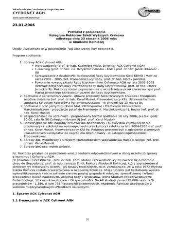23.01.2006 Protokół z posiedzenia Kolegium Rektorów Szkół Wyższych Krakowa odbytego dnia 23 stycznia 2006 roku w Akademii Rolniczej Osoby uczestnicz±ce w posiedzeniu - wg zał±czonej listy obecno¶ci. Program spotkania: 1. Sprawy ACK Cyfronet AGH Wprowadzenie (prof. dr hab. Kazimierz Wiatr, Dyrektor ACK Cyfronet AGH) E-learning (prof. dr hab. inż. Krzysztof Zieliński - AGH i prof. dr hab. Jacek Urbaniec UJ) Sprawozdanie z działalno¶ci Krakowskiej Rady Użytkowników Sieci KDMO i MAN za okres 2003 - 2005 (ref. Przewodnicz±cy Rady, prof. dr hab. Marek Jarnicki). Powołanie nowego składu Rady Użytkowników Cyfronetu AGH na lata 2006-2008 (referuje dotychczasowy Przewodnicz±cy Rady Użytkowników, prof. dr hab. Marek Jarnicki). Pp. Rektorzy zostali poproszeni s± o wcze¶niejsze przekazanie na ręce prof. Marka Jarnickiego kandydatur uczelni do Rady Użytkowników. 2. Spotkanie z parlamentarzystami - główne problemy Szkół Wyższych Krakowa i Małopolski, wspólne działania (ref. prof. dr hab. Karol Musioł, Przewodnicz±cy KR). Ustalenie terminu spotkania Kolegium Rektorów z Parlamentarzystami - w dniu 06 lub 13 marca br. 3. Spotkanie z prof. Jerzym Buzkiem (dot. VII Programu) i Premierem Kazimierzem Marcinkiewiczem - propozycje pytań do Premierów K. Marcinkiewicza i J. Buzka (ref. prof. dr hab. Karol Musioł) 4. Bezpieczeństwo na uczelniach - proponowany termin spotkania 10 luty 2006, pi±tek, godz. 10.00, sala Nr 30 Collegium Novum UJ (ref. prof. Karol Musioł). 5. Rozstrzygnięcie dot. nagrody KRSZWK dla dziennikarzy i publicystów zajmuj±cych się problematyk± szkolnictwa wyższego, nauki oraz kultury i sztuki - za lata 2004-2005 (ref. prof. dr hab. Karol Musioł, Przewodnicz±cy KR) Pp. Rektorzy proszeni byli o zgłoszenie pisemnych uzasadnionych kandydatur do nagród dla dzien-nikarzy - w kategorii ogólnopolskiej i ¶rodowiskowej. 6. Sprawy dot. współpracy z Urzędem Marszałkowskim Województwa Małopol-skiego (ref. prof. dr hab. Karol Musioł). 7. Sprawy bież±ce, wolne wnioski. Pp. Rektorzy przybyli na posiedzenie wraz z osobami odpowiedzialnymi w danej uczelni za sprawy e-learningu i Cyfronetu AGH. Po powitaniu Uczestników - prof. dr hab. Karol Musioł, Przewodnicz±cy KR zwrócił się o zabranie głosu do Gospodarza, prof. dr hab. Janusza Żmiji, Rektora Akademii Rolniczej, który zaprezentował skrótowy rys historyczny Uczelni i Jej sprawy teraĽniejsze, m.in. zaznaczaj±c, że w roku 1972 Wyższa Szkoła Rolnicza została przekształcona w Akademię Rolnicz±. Misj± Uczelni jest kształcenie wysoko wykwalifikowanych kadr w zakresie szeroko pojętej gospodarki rolniczej, żywno¶ciowej i le¶nej i prowadzenie badań naukowych. Uczelnia liczy 7 Wydziałów, jedno Studium Międzywydziałowe Biotechnologii, 12 kierunków studiów i 24 specjalno¶ci. Na AR studiuje ponad 13.000 osób. Ilo¶ć pracowników - 1.380, w tym 735 nauczycieli akademickich. Akademia Rolnicza współpracuje z wieloma międzynarodowymi o¶rodkami naukowymi. 1. Sprawy ACK Cyfronet AGH 1.1 E-nauczanie w ACK Cyfronet AGH [1] Generalny punkt widzenia na ACK Cyfronet AGH przedstawił i wprowadzenia do tematu dokonał prof. dr hab. Kazimierz Wiatr, Dyrektor Cyfronetu AGH, Senator RP. Prof. Wiatr m.in. zaznaczył, że ACK Cyfronet AGH jest afiliowane przy AGH, natomiast pełni funkcje Centrum ¦rodowiskowego, służ±cego wszystkim krakowskim uczelniom. Podstawowe zadanie i misja Cyfronetu - to udostępnianie mocy obliczeniowej oraz innych usług informatycznych, budowa i utrzymywanie, rozwój infrastruktury oraz realizacja prac badawczych i badawczo-rozwojowych, a także innych prac wdrożeniowych w zakresie nowoczesnej technologii. Wszystkie te cele maj± służyć m.in. zaspokojeniu potrzeb krakowskich uczelni czy regionu, oraz zapewnieniu najwyższej jako¶ci usług ¶wiadczonych przez Cyfronet. Służy temu jego struktura: 4 działy merytoryczne: sieci komputerowych, komputerów dużej mocy, oprogramowania oraz archiwizacji i bezpieczeństwa danych. Pracy Cyfronetu AGH patronuje Rada Użytkowników, w skład której wchodz± przed-stawiciele uczelni krakowskich, instytutów badawczych oraz Urzędu Miasta i Sejmiku Wojewódzkiego. Do 31 grudnia 2005 roku Przewodnicz±cym Rady Użytkowników był prof. dr hab. Marek Jarnicki - UJ. Prof. Wiatr złożył na ręce prof. Jarnickiego podziękowanie - dla Niego i całej Rady - za pracę w tym Gremium. Zasoby Cyfronetu i obszary jego aktywno¶ci to: komputery dużej mocy obliczeniowej miejska sieć komputerowa i usługi sieciowe, szerokie usługi w zakresie oprogramowania, archiwizacji bezpieczeństwa danych, projekty badawcze (m.in. pozwalaj±ce na odnawianie bazy sprzętowej), oraz organizowane przez Cyfronet konferencje. Dyrektor Wiatr zwrócił następnie uwagę na sprawnie działaj±c±, o wysokiej nieza-wodno¶ci, sieć komputerow± i jej elementy składowe (infrastruktura kablowa, serwery, oprogramowanie). Cyfronet aby kontaktować się ze ¶wiatem zewnętrznym - dzierżawi pewne ł±cza. Ważnym elementem jest tu narodowa sieć "Pionier" o wysokiej przepustowo¶ci. Elementem zwi±zanym integralnie z sieci± komputerow± s± usługi sieciowe. Ważne jest bezpieczeństwo tych usług i ich niezawodno¶ć (konta e-mailowe, obsługa antywirusowa, wirtualne serwisy itd. Mie¶ci się tu także system biblioteczny i e-learning). B. ważnym elementem działalno¶ci Cyfronetu jest zapewnienie profesjonalnego oprogra-mowania. Wyznaczono pewne o¶rodki wiod±ce, które zajmuj± się zakupem licencji dla całej Polski. Cyfronet kupuje niektóre pakiety programowe dla o¶rodków krajowych (warszaw-skiego, wrocławskiego i pozostałych). Pan Dyrektor nadmienił, że Cyfronet jest głównym realizatorem projektu "Interaktywna TVP SA" - we współpracy z Poznańskim Centrum Superkomputerowym. Projekt realizowano 3 lata. Cyfronet zorganizował kilka ważnych - na poziomie ¶wiatowym - konferencji naukowych, uzyskuj±c zasłużon± renomę. Pan Dy