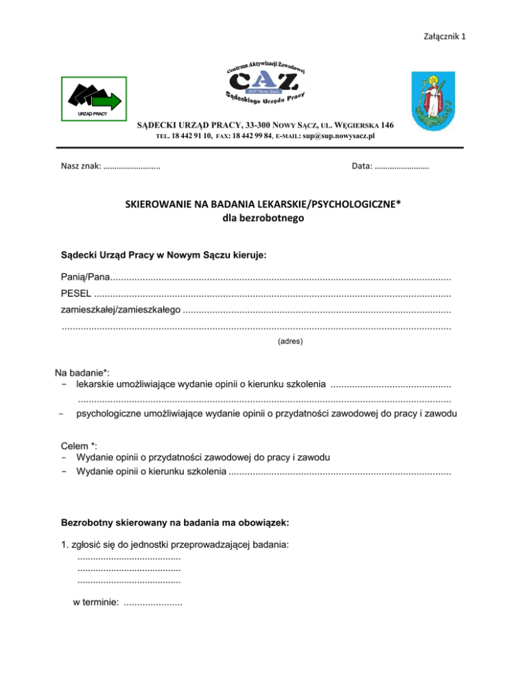 Załącznik 1 URZĄD PRACY SĄDECKI URZĄD PRACY, 33-300 NOWY SĄCZ, UL. WĘGIERSKA 146 TEL. 18 442 91 10, FAX: 18 442 99 84, E-MAIL: [email protected] Nasz znak: …………………….. Data: ……………………. SKIEROWANIE NA BADANIA LEKARSKIE/PSYCHOLOGICZNE* dla bezrobotnego Sądecki Urząd Pracy w Nowym Sączu kieruje: Panią/Pana............................................................................................................................... PESEL ..................................................................................................................................... zamieszkałej/zamieszkałego .................................................................................................... ................................................................................................................................................. (adres) Na badanie*: - lekarskie umożliwiające wydanie opinii o kierunku szkolenia ............................................. ........................................................................................................................................... - psychologiczne umożliwiające wydanie opinii o przydatności zawodowej do pracy i zawodu Celem *: - Wydanie opinii o przydatności zawodowej do pracy i zawodu - Wydanie opinii o kierunku szkolenia ................................................................................... Bezrobotny skierowany na badania ma obowiązek: 1. zgłosić się do jednostki przeprowadzającej badania: ........................................ ........................................ ........................................ w terminie: ...................... Załącznik 1 2. poddać się badaniom lekarskim lub psychologicznym mającym na celu ustalenie zdolności do pracy lub udziału w innej formie pomocy określonej w ustawie - nieuzasadniona odmowa skutkuje utratą statusu bezrobotnego, na okres: a) 120 dni w przypadku pierwszej odmowy, b) 180 dni w przypadku drugiej odmowy, c) 270 dni w przypadku trzeciej i każdej kolejnej odmowy. 3. zgłosić się do Sądeckiego Urzędu Pracy z opinią dotyczącą przydatności zawodowej do pracy i zawodu albo kierunku szkolenia, sporządzoną na podstawie przeprowadzonych badań w dniu …….....* w celu poinformowania o efektach udzielonej pomocy. 4. w przypadku przerwania badań, w trakcie ich przeprowadzania z własnej winy, zwrócić koszty badań. *niepotrzebne skreślić Podstawa prawna: Art. 2 ust. 3, art. 40 ust. 5 Ustawy o promocji zatrudnienia i instytucjach rynku pracy z dn. 20.04.2004 r. (tekst jednolity Dz. U. z 2013 r. poz. 674 z późn. zm.): Art. 33 ust, 4, pkt. 3 Ustawy o promocji zatrudnienia i instytucjach rynku pracy z dn. 20.04.2004 r. (tekst jednolity Dz. U. z 2013 r. poz. 674 z późn. zm.); Zapoznałem(am) się z informacjami zawartymi w skierowaniu oraz potwierdzam odbiór 2 egzemplarzy (w tym jednego w celu dostarczenia do instytucji prowadzącej badania). ............................................... (data i podpis osoby skierowanej) SUP-RPP-10 ........................................................ (podpis pracownika Urzędu Pracy upoważnionego do wystawiania skierowania)