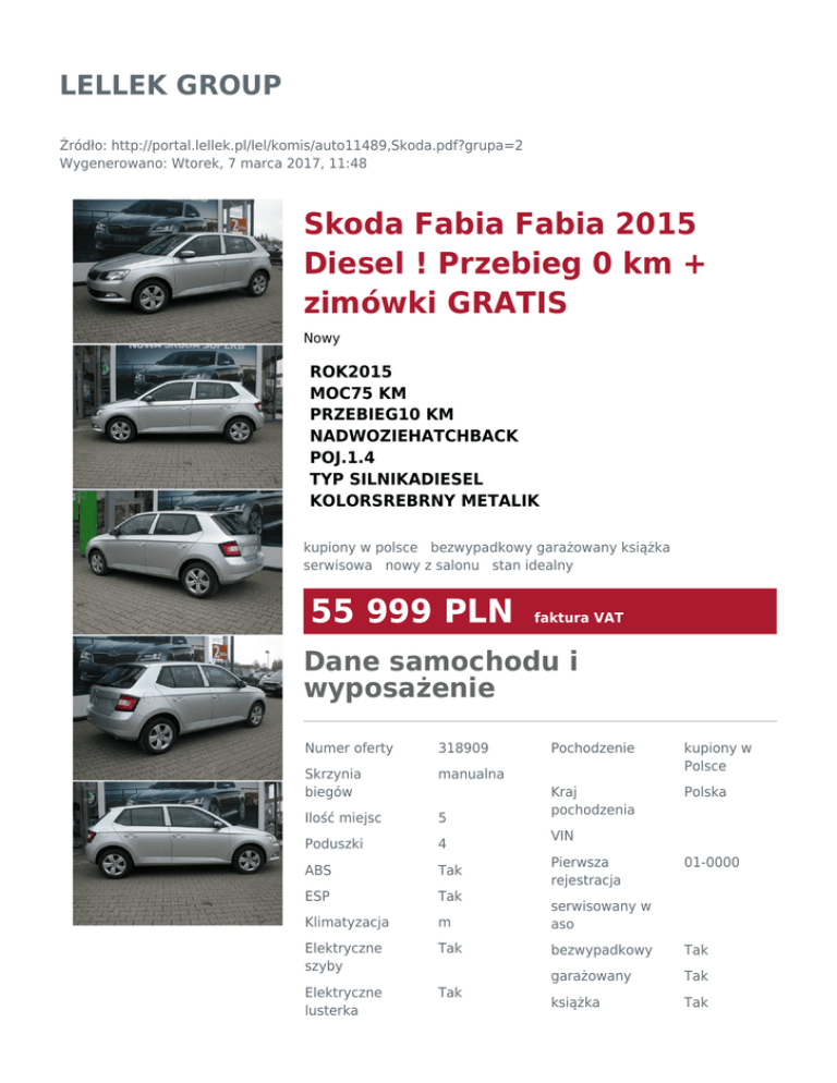 LELLEK GROUP Źródło: http://portal.lellek.pl/lel/komis/auto11489,Skoda.pdf?grupa=2 Wygenerowano: Wtorek, 7 marca 2017, 11:48 Skoda Fabia Fabia 2015 Diesel ! Przebieg 0 km + zimówki GRATIS Nowy ROK2015 MOC75 KM PRZEBIEG10 KM NADWOZIEHATCHBACK POJ.1.4 TYP SILNIKADIESEL KOLORSREBRNY METALIK kupiony w polsce bezwypadkowy garażowany książka serwisowa nowy z salonu stan idealny 55 999 PLN faktura VAT Dane samochodu i wyposażenie Numer oferty 318909 Pochodzenie kupiony w Polsce Skrzynia biegów manualna Kraj pochodzenia Polska Ilość miejsc 5 Poduszki 4 ABS Tak ESP Tak Klimatyzacja m serwisowany w aso Elektryczne szyby Tak bezwypadkowy Tak garażowany Tak Elektryczne lusterka Tak książka Tak VIN Pierwsza rejestracja 01-0000 serwisowa Wspomaganie kierownicy Tak Komputer Tak Radioodtwarza cz Tak Immobilizer Tak homologacja Centralny zamek Tak stan idealny Światła przeciwmgieln e Tak właściciel niepalący Czujniki parkowania Tak Kierownica wielofunkcyjna Tak Alufelgi 15" Miejsce postoju Auto Centrum Kędzierzyn-K oźle I właściciel kupiony w salonie tunning Tak Opis dodatkowy Samochód nowy z WYPRZEDAŻY ROCZNIKA 2015 ! Samochód został zarejestrowany w dniu 30.08.2016. Samochód jest nowy. Do samochodu są nowe dodatkowe koła zimowe na felgach stalowych - Gratis !!! Wersja Ambition 1.4 TDI 75 KM Ambition + Pakiet Mixx + Pakiet Audio Na wyposażeniu samochodu w zakresie bezpieczeństwa, funkcjonalności i komfortu znajduje się: ACS – system pokolizyjny Climatic - klimatyzacja manualna Dezaktywacja czołowej poduszki powietrznej pasażera z przodu ESP z ABS, MSR, ASR, EDL, HBA Elektromechaniczne wspomaganie kierownicy Elektrycznie sterowane i ogrzewane lusterka zewnętrzne Elektrycznie sterowane szyby przednie Fotel kierowcy z regulacją wysokości Funkcja Start-Stop i odzyskiwania energii Immobiliser Kierunkowskazy zintegrowane z lusterkami bocznymi Komputer pokładowy Kurtyny powietrzne MULTICOLLISION BRAKE- hamulec antykolozyjny Handlowiec Roman Wołyński +48 77 540 11 34 zapytaj mobile +48 576 277 448 Charakterystyka spalania cykl miejski 4.1 l/100km cykl pozamiejski 3.4 l/100km cykl mieszany 3.6 l/100km emisja CO2 95 g/km Gwarancja mechaniczna 24 miesięcy perforacja nadwozia 144 miesięcy Ubezpieczenie Ubezpieczenie dostępne Ogrzewana szyba tylna Podpowiedź zmiany biegu Poduszki powietrzne czołowe i boczne kierowcy i pasażera z przodu Przednie światła przeciwmgielne Radio Swing (kolorowy ekran dotykowy 5”, AM/FM, RDS FM, wejście SD, USB, AUX-in) Reflektory halogenowe Regulowana w dwóch płaszczyznach kolumna kierownicy Schowek na okulary Schowek przed pasażerem z przodu – oświetlony, z miejscem na butelkę 1,0l Siedzisko tylnej kanapy niedzielone, oparcie składane i dzielone Skrobaczka do szyb w pokrywie wlewu paliwa Stylistyka wnętrza – Ambition Światła do jazdy dziennej Day Light TPM - system kontroli ciśnienia w oponach Trzecie światło stopu Tylne światło przeciwmgielne Uchwyt na kwity parkingowe Uchwyty ISOFIX na zewnętrznych miejscach kanapy tylnej XDS + elektroniczna blokada mechanizmu różnicowego Zdalnie sterowany centralny zamek (2 składane kluczyki) Pakiet Chrom (chromowane klamki wewnętrzne, ramki bocznych nawiewów powietrza, przycisk dźwigni hamulca ręcznego oraz elementy kontrolne nawiewów powietrza) Lusterka i klamki zewnętrzne lakierowane w kolorze nadwozia Ponadto samochód doposażony jest w: Pakiet AUDIO który zawiera: Zestaw GSM Bluetooth Wyświetlacz Maxi-dot Škoda Surround, 2 dodatkowe głośniki z tyłu Wielofunkcyjna trójramienna skórzana kierownica obsługująca radio i telefon Pakiet MIXX który zawiera: Obręcze kół ze stopw lekkich MATO 6Jx15" Czujniki parkowania z tyłu POSIADAMY NA NASZYM MAGAZYNIE DUŻO INNYCH MODELI MARKI ŠKODA Szczegółowe informacje dotyczące oferowanego pojazdu pod nr tel: stacjonarny: 77 540 11 34 komórkowy: 576 277 448 Kredyt Kredyt dostępny Polecamy Państwu również szeroką gamę akcesoriów: - Autoalarmy - Blokady Skrzyni Biegów - Zestawy głośnomówiące - Foteliki dziecięce - i wiele innych Informacja nie stanowi oferty w rozumieniu art.66kc. Podane dane maja charakter wyłącznie informacyjny. ZAPIS TEN ZOSTAŁ ZAWARTY ZE WZGLĘDU NA MOŻLIWOŚĆ NIE ZAMIERZONYCH POMYŁEK Nota prawna Zeskanuj kod, aby zobaczyć ofertę online Informacja nie stanowi oferty w rozumieniu art. 66 Kodeksu Cywilnego. Podane dane mają charakter wyłącznie informacyjny. Pełna informacja dostępna jest u handlowca. Sprzedający nie odpowiada za ewentualne błędy lub nieaktualność ogłoszenia.