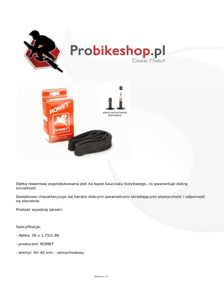 Dętka rowerowa wyprodukowana jest na bazie kauczuku butylowego, co gwarantuje dobrą szczelność. Dodatkowo charakteryzuje się bardzo dobrymi parametrami określającymi elastyczność i odporność na starzenie. Produkt wysokiej jakości. Specyfikacja: - dętka: 26 x 1,75/1,90 - producent: ROMET - wentyl: AV 40 mm - samochodowy Strona 1 z 2 Strona 2 z 2