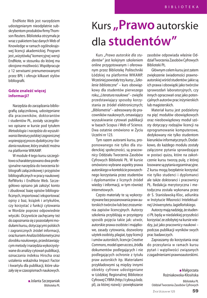 B I B L I O T E K A EndNote Web jest narzędziem udostępnianym nieodpłatnie subskrybentom produktów firmy Thomson Reuters. Biblioteka otrzymała je wraz z pakietem baz danych Web of Knowledge w ramach ogólnokrajowej licencji akademickiej. Program jest „wizytówką” komercyjnej wersji EndNote, w stosunku do której ma okrojone możliwości. Współpracuje z 12 serwisami prenumerowanymi przez BPŁ i oferuje kilkaset stylów bibliografii. Gdzie znaleźć więcej informacji? Narzędzia do zarządzania bibliografią załącznikową, udostępniane dla pracowników, doktorantów i studentów PŁ, zostały szczegółowo opisane w kursie pod tytułem Metodologia i narzędzia do wyszukiwania literatury polskiej i zagranicznej wspierającej proces dydaktyczny i badania naukowe, który znaleźć można na platformie WIKAMP. W module 4 tego kursu szczegółowo scharakteryzowano dwa profesjonalne narzędzia do tworzenia bibliografii załącznikowej i przypisów bibliograficznych w pracy naukowej: RefWorks i EndNote Web. Szczegółowo opisano jak założyć konto i zbudować bazę opisów bibliograficznych, importować i eksportować opisy z baz, książek i artykułów, czy korzystać z funkcji cytowania w Wordzie poprzez odpowiednie wtyczki. Oczywiście zachęcamy też do zapoznania się z pozostałymi modułami kursu, dotyczącymi polskich i zagranicznych źródeł informacji, oraz kursem Analiza bibliometryczna dorobku naukowego, przedstawiającym metody i narzędzia wykorzystywane do analizy cytowań publikacji, oznaczania indeksu Hirscha oraz ustalenia wskaźnika Impact Factor i kwartylu dla publikacji, które ukazały się w czasopismach naukowych. n Jolanta Szczepaniak Biblioteka PŁ Kurs „Prawo autorskie dla studentów” Kurs „Prawo autorskie dla studentów” jest kolejnym szkoleniem online przygotowanym i oferowanym przez Bibliotekę Politechniki Łódzkiej na platformie WIKAMP. Wcześniej powstały trzy kursy: „Szkolenie biblioteczne” – kurs obowiązkowy dla studentów pierwszego roku; „Literatura naukowa” – zwięźle przedstawiający sposoby korzystania ze źródeł elektronicznych; „Bibliometria” – adresowany do pracowników naukowych, omawiający wyszukiwanie cytowań publikacji w bazach Scopus i Web of Science. Dwa ostatnie omówiono w Życiu Uczelni nr 123. Tym razem autorami kursu, proponowanego nie tylko dla studenckiej społeczności, są pracownicy Oddziału Tworzenia Zasobów Cyfrowych Biblioteki PŁ. W kursie omówiono wybrane aspekty prawa autorskiego w kontekście powszechnego korzystania przez studentów i dyplomantów z licznych źródeł wiedzy i informacji, w tym również internetowych. Często materiały te są wykorzystywane bez poszanowania praw autorskich twórców lub bez zrozumienia zapisów licencyjnych. Autorzy szkolenia przybliżają w przystępny sposób pojęcia takie jak: utwór, autorskie prawa osobiste i majątkowe, zasady cytowania, dozwolony użytek osobisty, plagiat, typy licencji i umów autorskich, licencje Creative Commons, model open access, źródła dokumentów podlegających i nie podlegających ochronie z tytułu praw autorskich itp. Materiałami przykładowymi są między innymi obiekty cyfrowe udostępniane w Łódzkiej Regionalnej Bibliotece Cyfrowej CYBRA (http://cybra.p.lodz. pl), za której rozwój i powiększanie zasobów odpowiada właśnie Oddział Tworzenia Zasobów Cyfrowych Biblioteki PŁ. Głównym celem kursu jest zatem zwiększenie świadomości prawnoautorskiej wśród studentów: jakie są ich prawa i obowiązki jako twórców sprawozdań laboratoryjnych, czy innych opracowań oraz jako potencjalnych autorów prac inżynierskich lub magisterskich. Materiał kursu jest podzielony na pięć modułów obowiązkowych oraz nieobowiązkowy moduł szósty dotyczący rodzajów licencji na oprogramowanie komputerowe, dedykowany nie tylko studentom kierunków informatycznych. Dodatkowo, do każdego modułu zostały załączone pytania sprawdzające w postaci quizu, które na zakończenie kursu tworzą pulę, z której losowane są pytania egzaminacyjne. Z kursu mogą bezpłatnie korzystać nie tylko studenci i dyplomanci ale także doktoranci i pracownicy PŁ. Redakcja merytoryczna i metodyczna została wykonana przez dr S. Stanisławską-Kloc, adiunkta w Instytucie Własności Intelektualnej Uniwersytetu Jagiellońskiego. Autorzy mają nadzieję, że studenci PŁ będą w niedalekiej przyszłości korzystać ze zdobytej na kursie wiedzy, już jako pracownicy naukowi – podczas publikacji wyników swych prac badawczych. Zapraszamy do korzystania oraz do przesyłania w ramach kursu pytań i wątpliwości związanych z zagadnieniami prawnoautorskimi. n Małgorzata Rożniakowska-Kłosińska Biblioteka PŁ Oddział Tworzenia Zasobów Cyfrowych Życie Uczelni nr 125 59